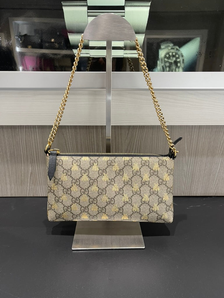 Chic, compact, and effortlessly stylish, this Gucci Wallet on Chain features the iconic GG Supreme canvas adorned with foiled bumblebee...