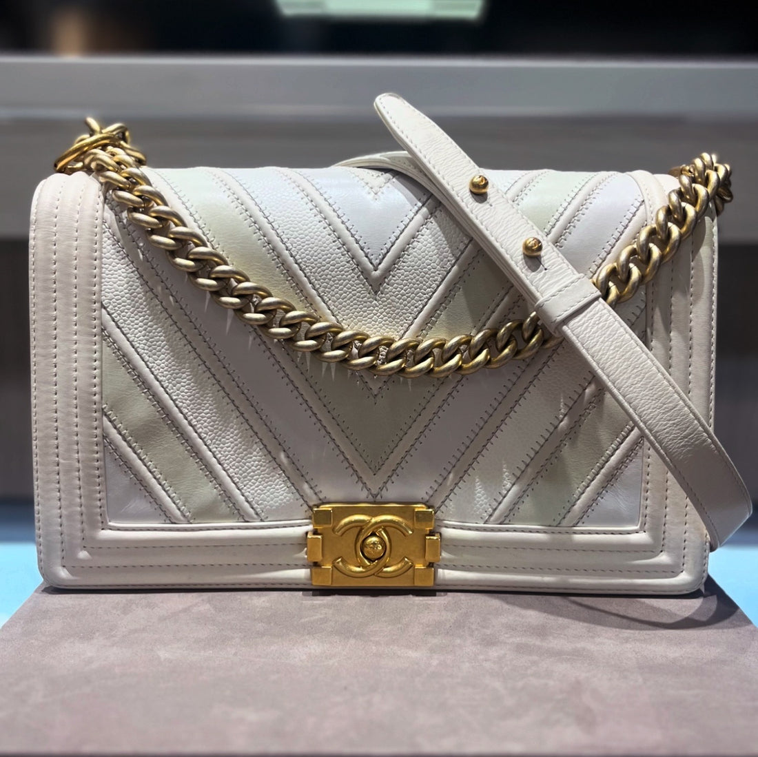 Pre-owned Chanel Boy Flap Bag Chevron Caviar and Calfskin New Medium Antique Gold Hardware (2016 Collection)