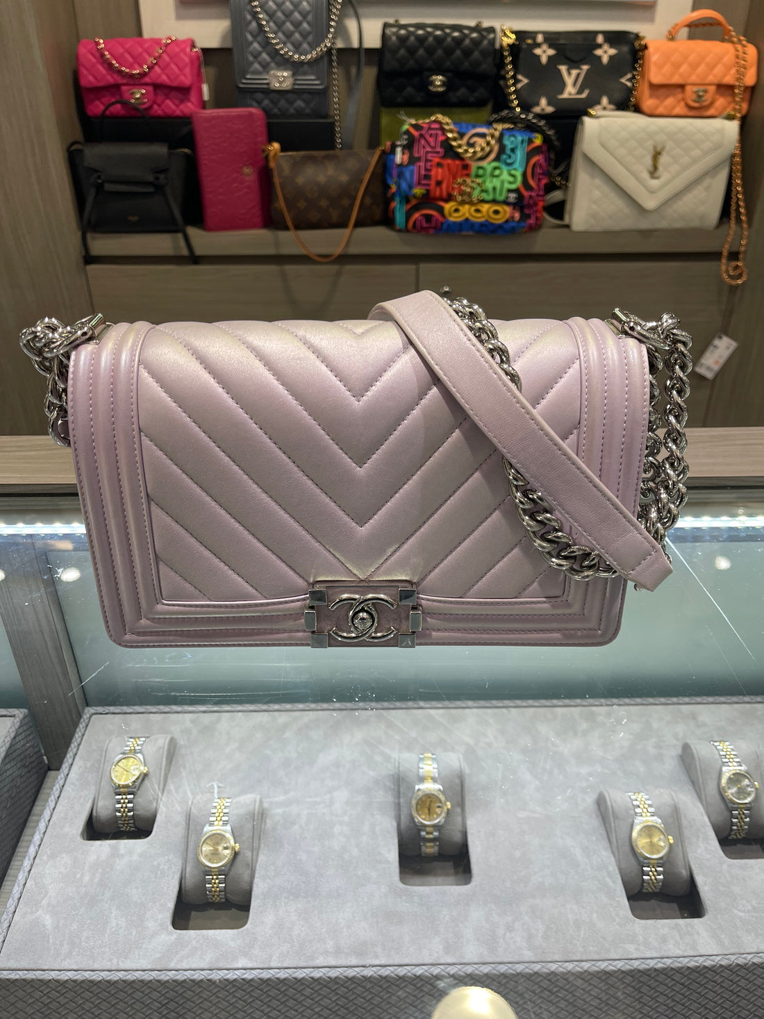 Elevate your collection with this stunning pre-owned CHANEL Caviar Chevron Quilted Boy Flap in a...