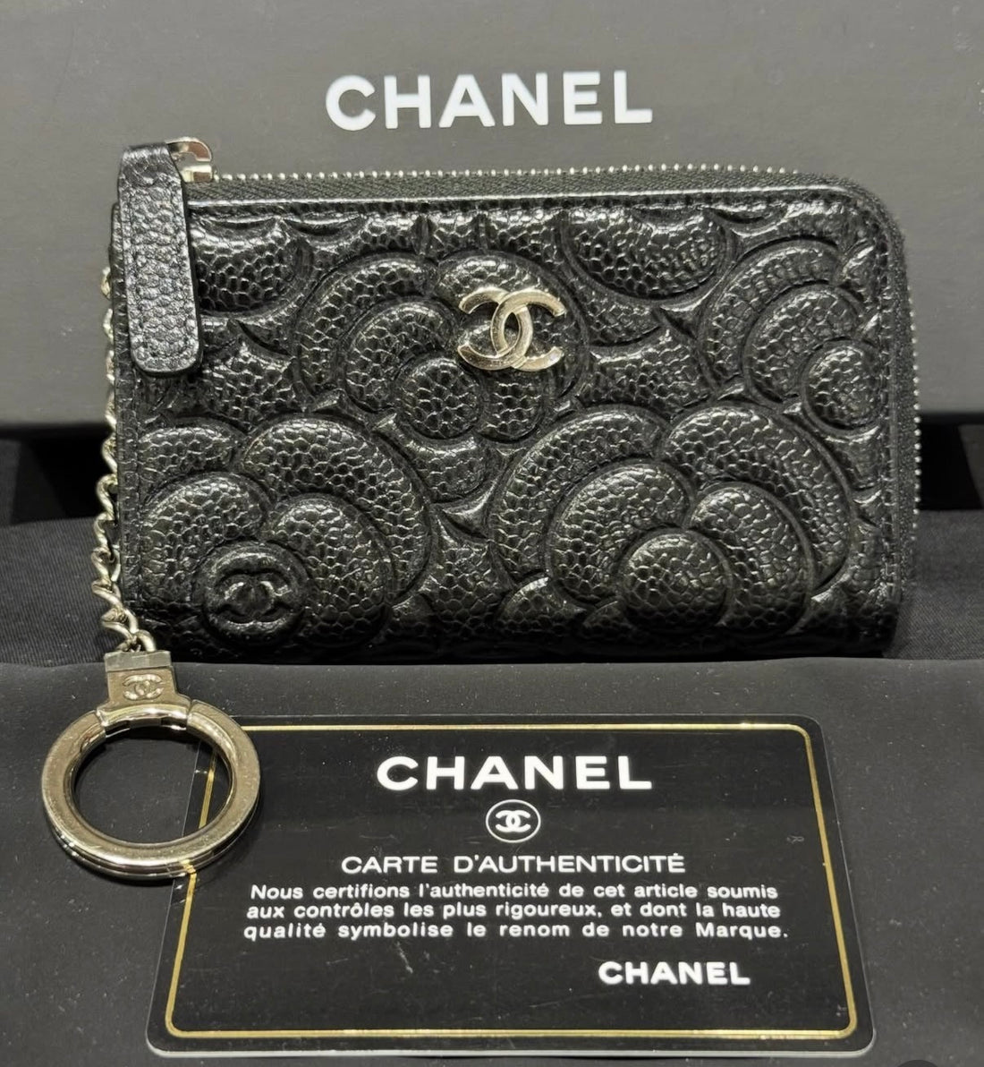 Chanel Black Caviar Camellia Key Pouch Wallet, 2020-2021 collection, complete set