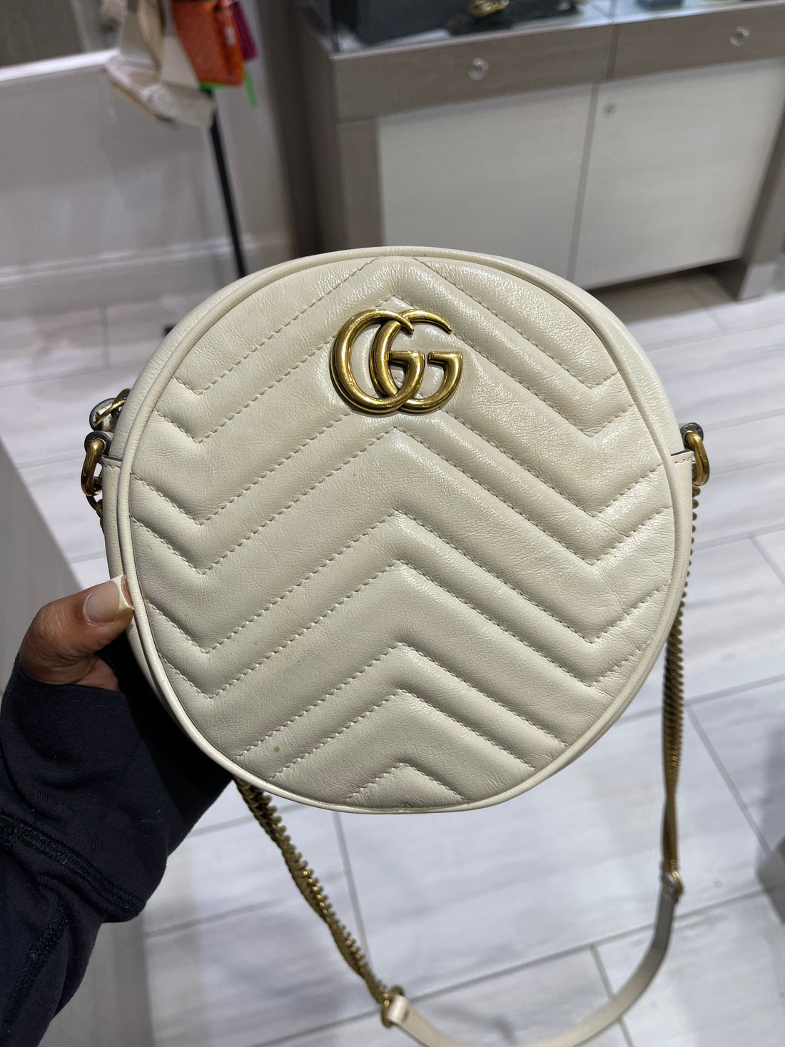 Pre-owned Gucci Ivory leather Round Marmont Crossbody Antique gold hardware Model: 550154