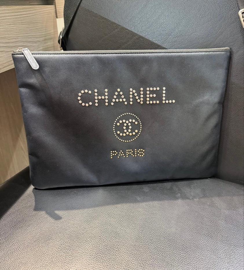 Pre-owned Chanel Deauville Large Black Caviar Studded O-Case Pouch (2018)