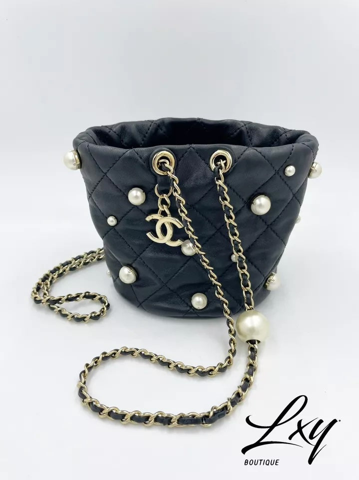 Pre-owned Chanel Mini Bucket Lambskin Quilted Pearl Drawstring Bag Black (2021 Collection)