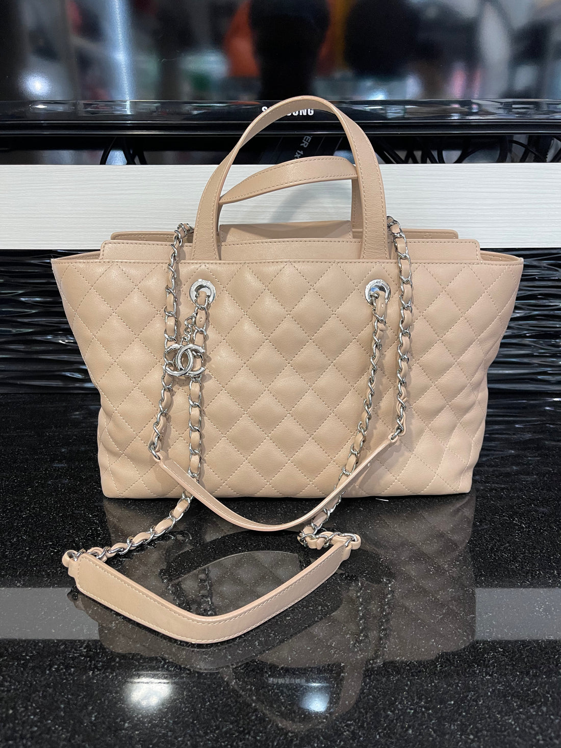 Pre-owned Chanel Tote Quilted Calfskin Medium Beige Tan SHW (2017-2018)