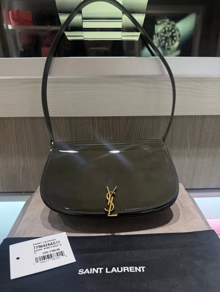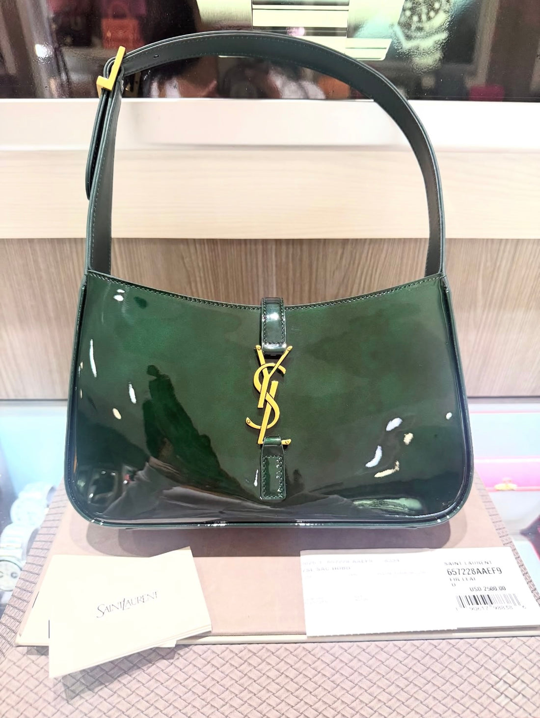 Unworn Saint Laurent Small Le 5 À 7 Patent Leather Shoulder Bag in Fir Leaf (2025)