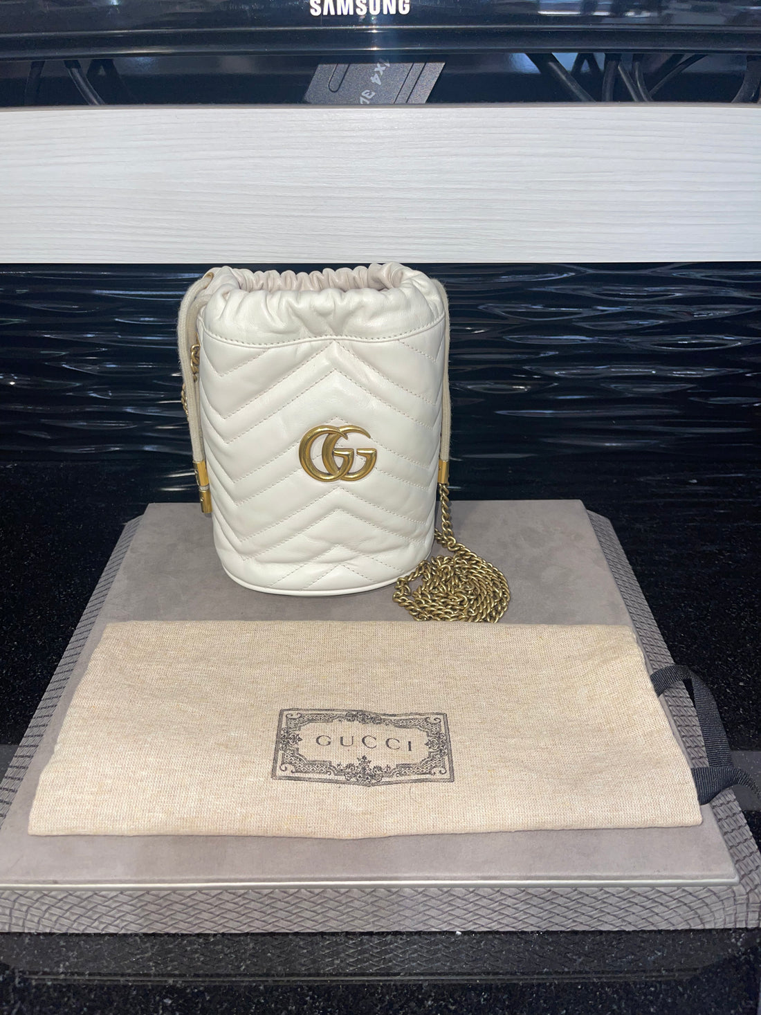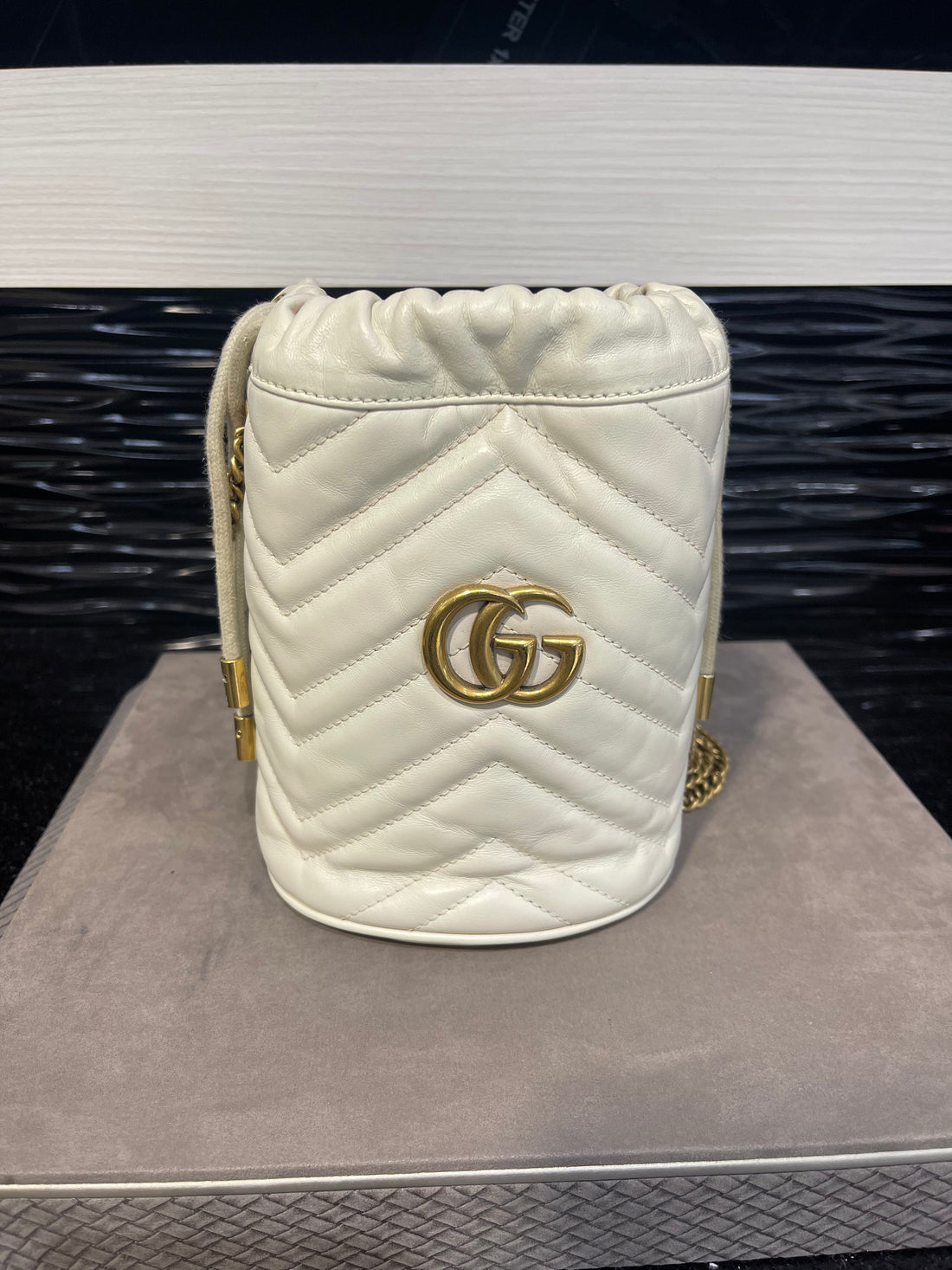 Pre-owned Gucci Marmont Ivory Leather Bucket Drawstring Bag