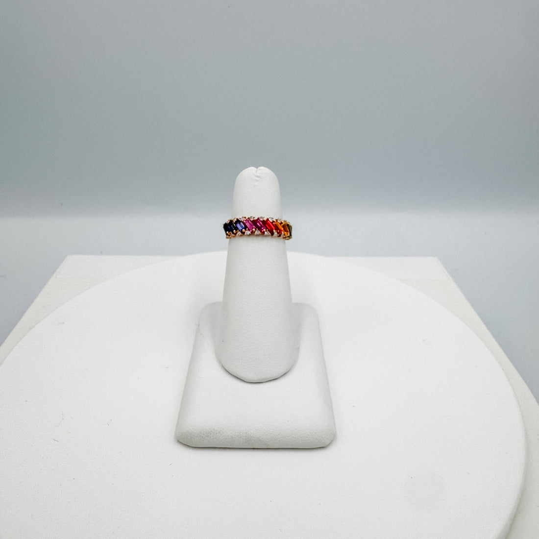Ladies Multi-row Rainbow Sapphire Baguette and Diamond Rose Gold ring size 6.5