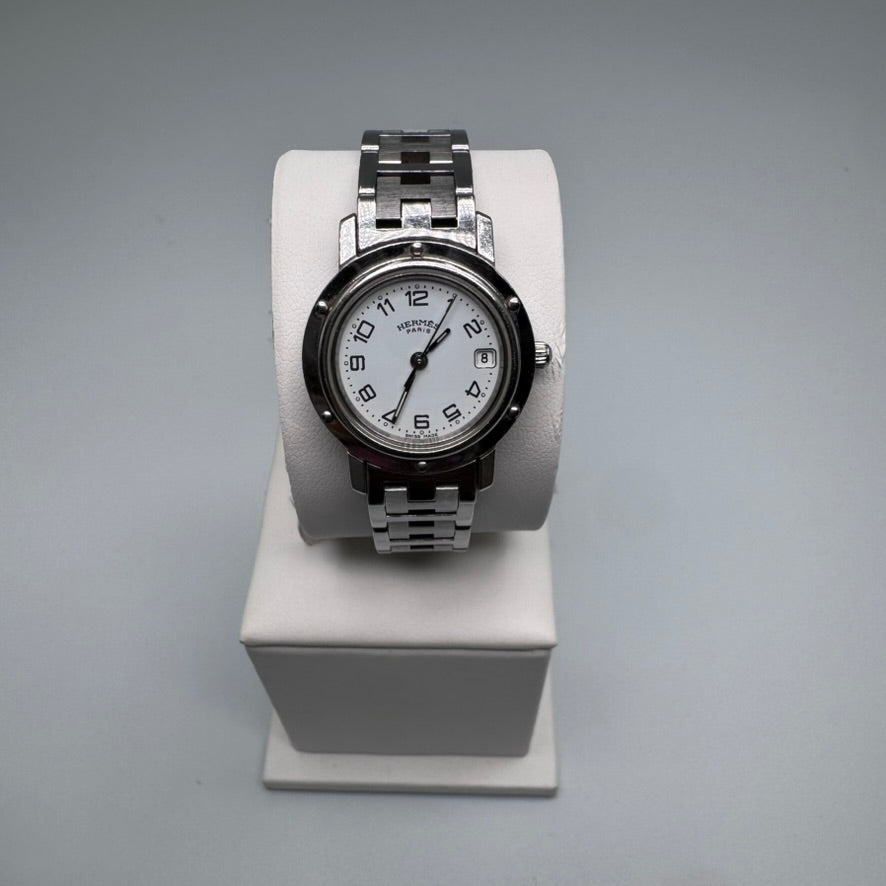 This is an authentic HERMES Stainless Steel 24mm Clipper Quartz Watch White. The watch is...