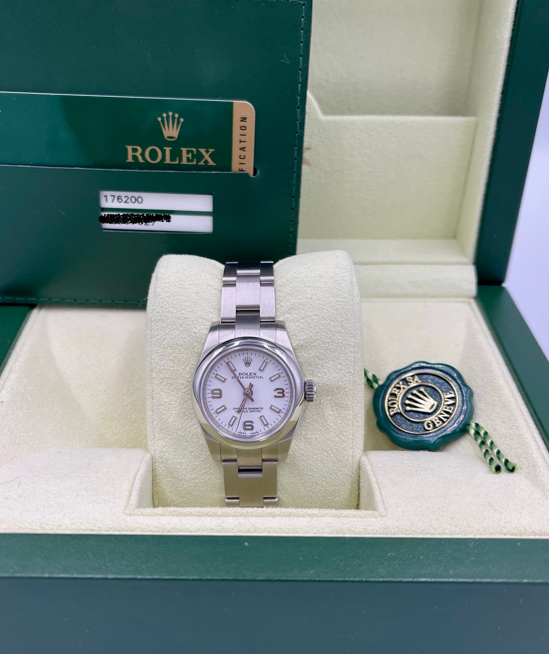 Pre-owned Rolex Oyster Perpetual 26mm Ref. 176200 – White Arabic Dial w/card dated 1-17-2012