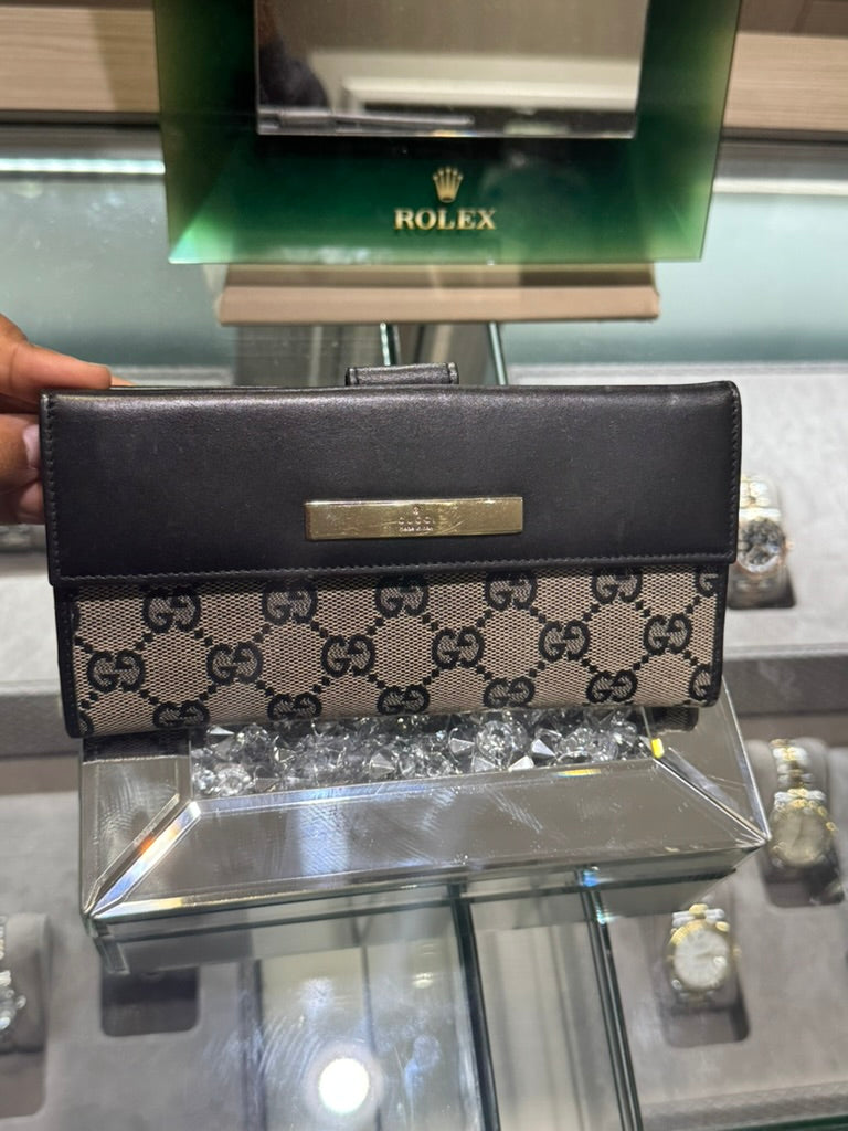 Pre-owned Gucci Bi-fold Long Wallet Canvas & Leather BLACK WITH CANVAS