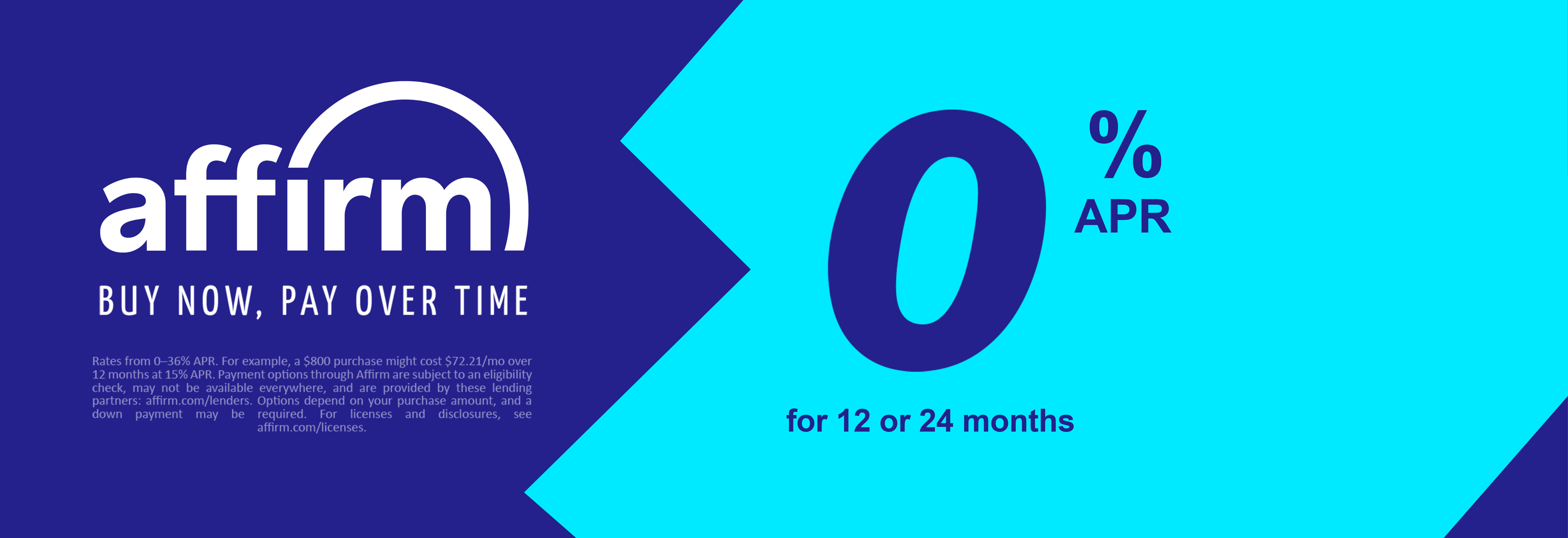 Rates from 0–36% APR. Payment options through Affirm are subject to an eligibility check, may not be available everywhere, and are provided by these lending partners: affim.com/lenders. Options depend on your purchase amount, and a down payment may be required. CA residents: Loans by Affirm Loan Services, LLC are made or arranged pursuant to a California Finance Lenders Law license. For licenses and disclosures, see affirm.com/licenses.