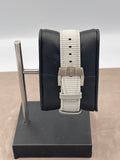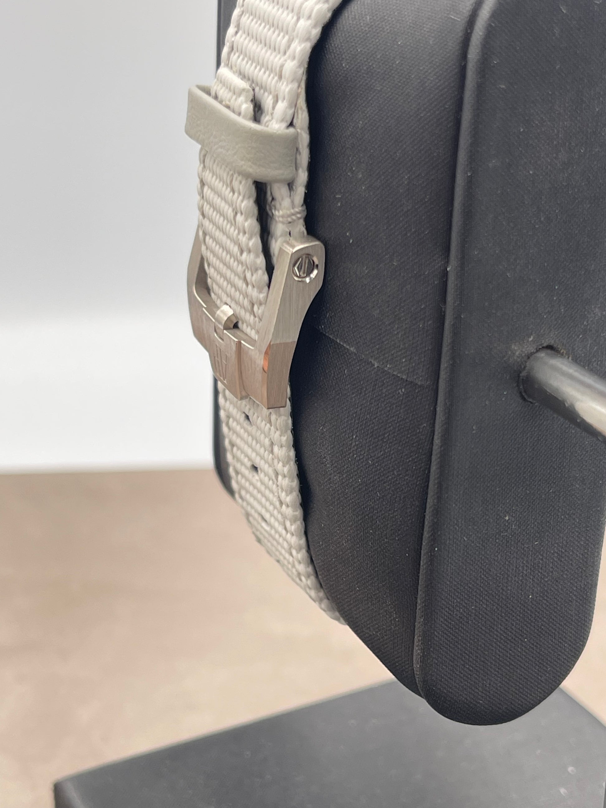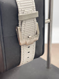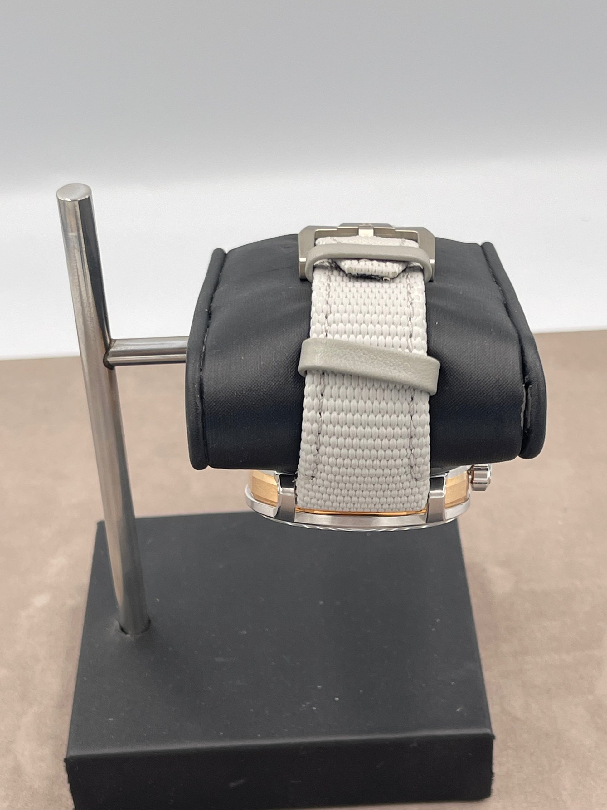 Fitted on a grey textile strap with 18K white gold buckle.