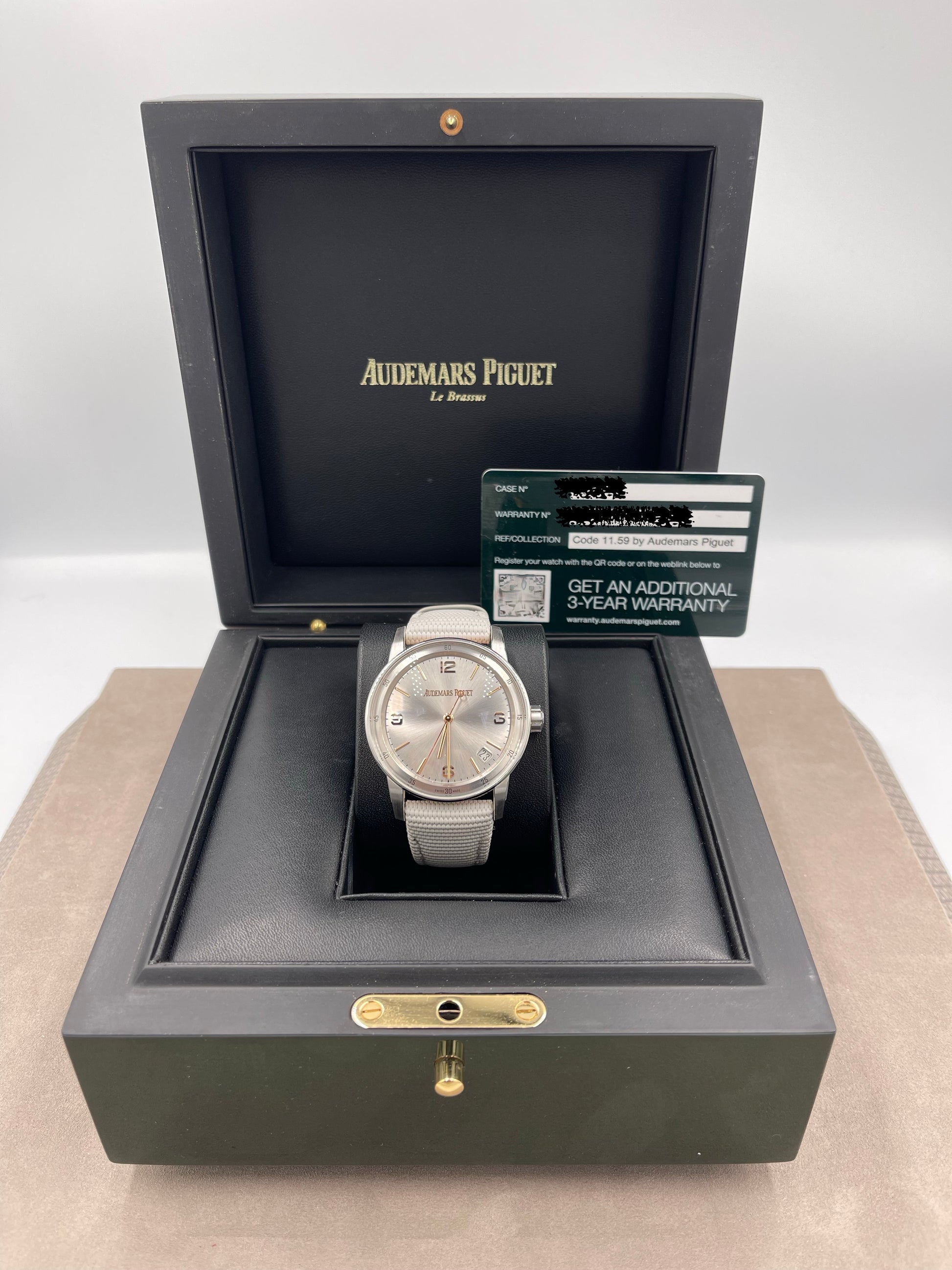 Pre-owned Audemars Piguet CODE 11.59 41mm ref.15210CR Silver Dial 18k White & Rose Gold Grey Strap w/Box & Card (2021)