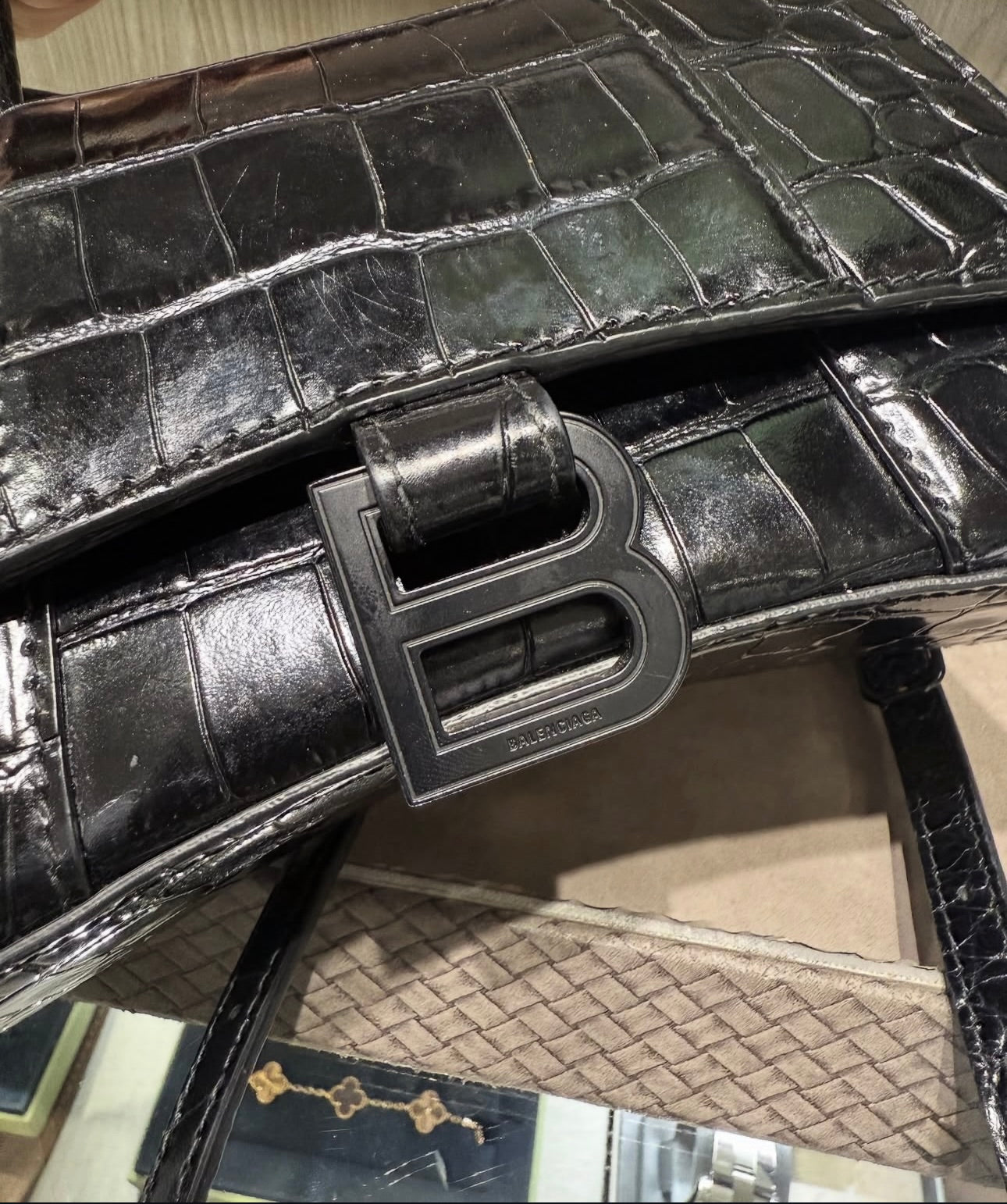 Pre-owned Balenciaga Shiny Calfskin Monochrome Crocodile Embossed Hourglass XS