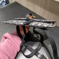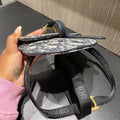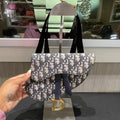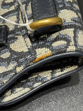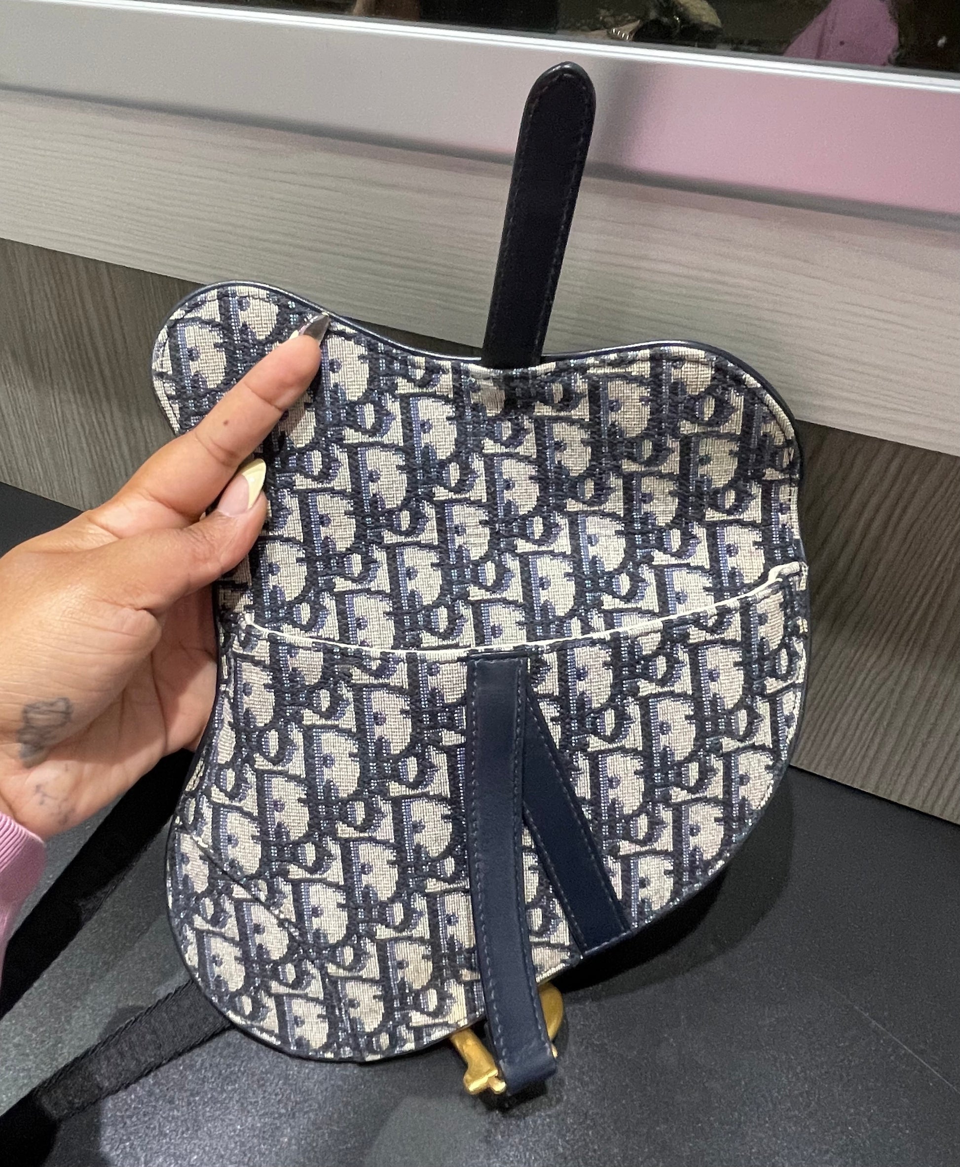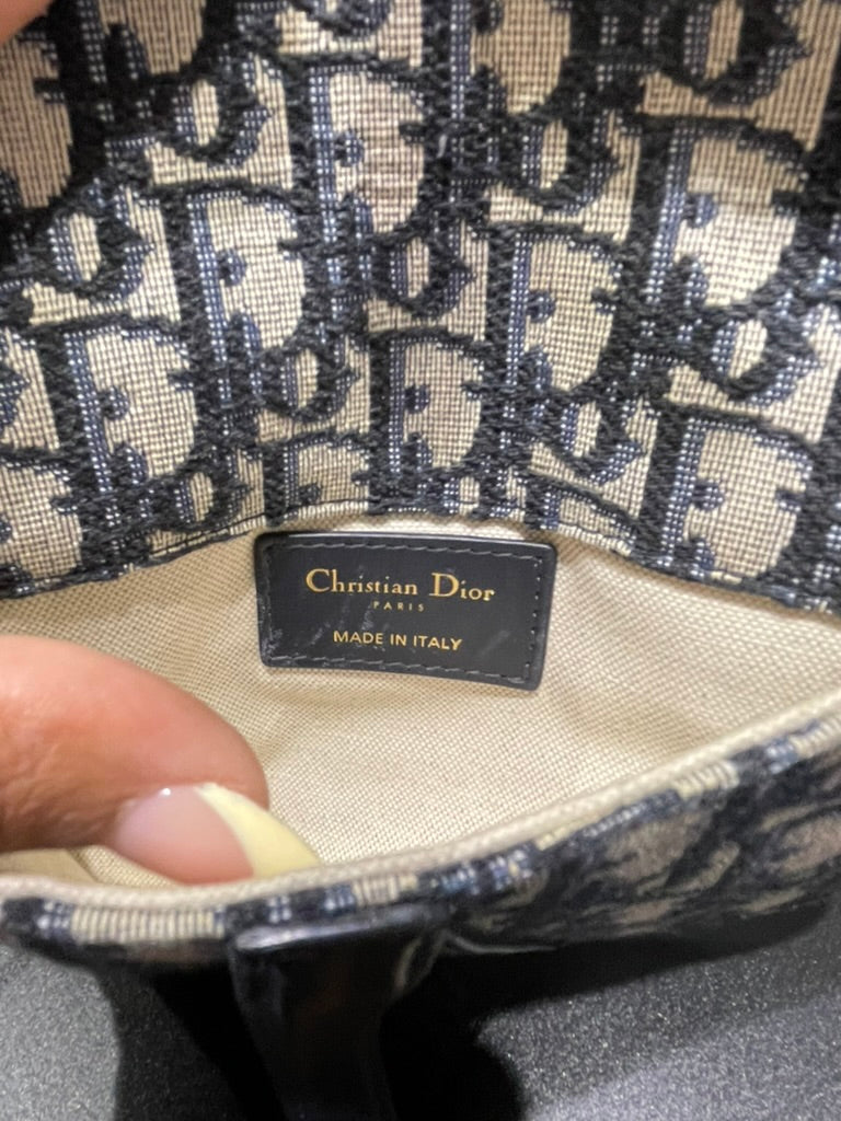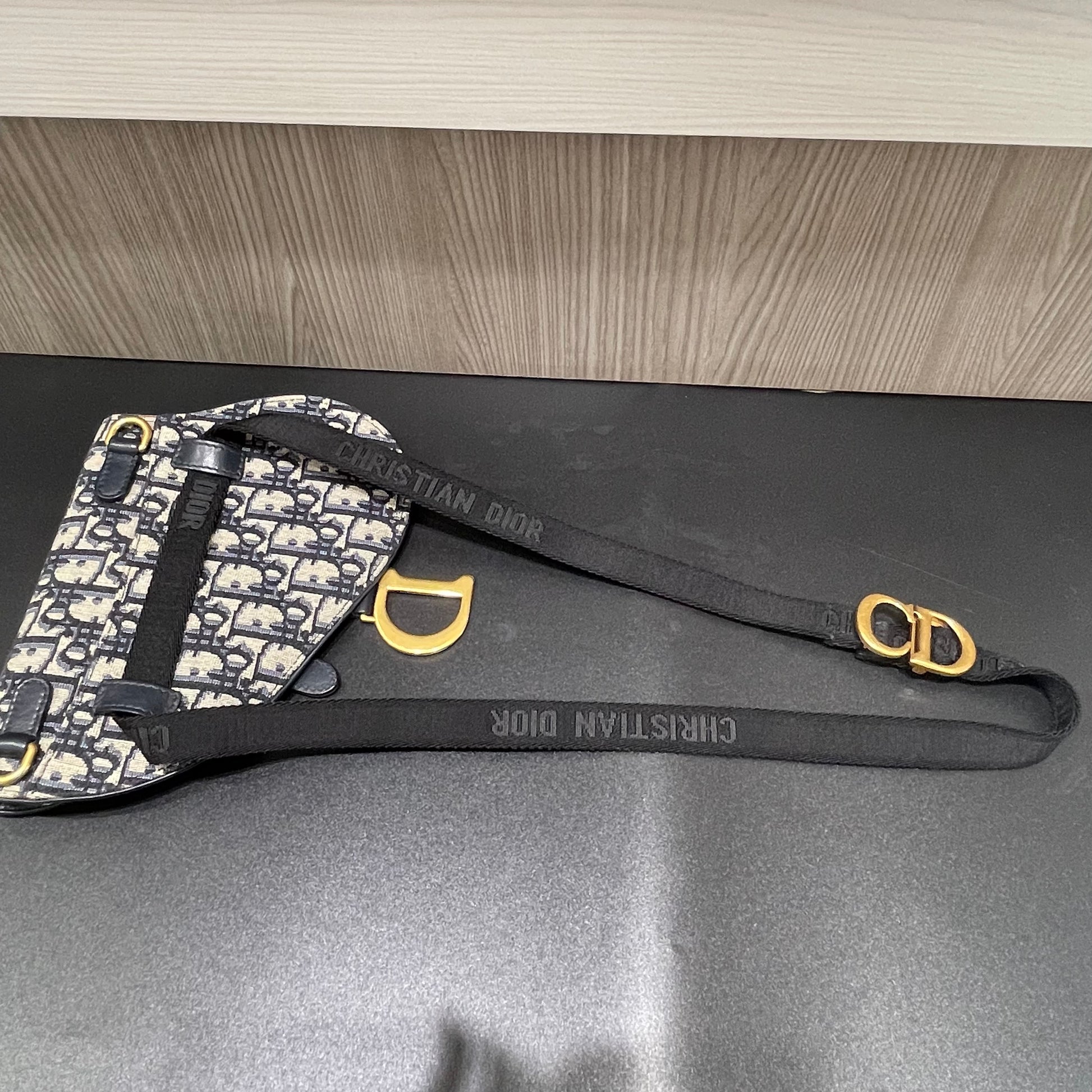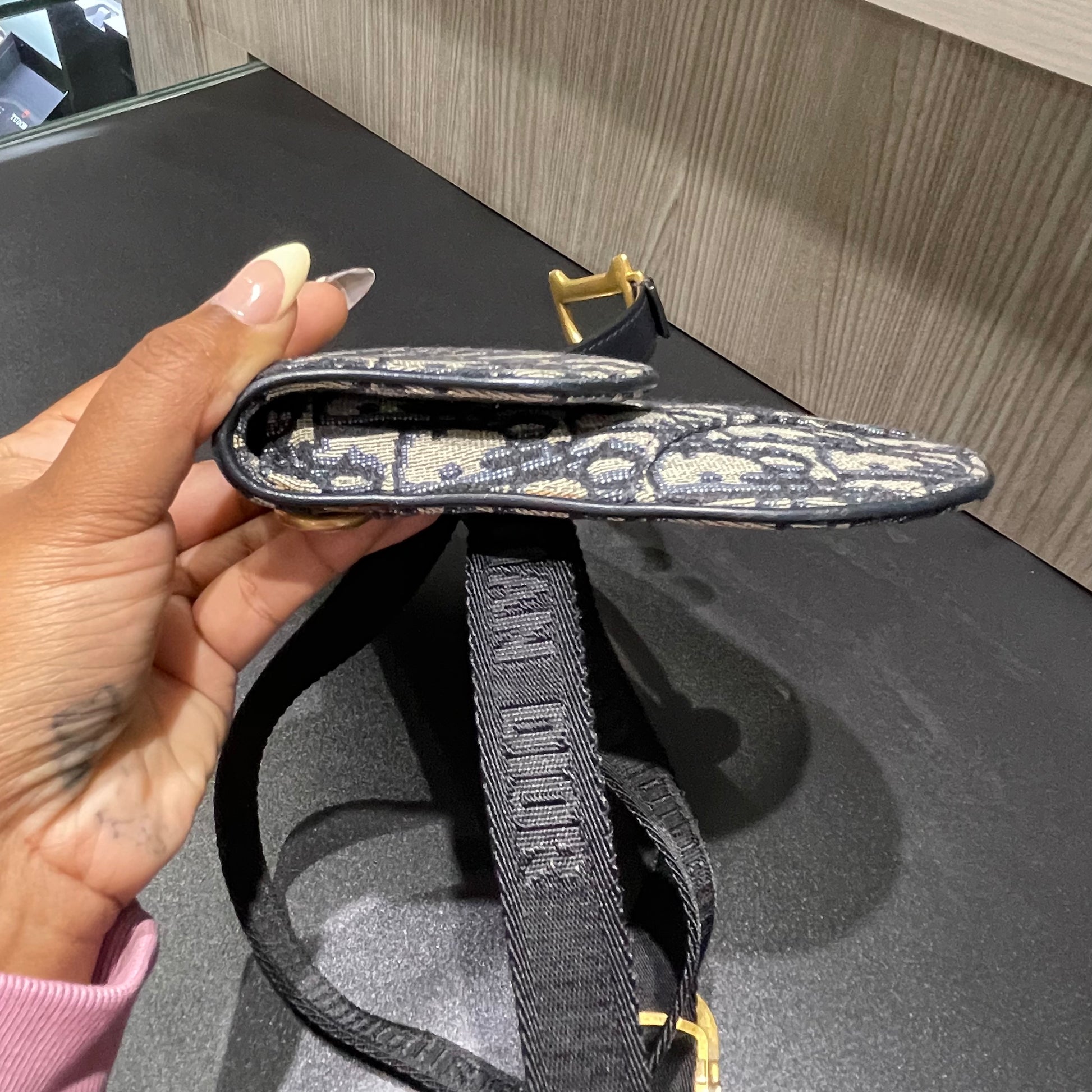 This Christian Dior Oblique Saddle Belt Bag in navy/grey jacquard blends the house’s iconic design with modern versatility. Crafted in signature Dior Oblique canvas with leather trim, the piece features the classic saddle silhouette, an asymmetric flap with snap closure, and the iconic antique gold-finish ‘D’ stirrup charm. The detachable, adjustable strap allows multiple styling options—wear it at the waist, crossbody, over the shoulder, or carry as a clutch.