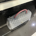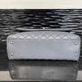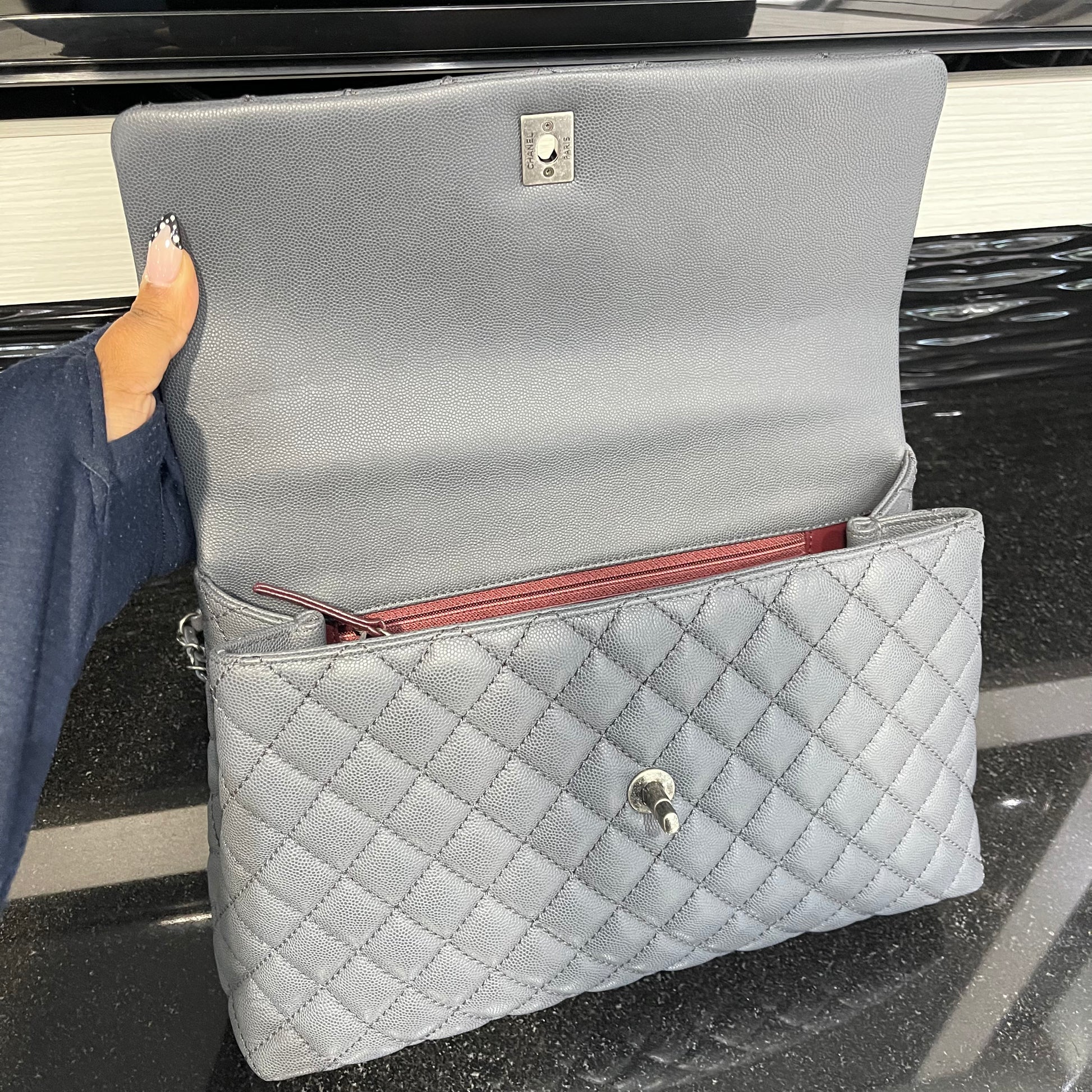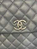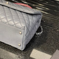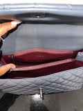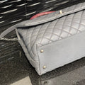 This authentic Chanel Medium Coco Handle Bag from the 2015–2016 Collection by Karl Lagerfeld is a timeless representation of classic Chanel elegance with a contemporary twist. Crafted in grey caviar leather with the signature diamond quilting, this structured top-handle bag features antiqued silver-tone hardware, a lizard-trimmed handle, and the iconic interlocking CC turn-lock closure.