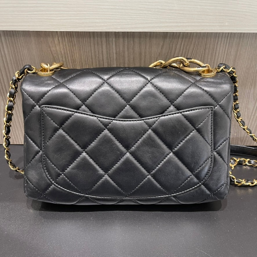 Sophisticated yet effortlessly chic, this Chanel Small Color Match Flap Bag from the 2022 collection is crafted from supple black quilted lambskin leather accented with elegant gold-tone hardware. Designed with timeless Chanel details, it features a chain top handle, a woven chain shoulder strap, a rear open pocket, and the brand’s signature interlocking CC turn-lock closure.