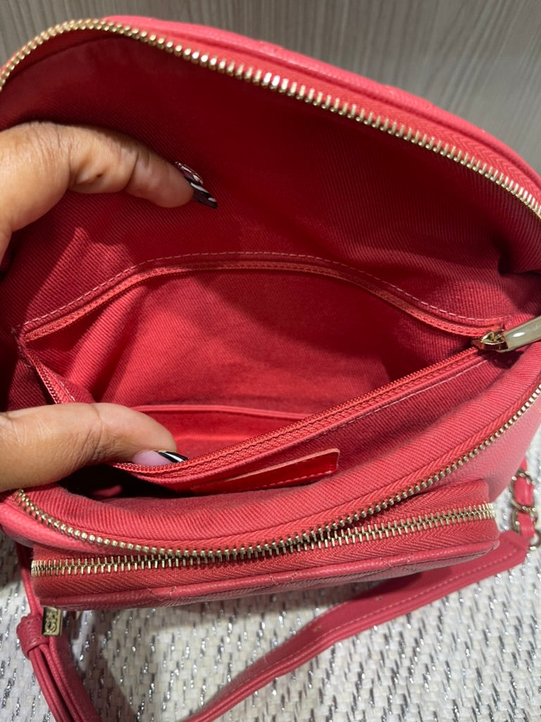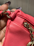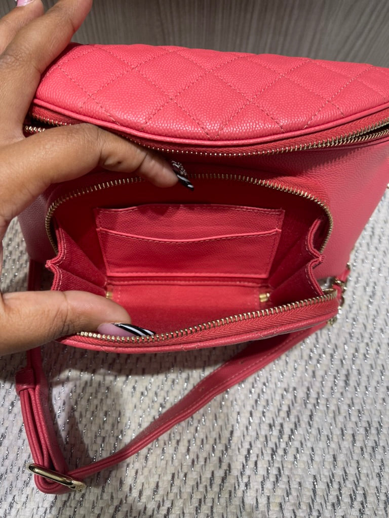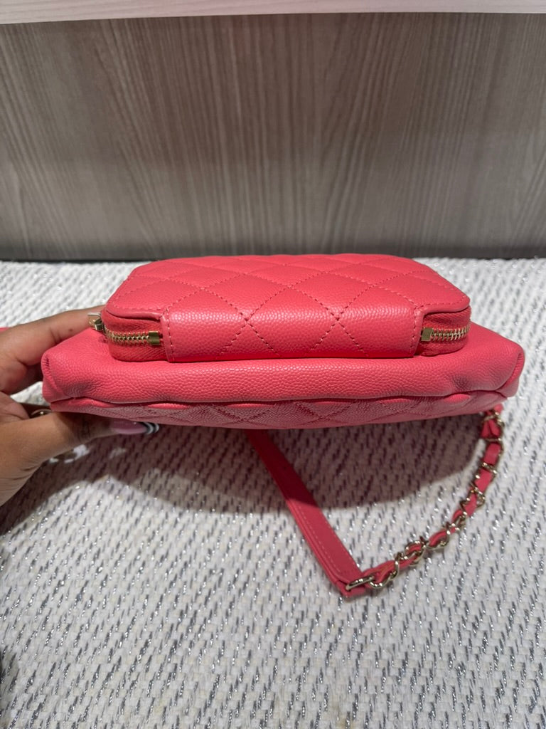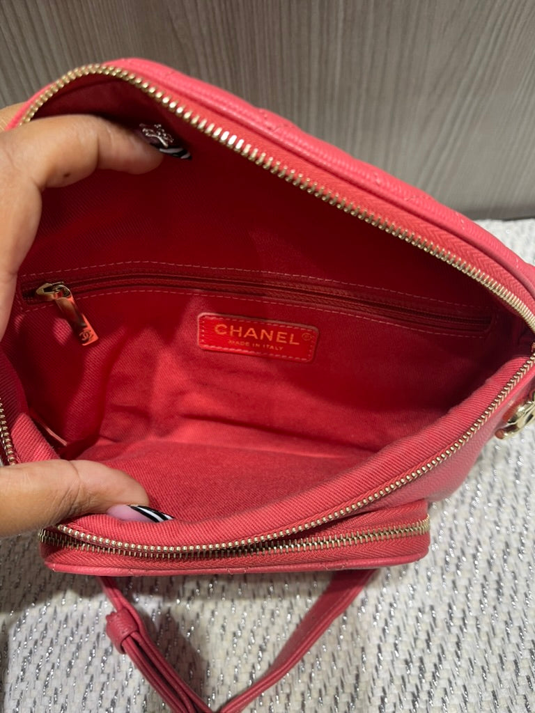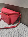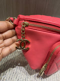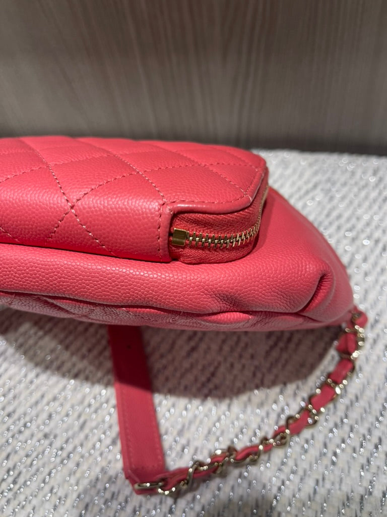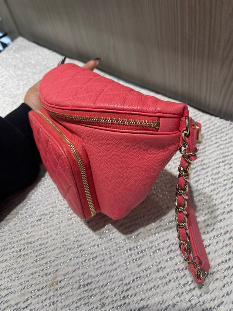 This chic and functional Chanel Business Affinity waist belt bag is crafted from quilted caviar leather in a vibrant coral pink hue. From the 2019 collection by Virginie Viard, this versatile piece blends Chanel’s timeless elegance with a modern, hands-free silhouette, perfect for day-to-night wear.