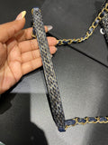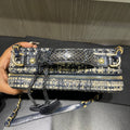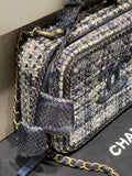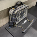 A standout piece from the 2017–2018 Collection by Karl Lagerfeld, this vanity-style silhouette blends luxurious materials with iconic Chanel detailing. The tweed exterior is paired with python accents, an interlocking CC motif, and an elegant chain-link shoulder strap. The top-zip design opens to a leather-lined interior with dual pockets, offering both style and function.