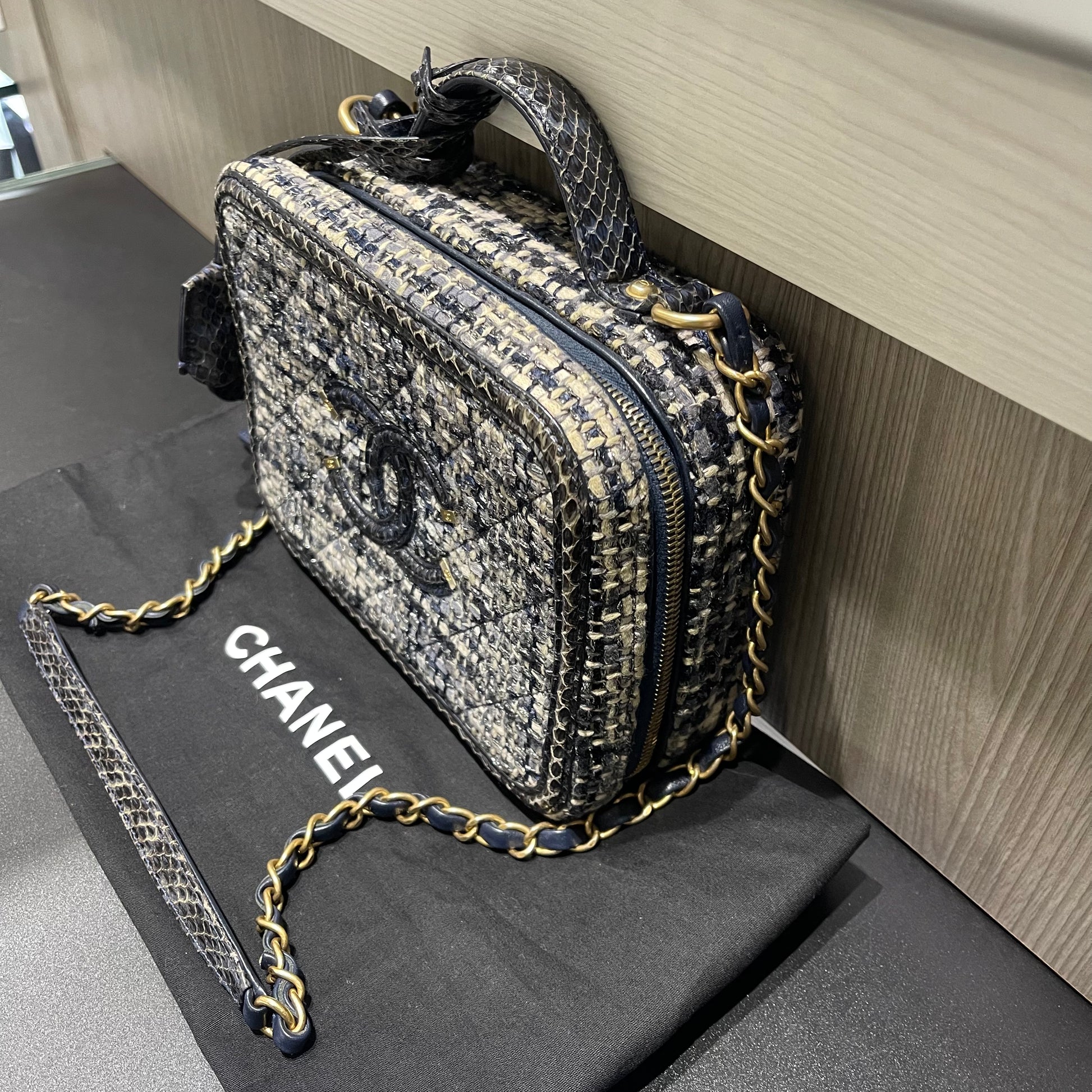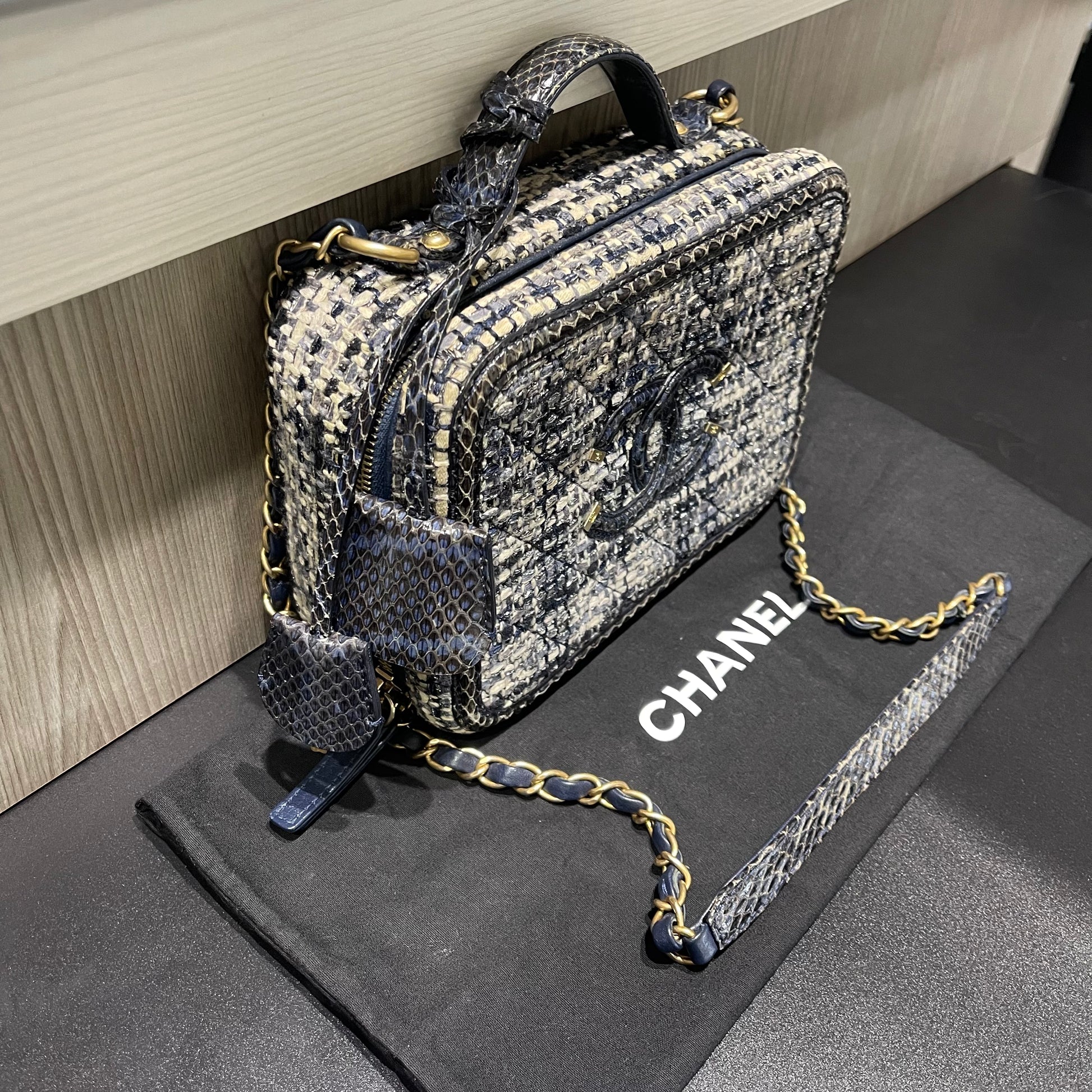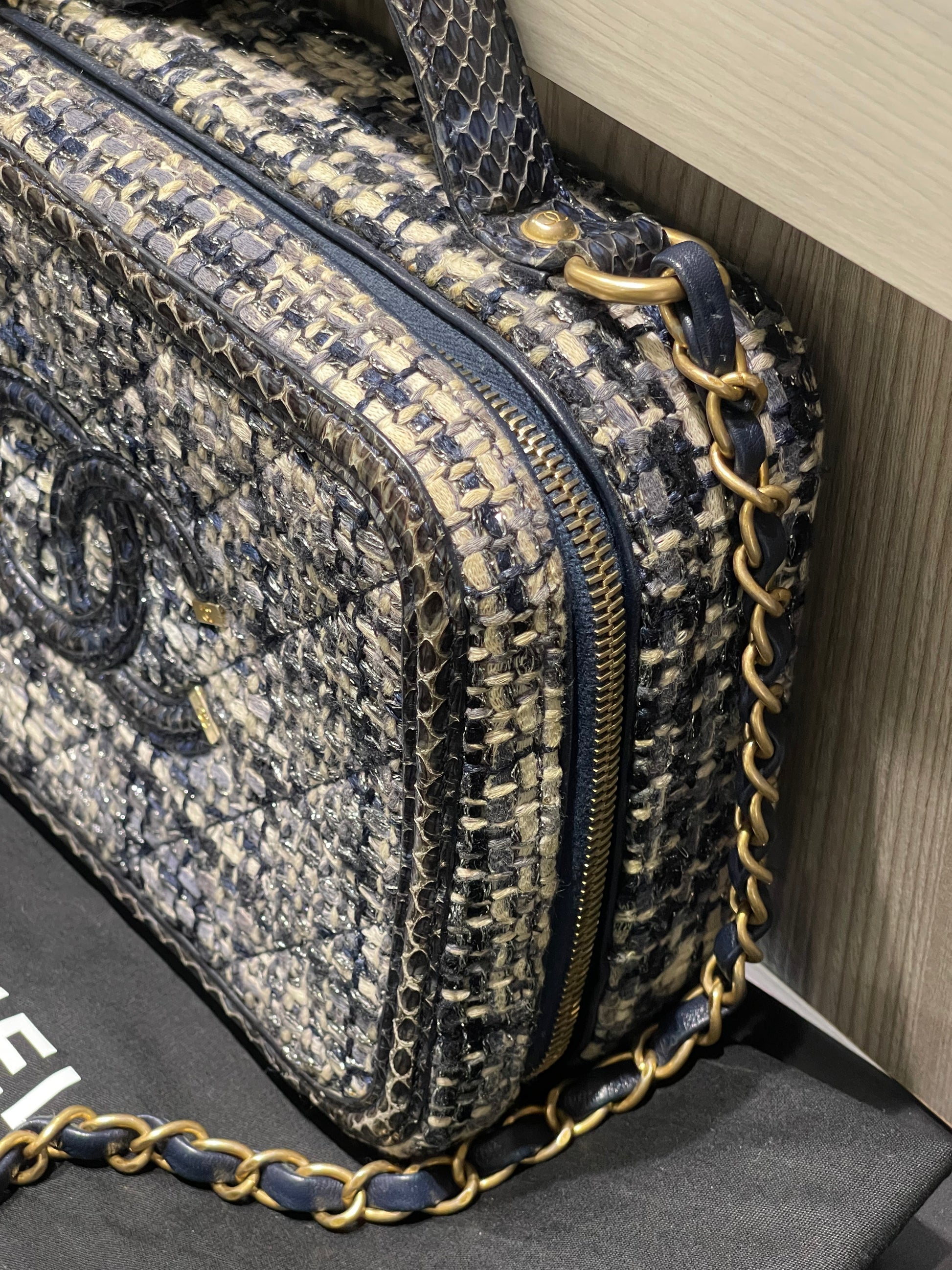 This pre-owned Chanel Medium Vanity Filigree bag in navy tweed and python leather is in very good condition, showing signs of gentle prior use. There are light scratches on the interior and hardware, minor scuffing on the leather trim, some fading/discoloration on the antique gold hardware, and subtle discoloration within areas of the tweed. Overall, the structure and presentation remain beautiful and well-kept.