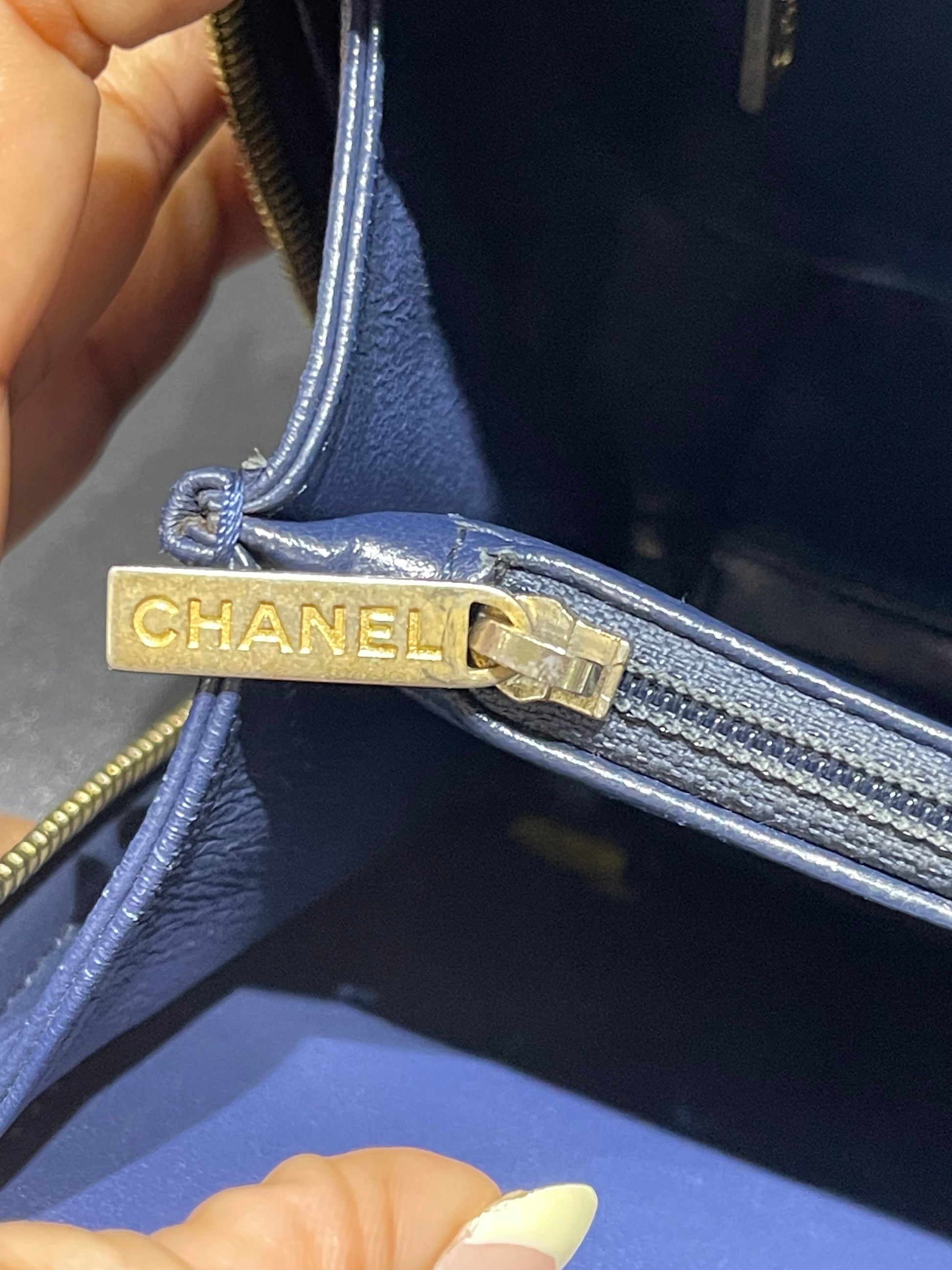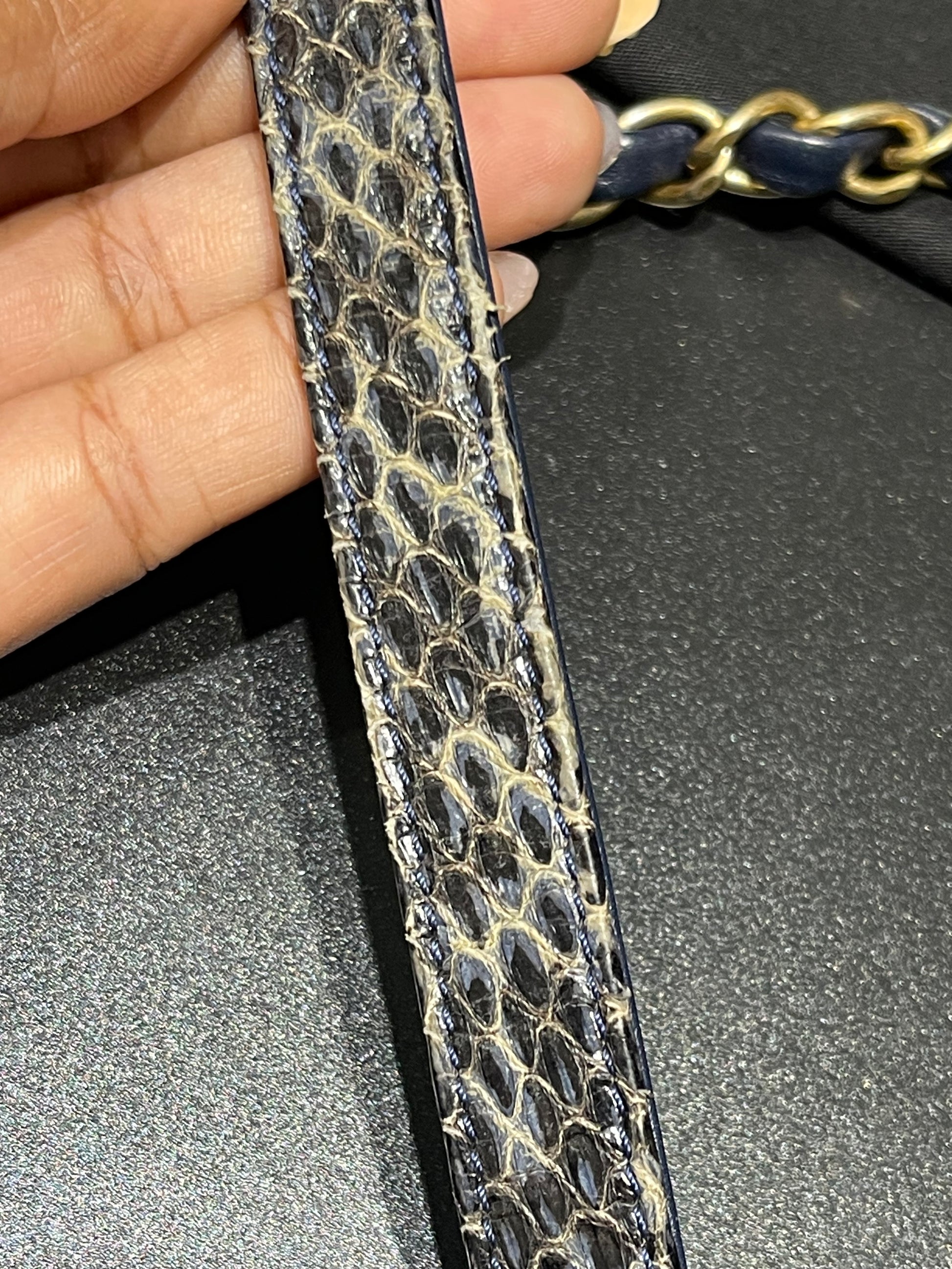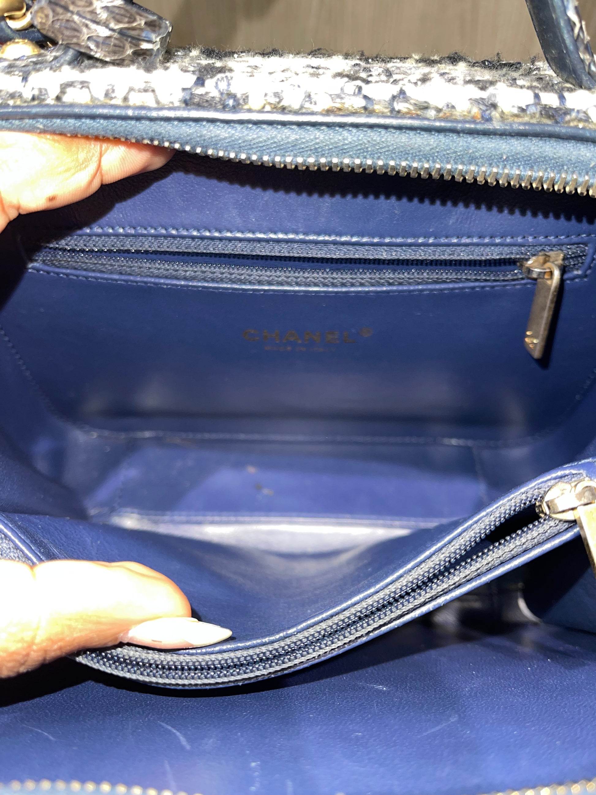 This pre-owned Chanel Medium Vanity Filigree bag in navy tweed and python leather is in very good condition, showing signs of gentle prior use. There are light scratches on the interior and hardware, minor scuffing on the leather trim, some fading/discoloration on the antique gold hardware, and subtle discoloration within areas of the tweed. Overall, the structure and presentation remain beautiful and well-kept.