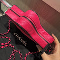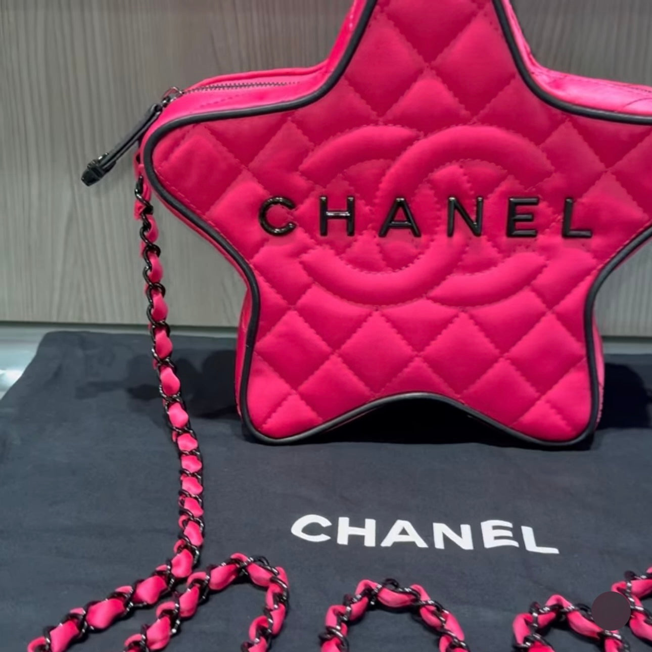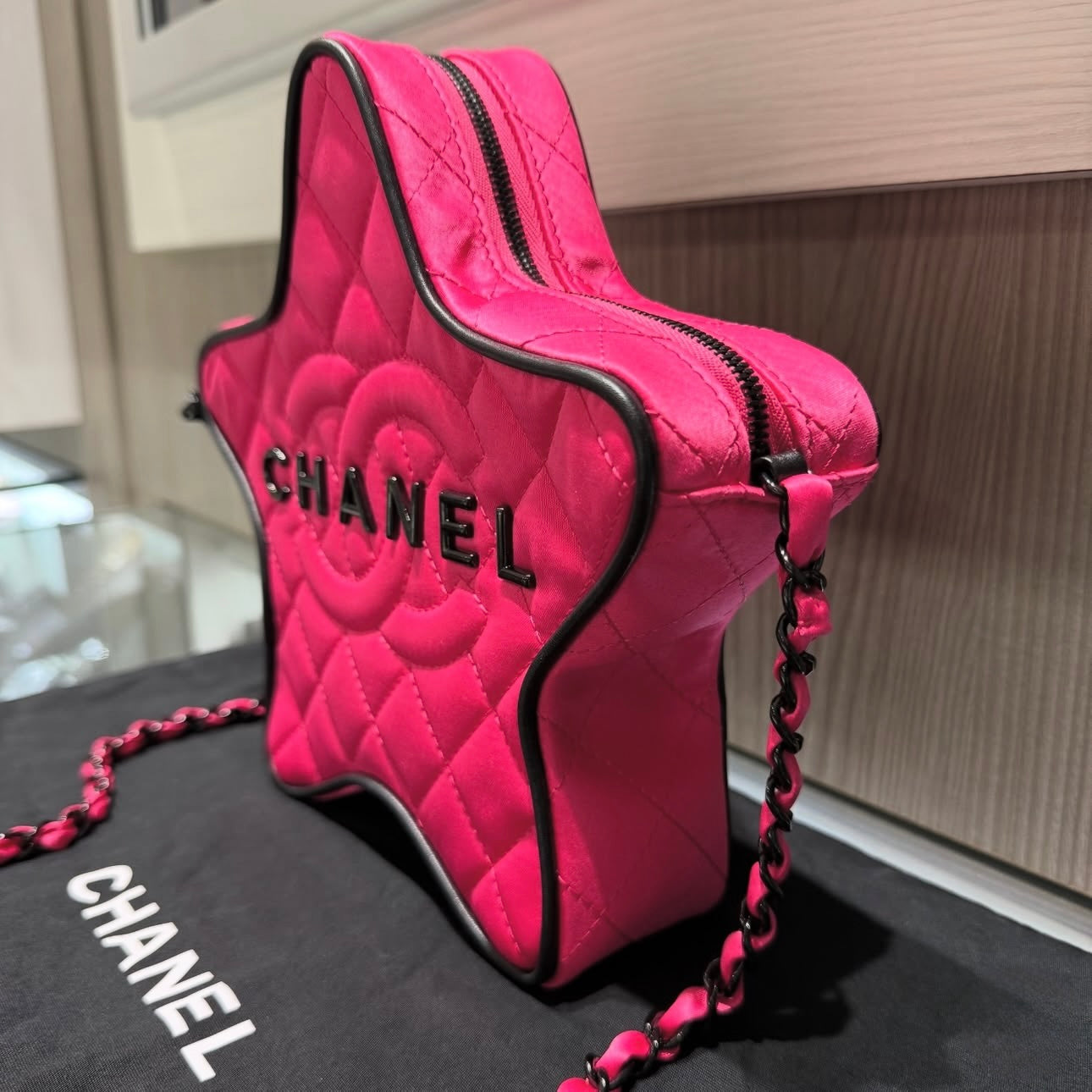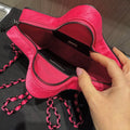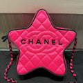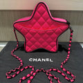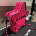 This rare and playful Chanel Walk of Fame Star Bag from the Cruise 2024 Collection by Virginie Viard is a standout collector’s piece. Crafted in vibrant fuchsia pink quilted satin with black graphic accents, this star-shaped crossbody combines whimsical design with iconic Chanel details. The bag features tonal dark silver hardware, a leather-woven chain-link shoulder strap, and a rear slip pocket for quick access.