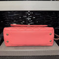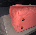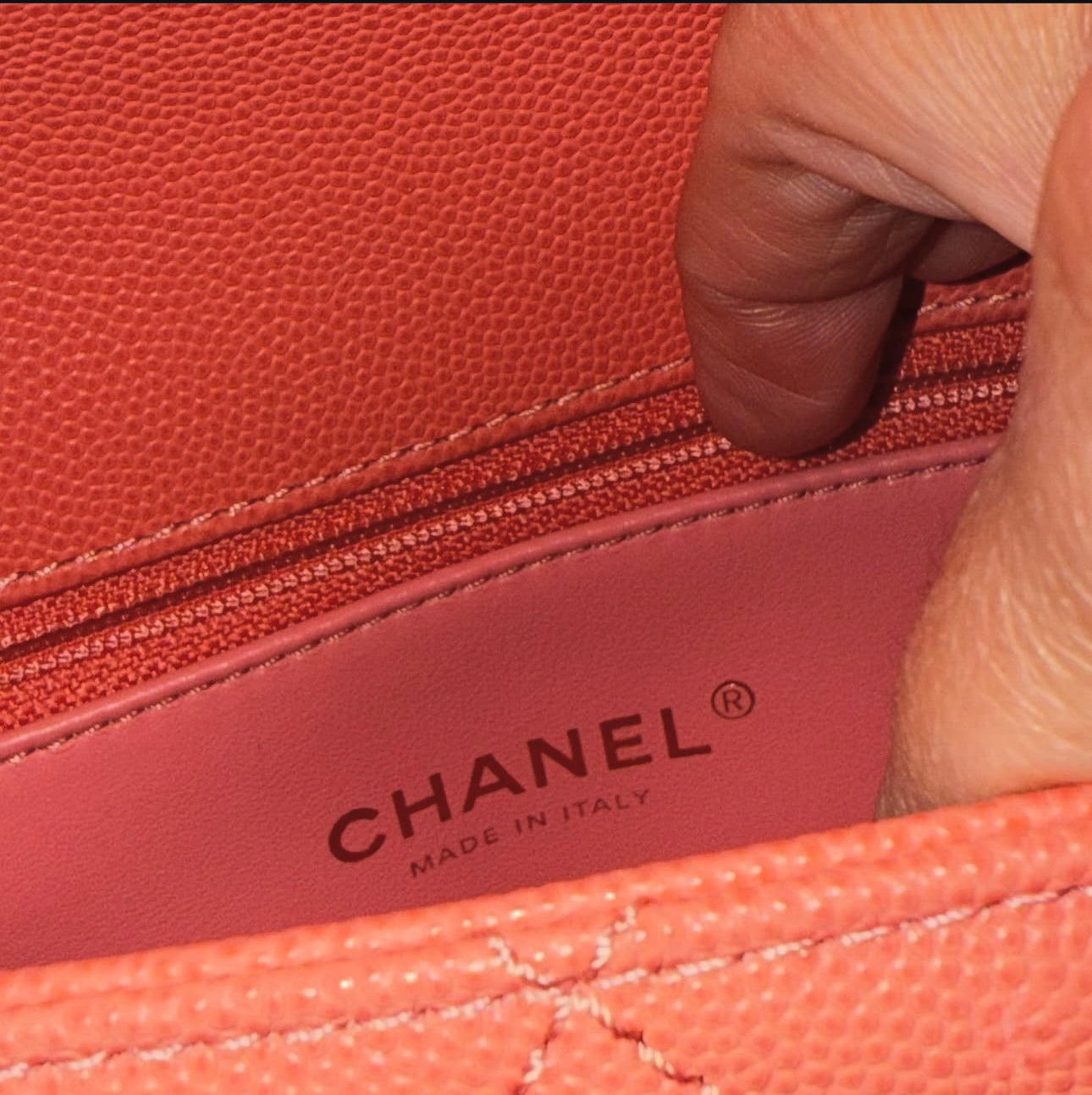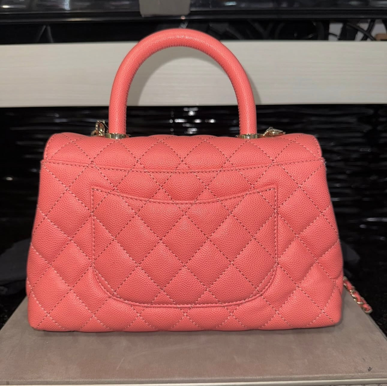 This stunning Chanel Mini Coco Handle Flap is crafted from diamond-quilted caviar leather in a vibrant coral pink. A newer microchip model, this piece blends timeless elegance with modern practicality, making it a sought-after addition to any Chanel collection.
