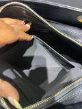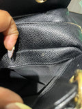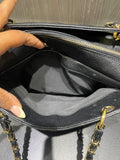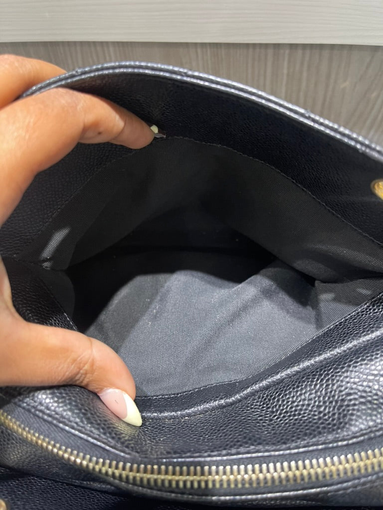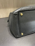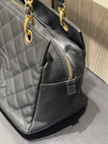 Crafted in Chanel’s signature quilted caviar leather, this chic and compact tote features a bold interlocking CC logo, dual exterior pockets for easy access, and leather-woven chain handles for an elevated finish. The top zipper opens to a grosgrain-lined interior with practical pockets, making it both stylish and functional for everyday wear.