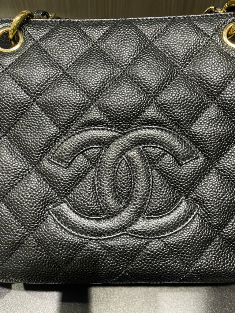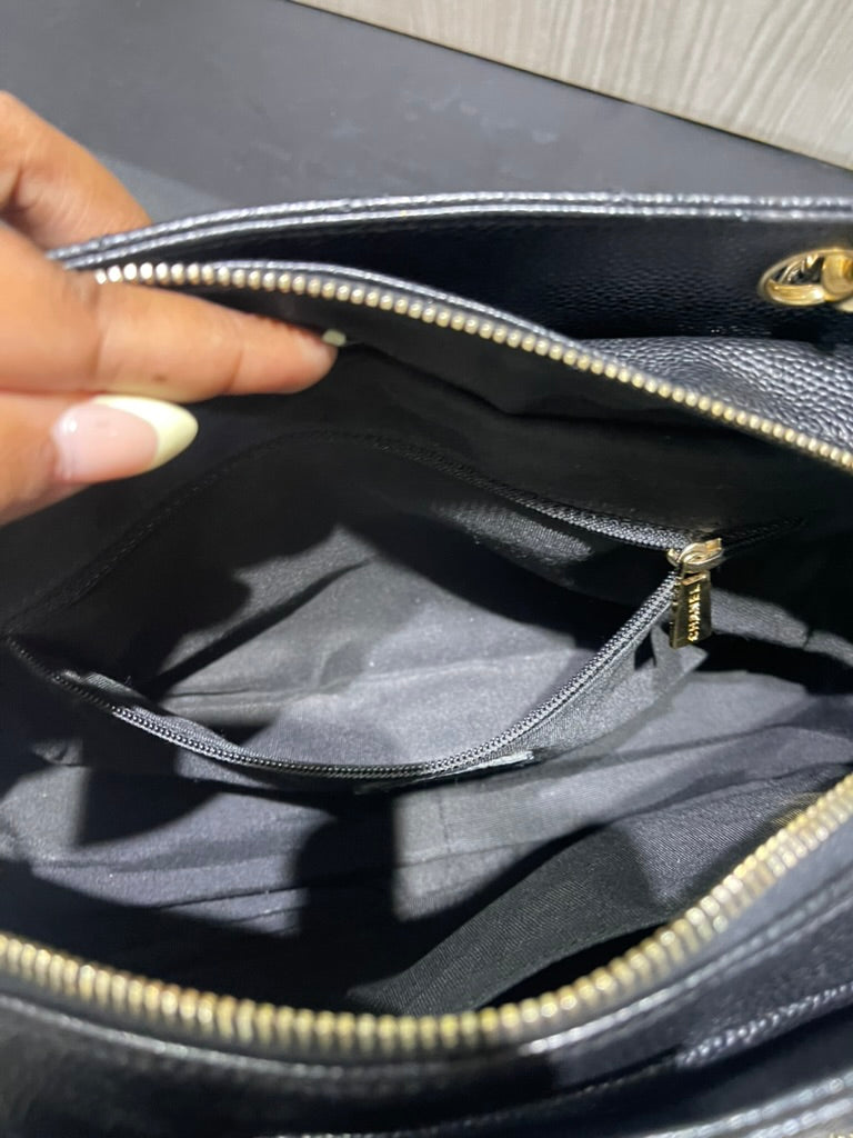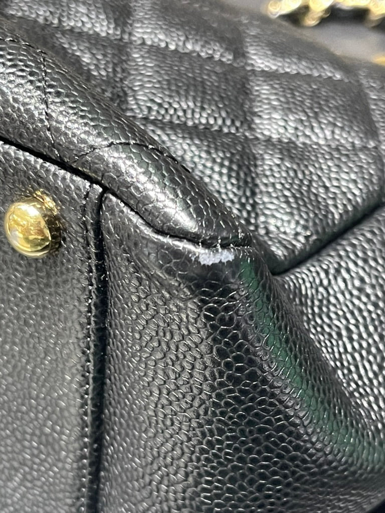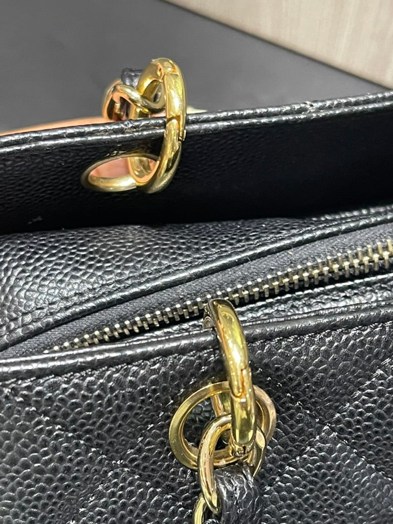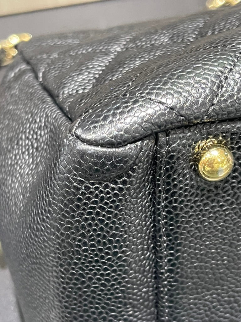 This pre-owned Chanel Petite Shopper Tote (PST) in durable black caviar leather with classic gold-tone hardware is in very good condition, showing gentle signs of prior use. The structure is slightly relaxed, the bottom feet and corners display scuffing/discoloration, and there are minor marks in the interior fabric along with light scratches on the hardware. The exterior leather remains clean and well-maintained, preserving the tote’s iconic look.