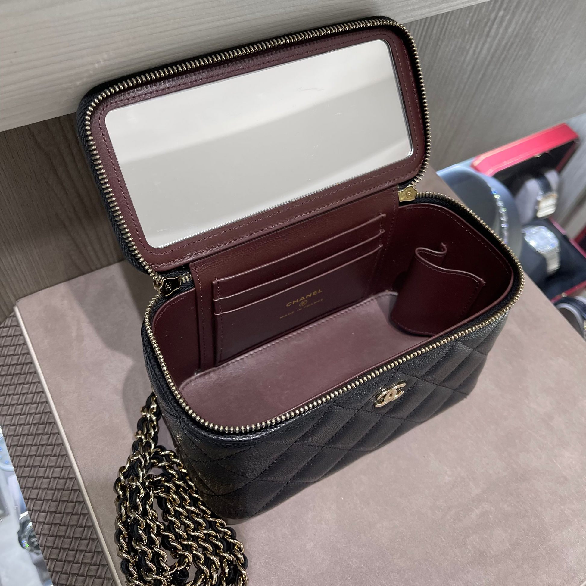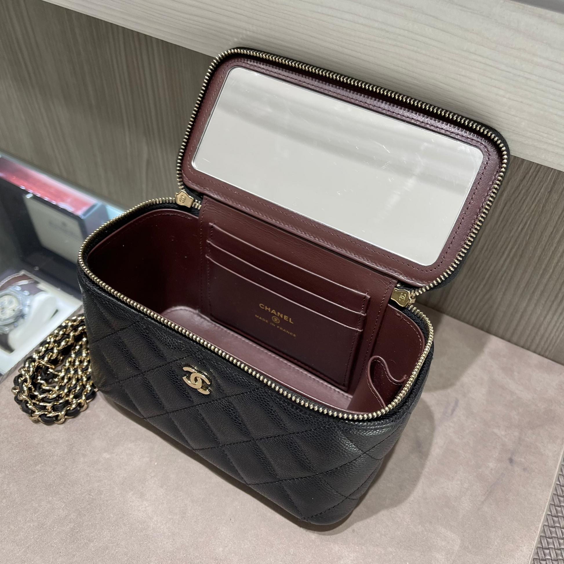 The design showcases Chanel’s signature sophistication with a 3/4 wrap-around zipper, opening to a leather-lined interior complete with card slots and a built-in mirror—perfect for touch-ups and essentials on the go.