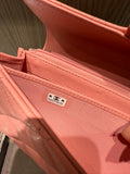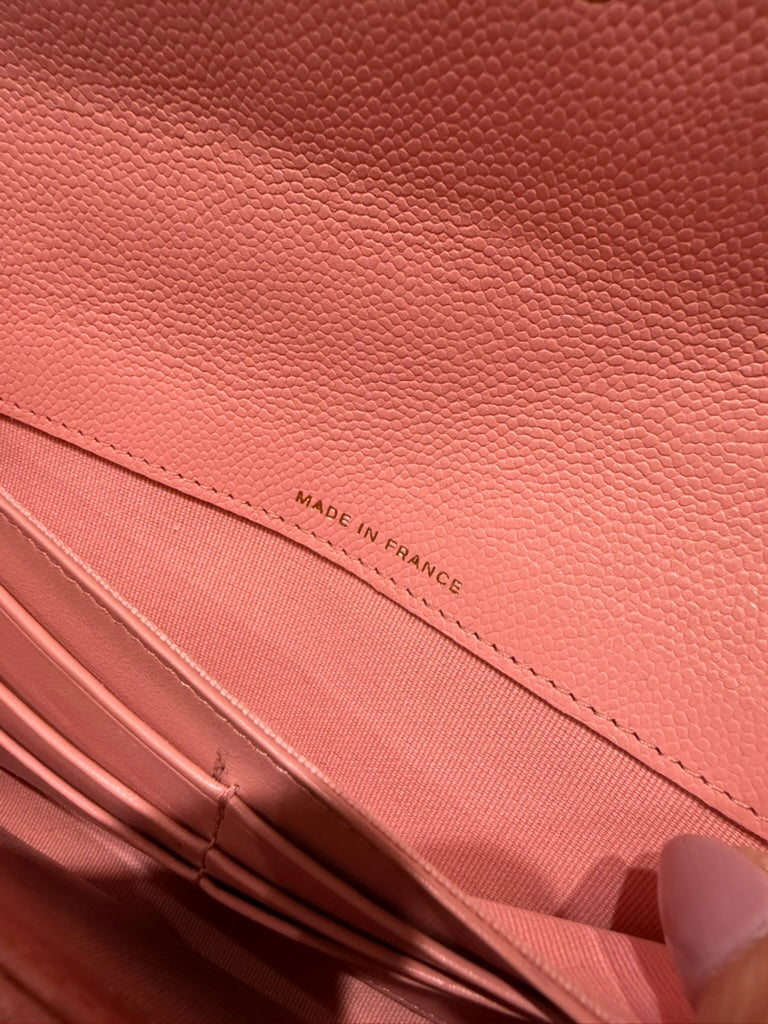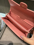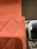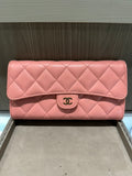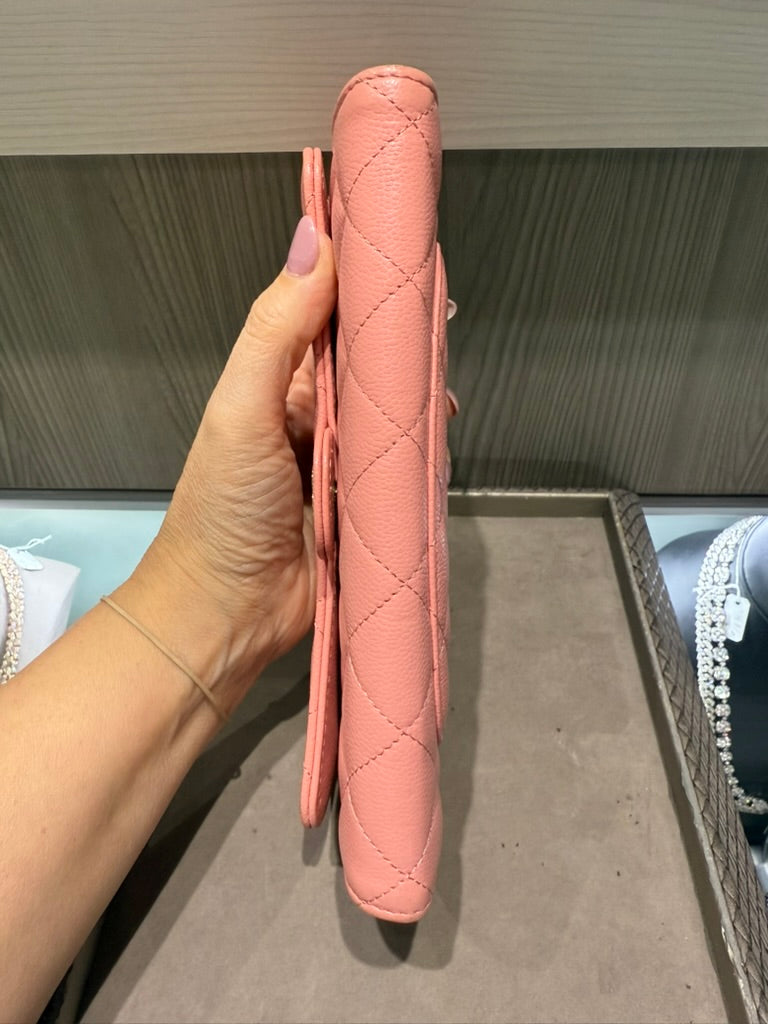This beautiful Chanel Matelassé Tri-Fold Long Wallet from the 2023 Collection by Virginie Viard is crafted from durable pink Caviar leather with the signature quilted pattern and interlocking CC logo in gold-tone hardware. Sleek yet spacious, it features a single exterior pocket, leather-lined interior, multiple card slots, and a secure snap closure.