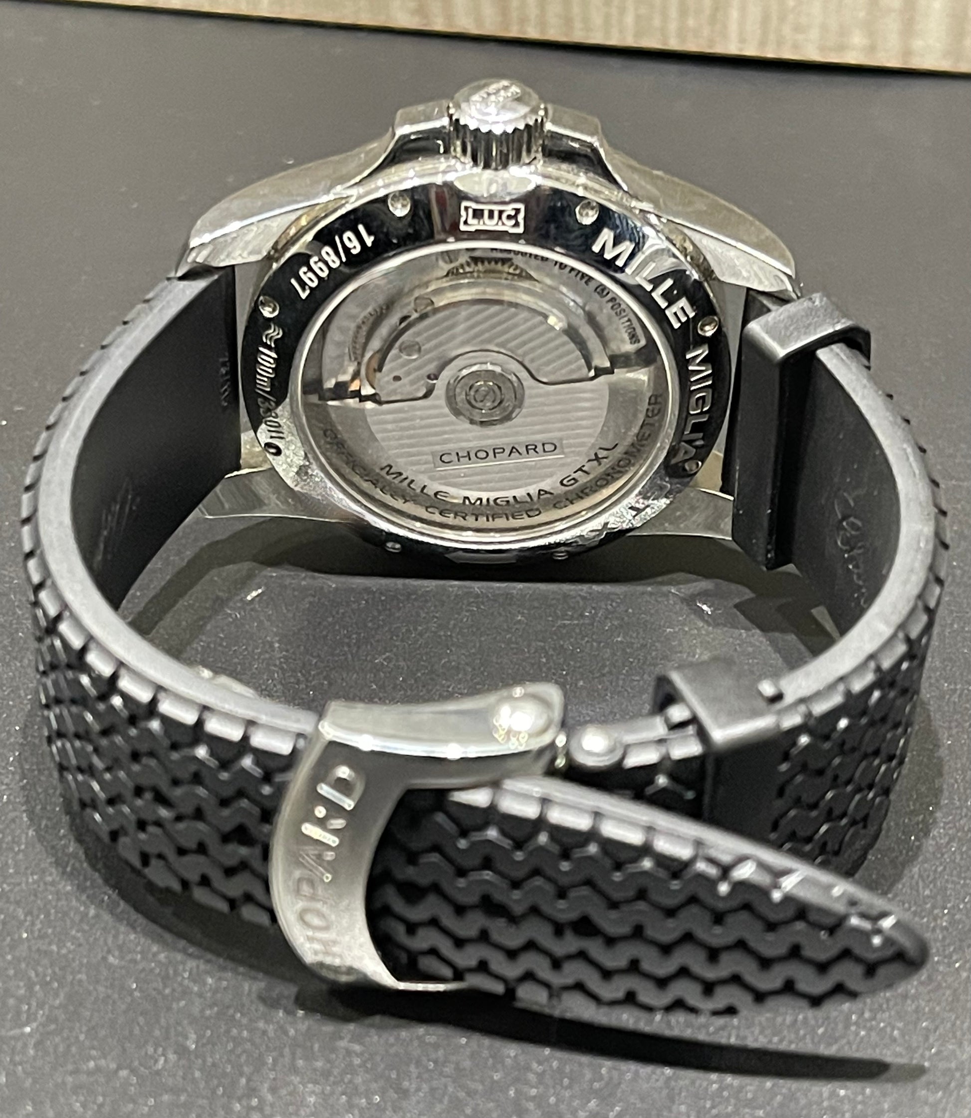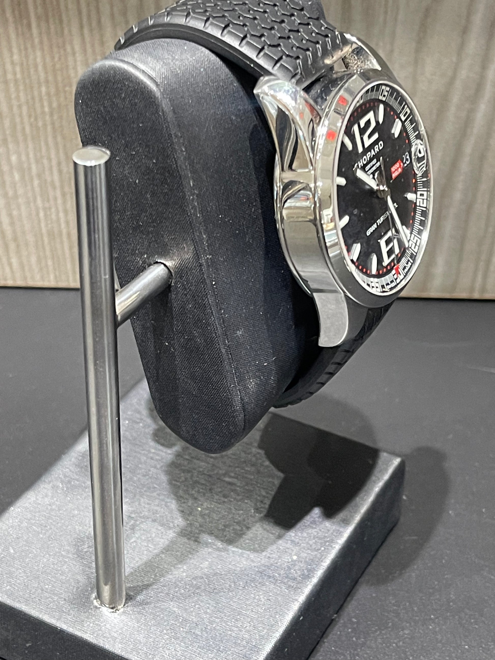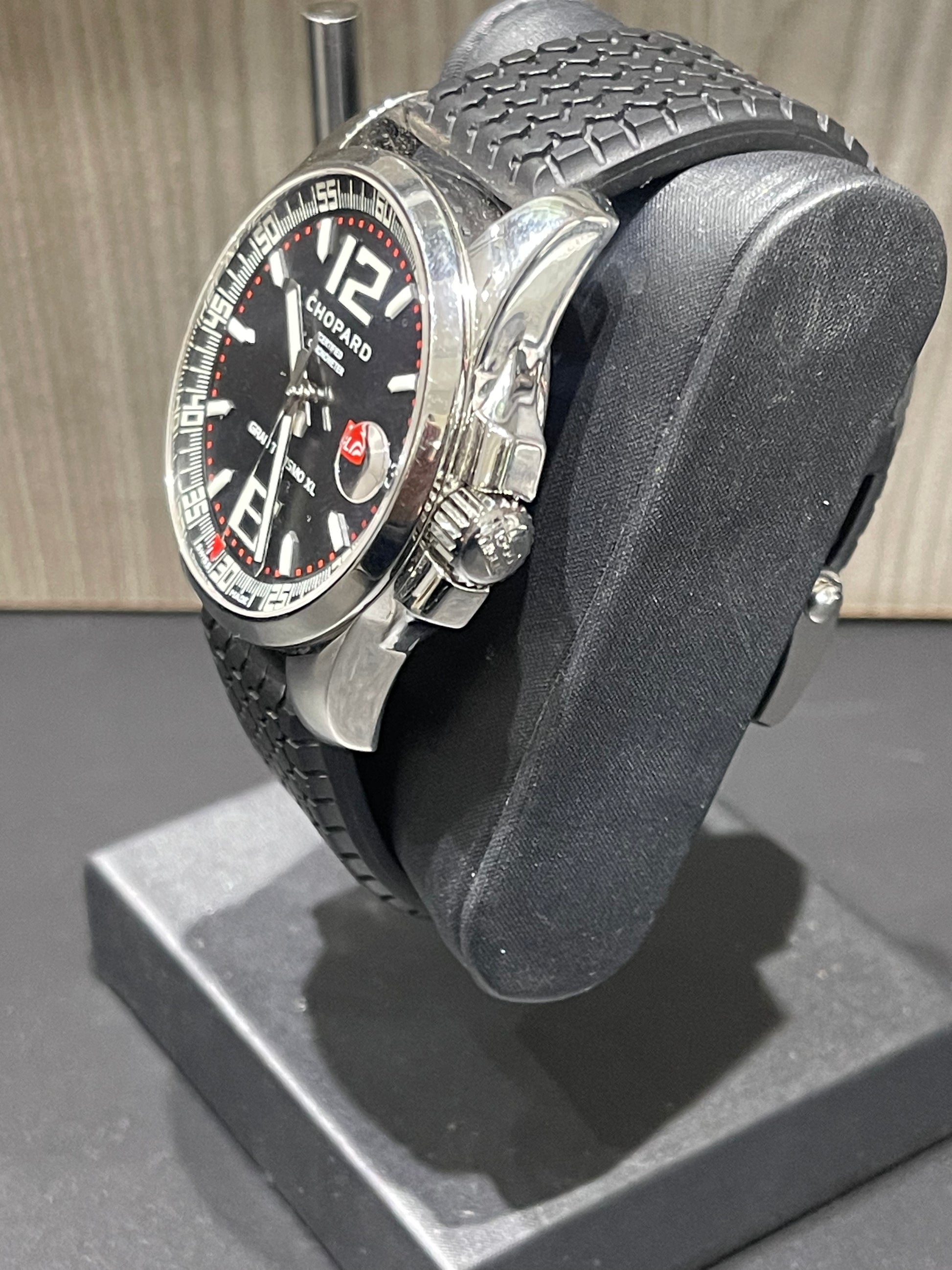 This Chopard Mille Miglia Gran Turismo XL is a bold and sporty luxury timepiece featuring a black dial, polished stainless steel case, and a black rubber strap. Powered by a self-winding automatic chronometer movement, this watch blends precision engineering with a motorsport-inspired design.