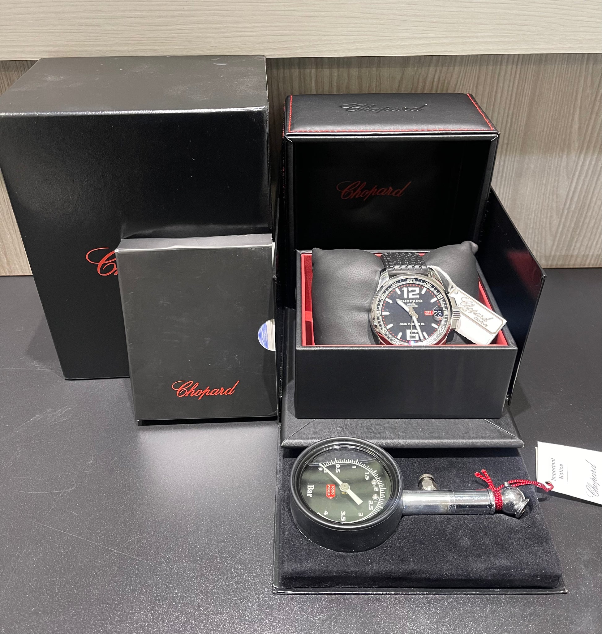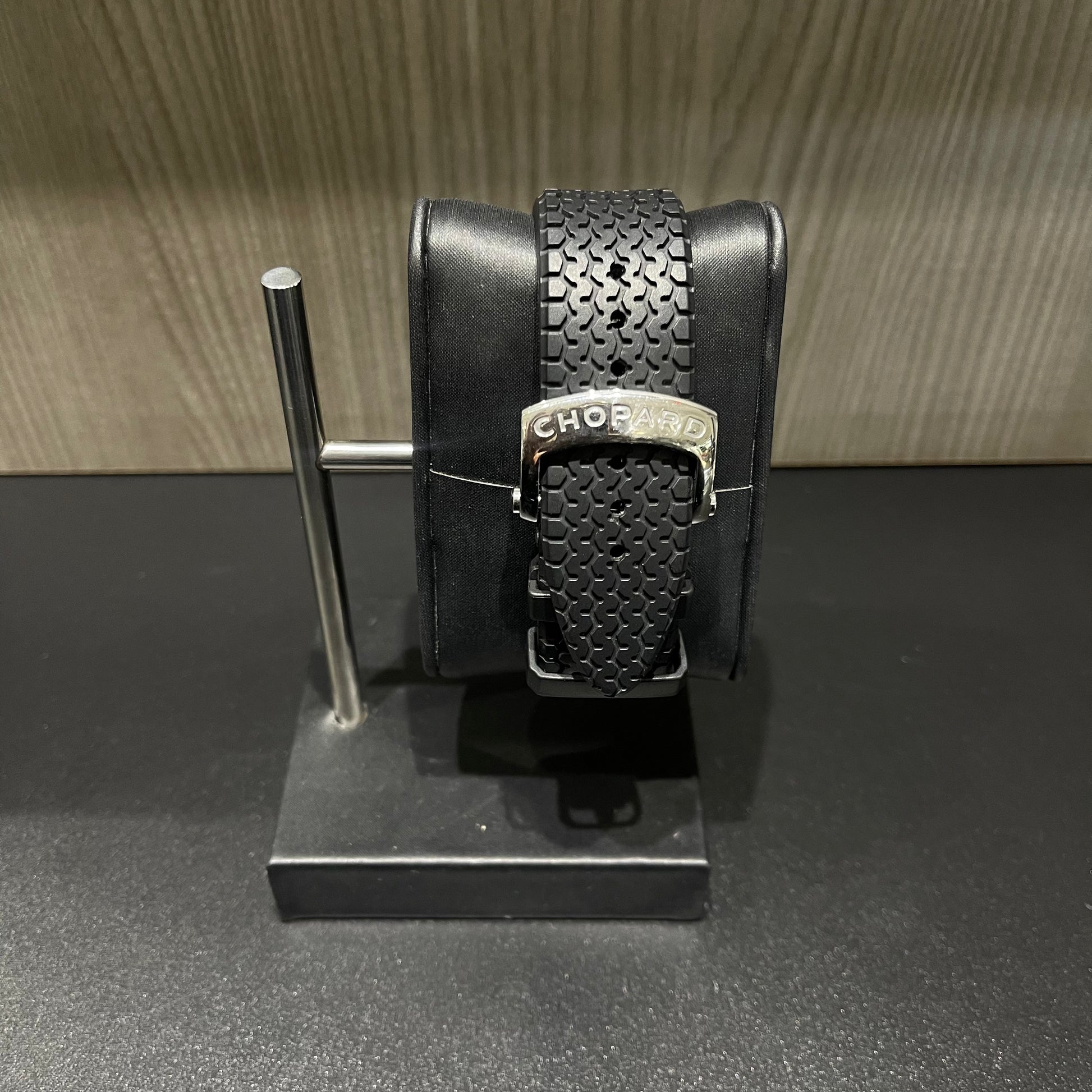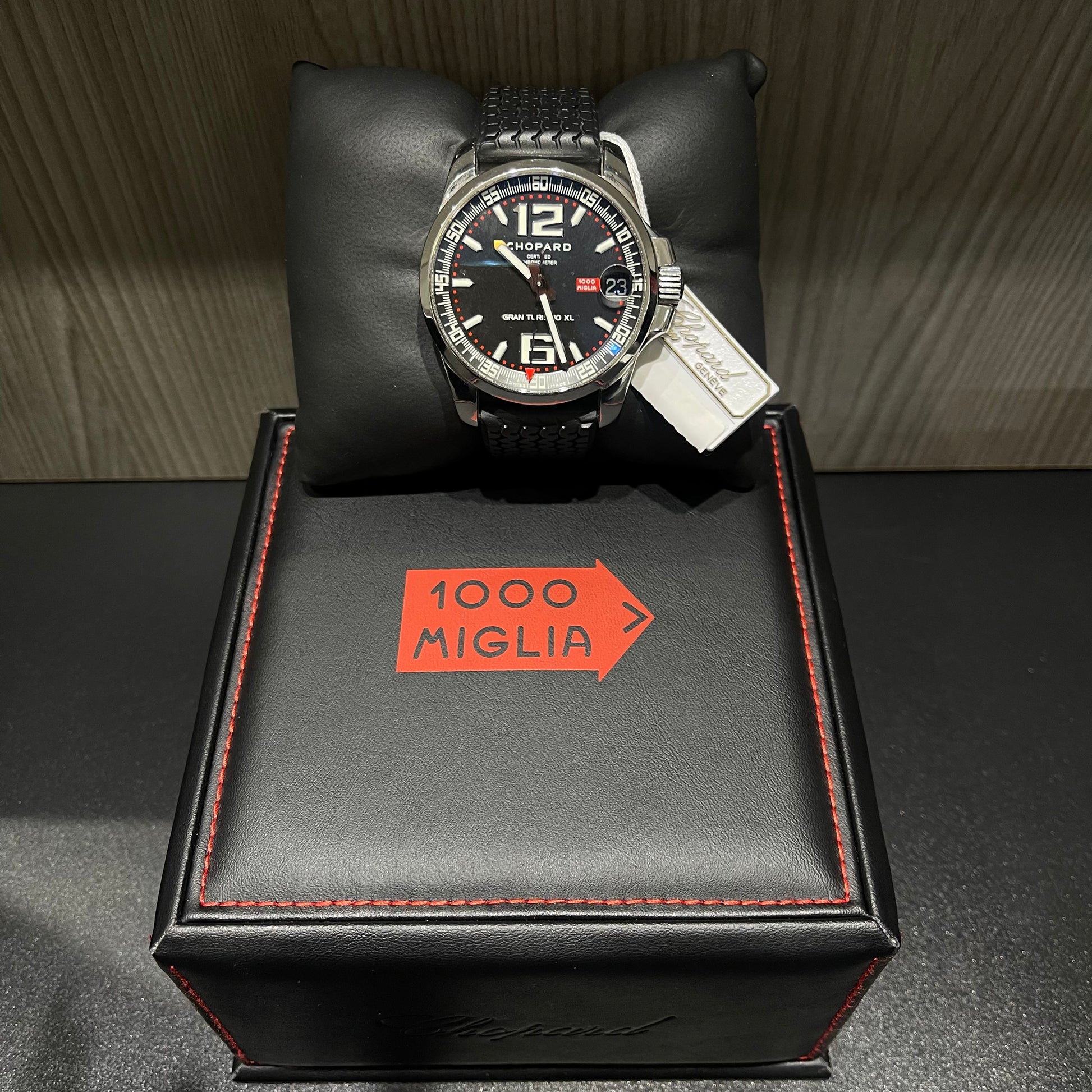 This Chopard Mille Miglia Gran Turismo XL is a bold and sporty luxury timepiece featuring a black dial, polished stainless steel case, and a black rubber strap. Powered by a self-winding automatic chronometer movement, this watch blends precision engineering with a motorsport-inspired design.
