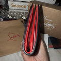 The exterior features scratch-resistant black grained calf leather framing a smooth red rubber panel modeled after Louboutin’s signature sneaker sole. Inside, the wallet opens to a bold Loubi red leather lining with eight card slots and a full-size banknote compartment. A logo-embossed front and clean two-tone finish complete this standout design.