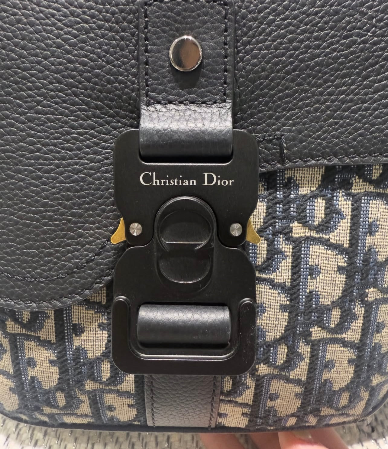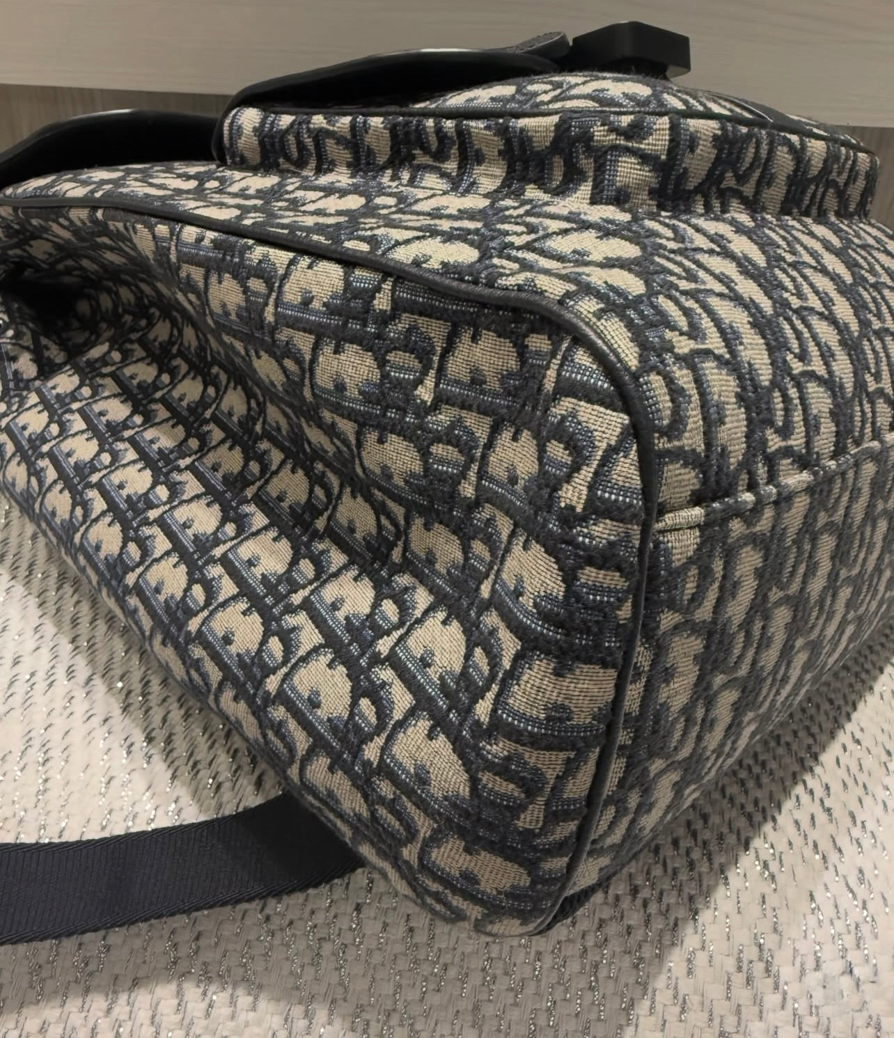 Crafted in beige and black Dior Oblique jacquard, the design is elevated with black grained calfskin trim and refined silver-tone hardware. The structured yet functional shape makes it an ideal everyday or travel companion, seamlessly blending style and practicality.