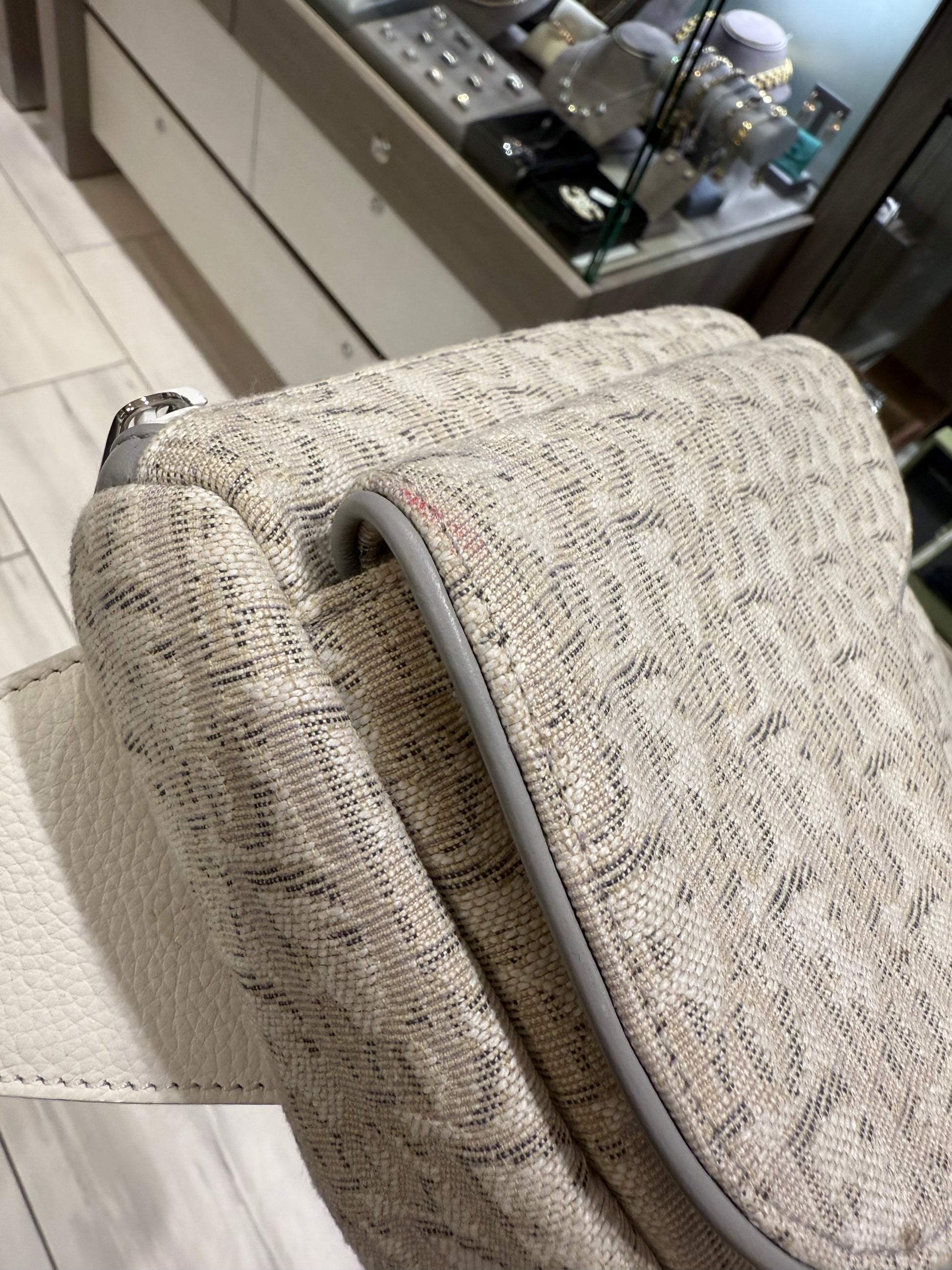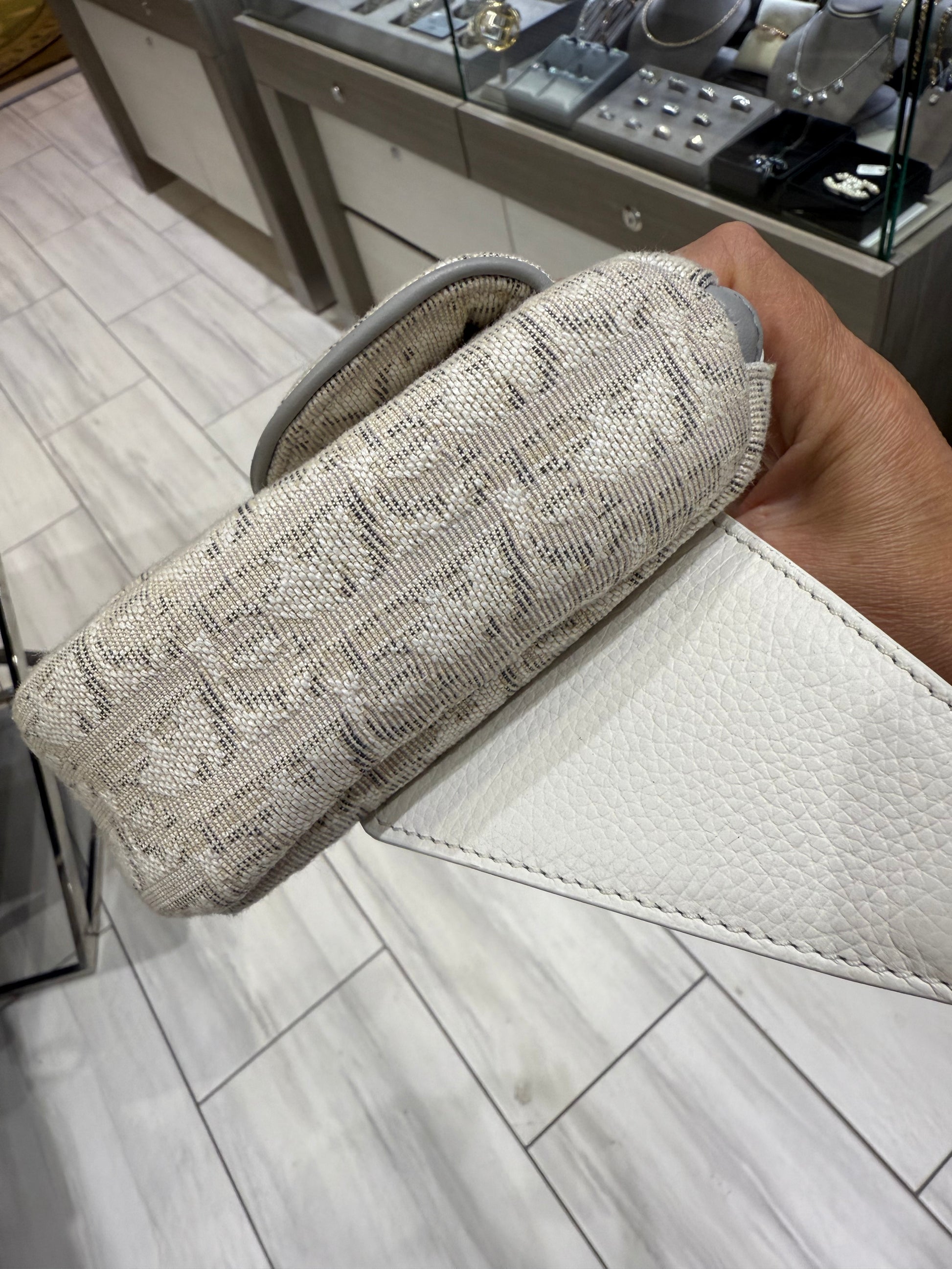 Material: White and grey Dior Oblique canvas with white calfskin leather trim