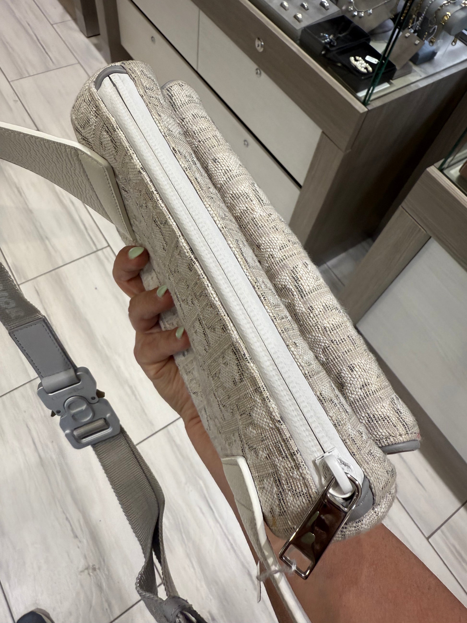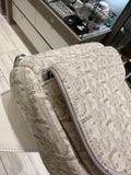 This pre-owned Christian Dior Oblique World Tour Saddle Belt Bag in white and grey is a standout piece that blends iconic design with urban edge. Crafted from monogram jacquard canvas on a beige base, this unique belt bag features white grained calfskin leather trim, silver-tone hardware, and Dior’s signature saddle silhouette in a versatile hands-free format.