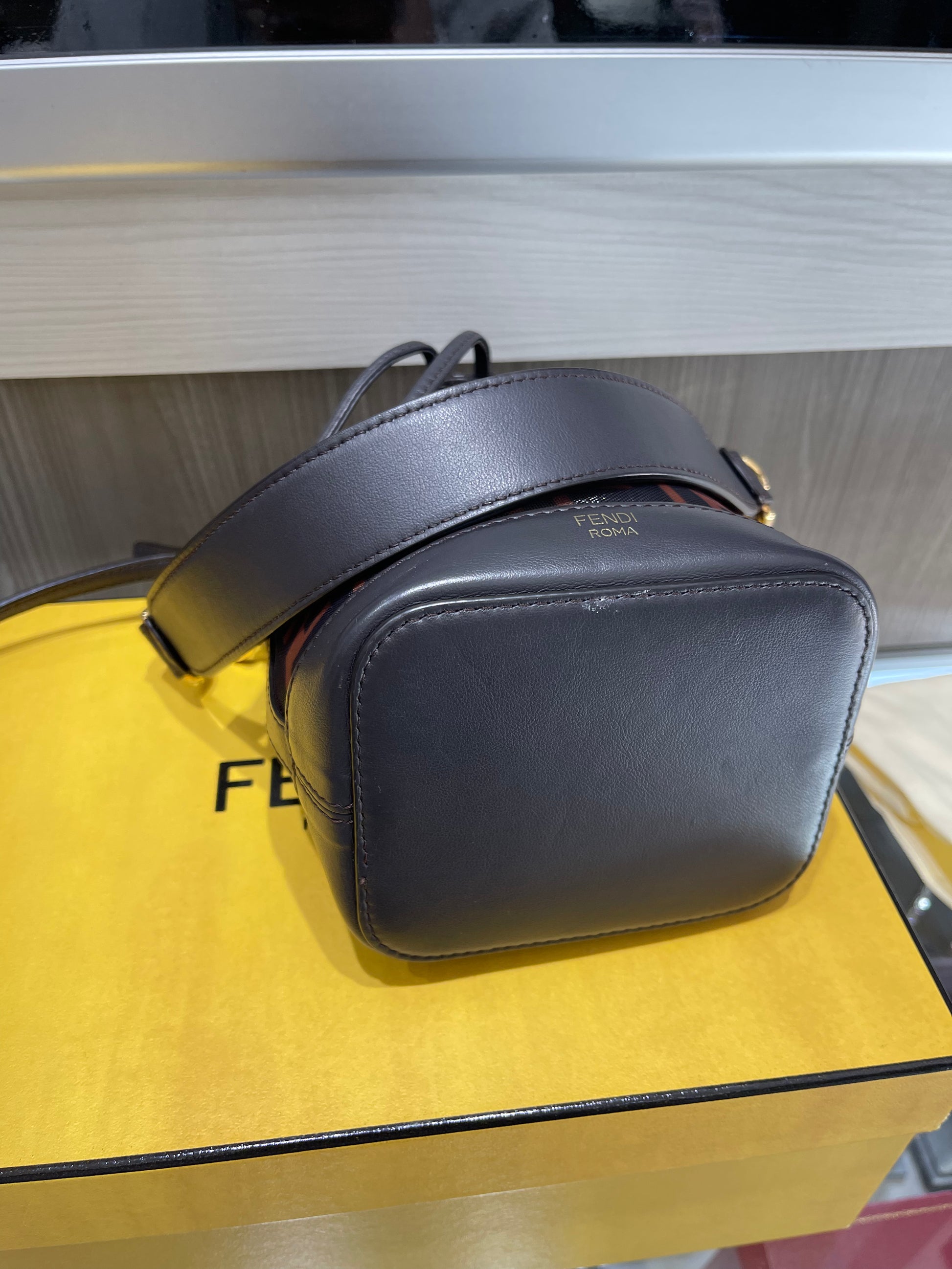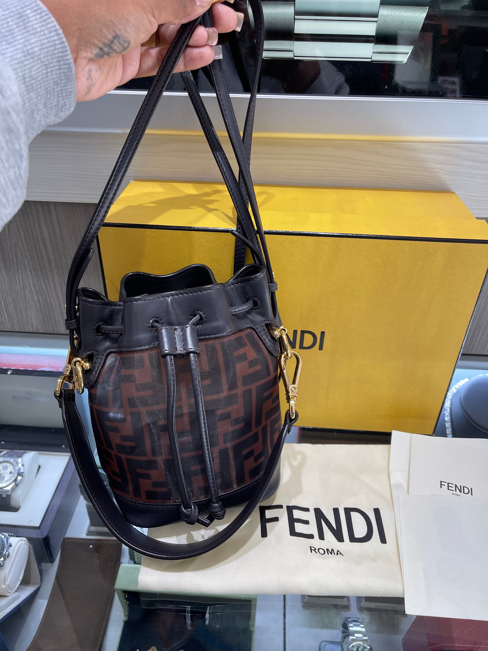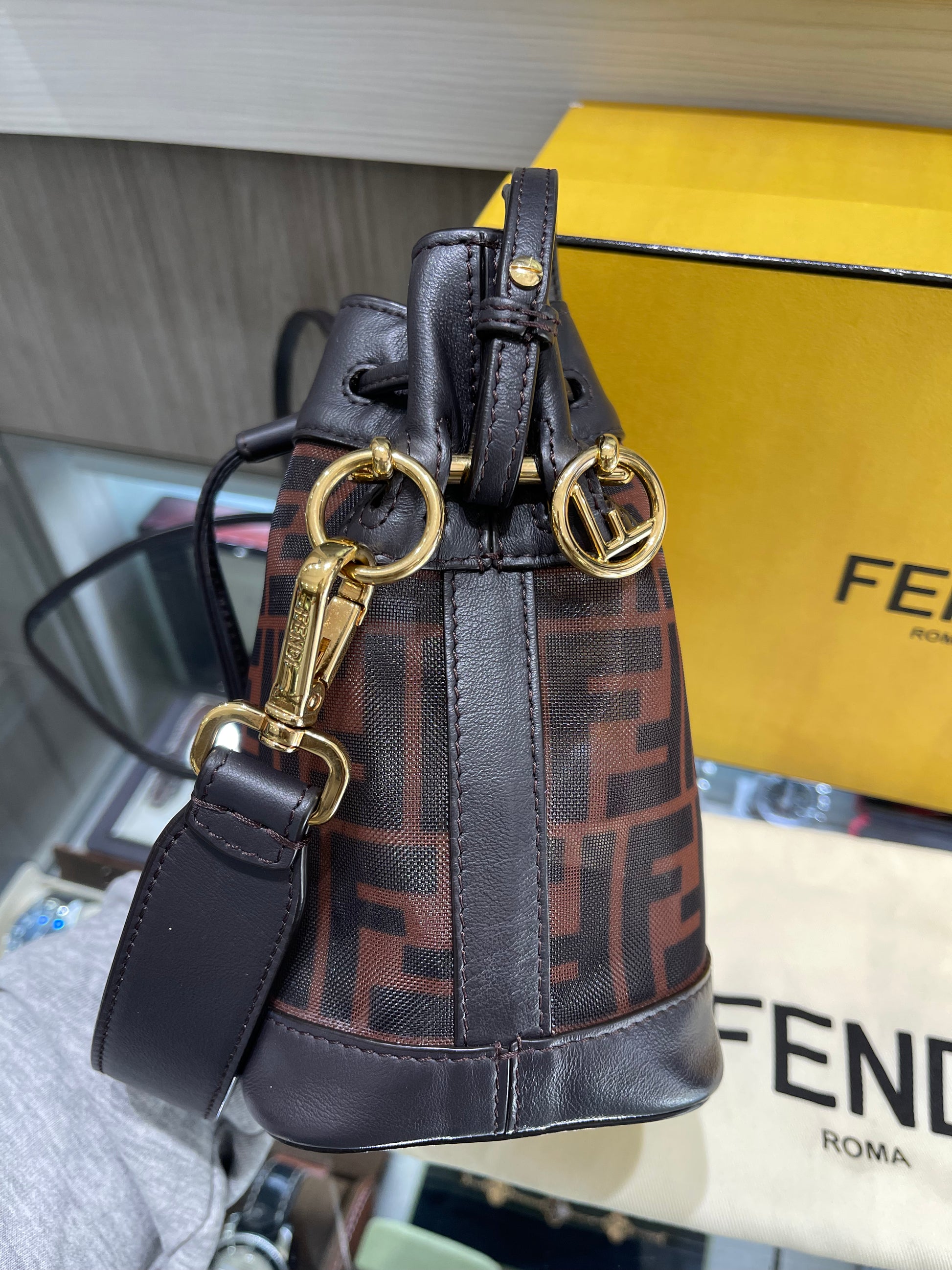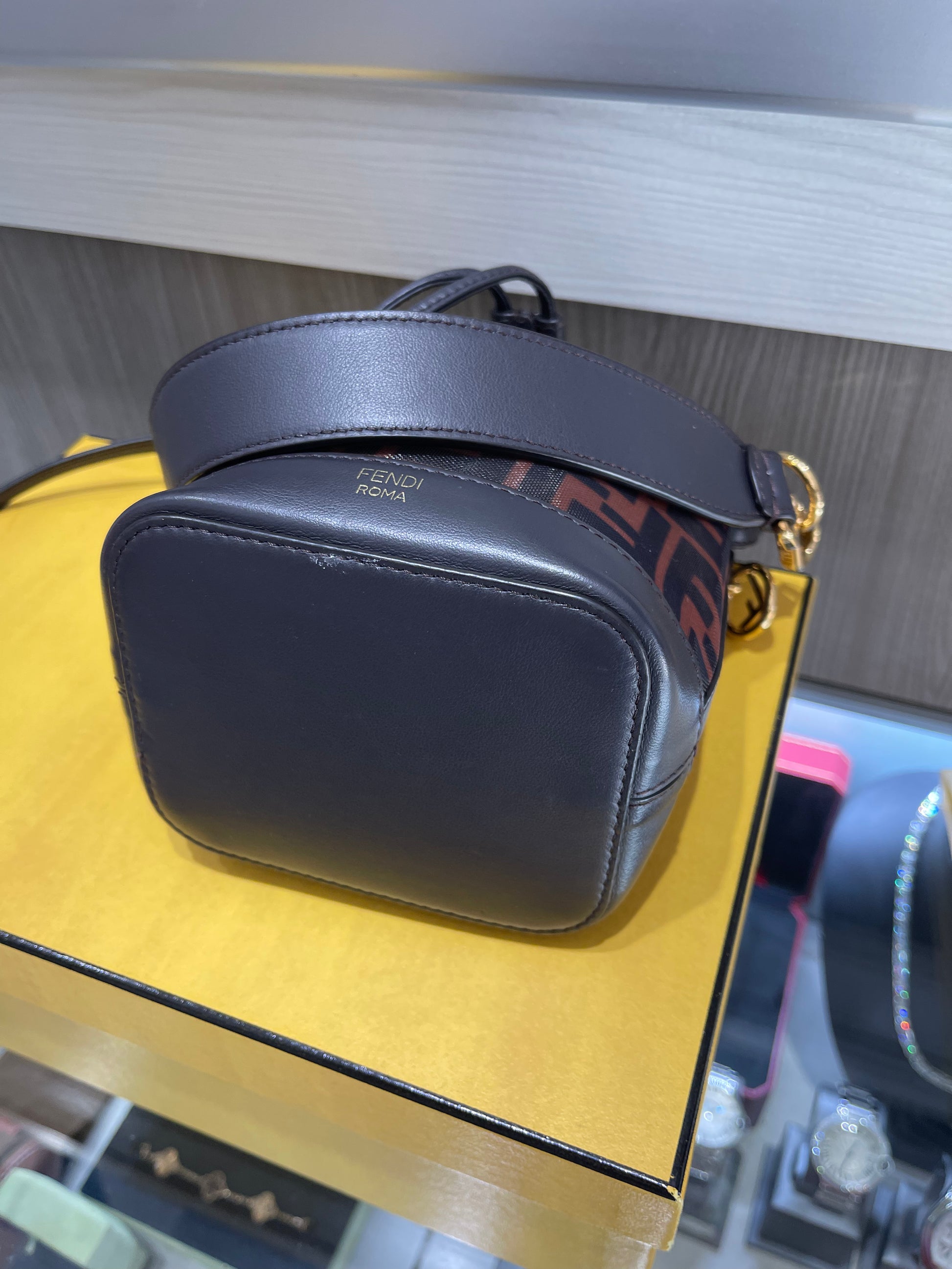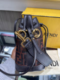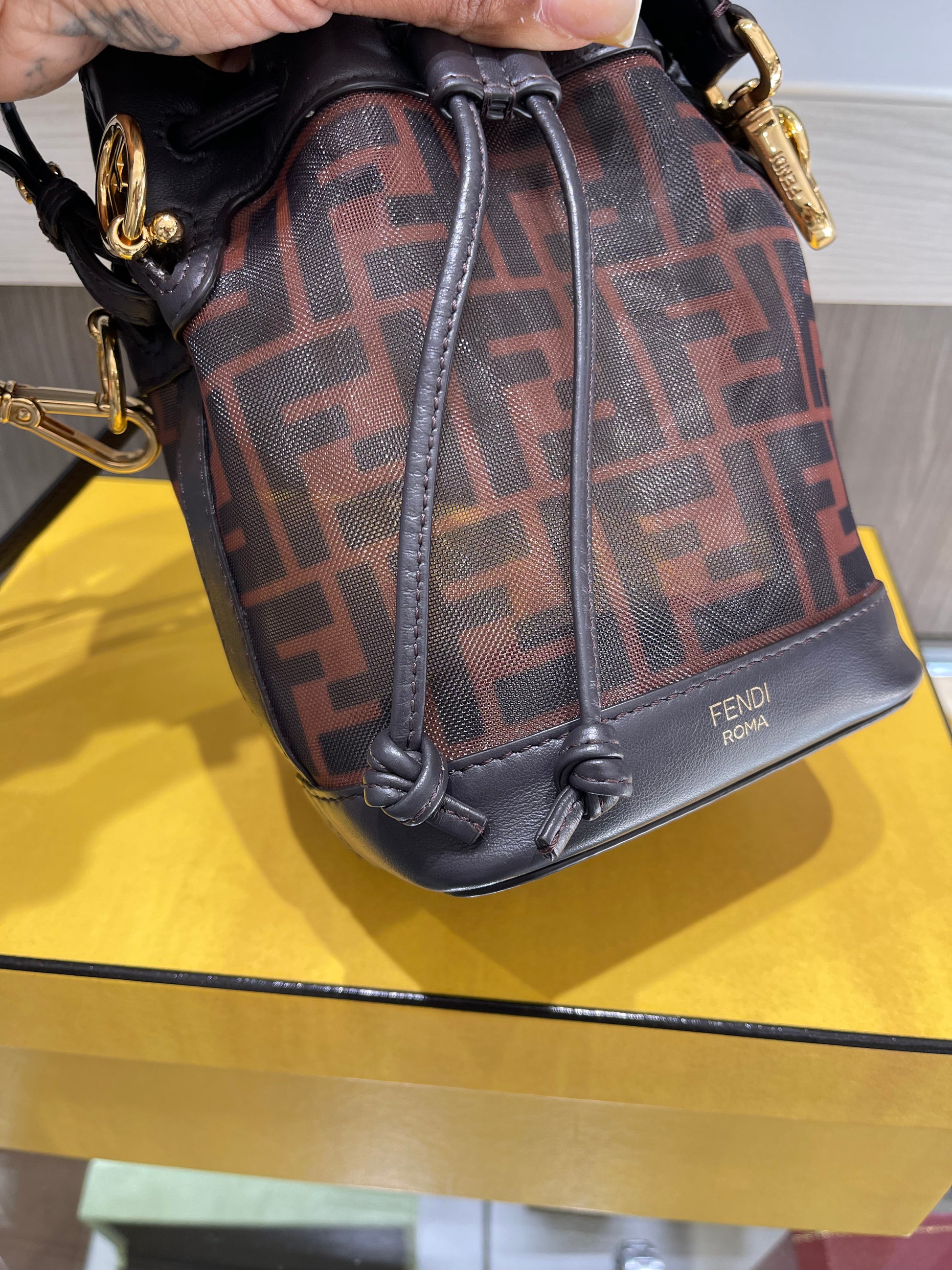 This is an authentic FENDI Mon Tresor FF Mesh Mini Bag in Brown. This chic and compact bucket bag features the iconic FF jacquard motif rendered in breathable mesh and accented with smooth black leather trim. The design is completed with gleaming gold-finish hardware and the signature Fendi logo charm details.