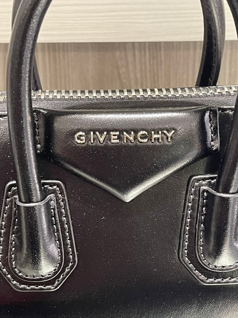 This timeless Givenchy Mini Antigona is crafted from smooth Box calfskin leather in classic black, offering a structured silhouette and refined, minimalist appeal. An iconic piece from the Antigona line, it features the signature pentagonal logo patch with silvery debossed GIVENCHY lettering and sleek silver-tone hardware.