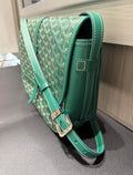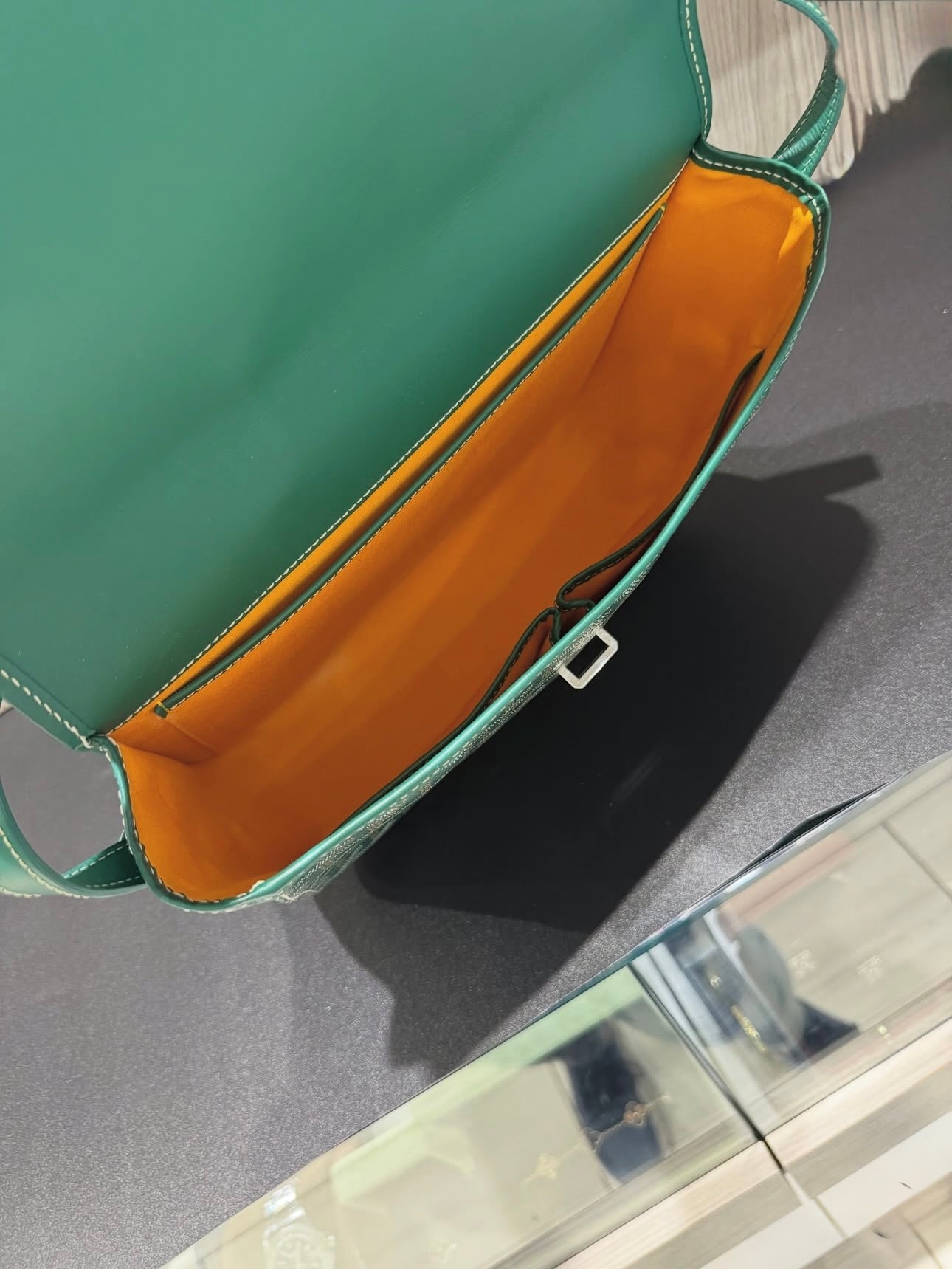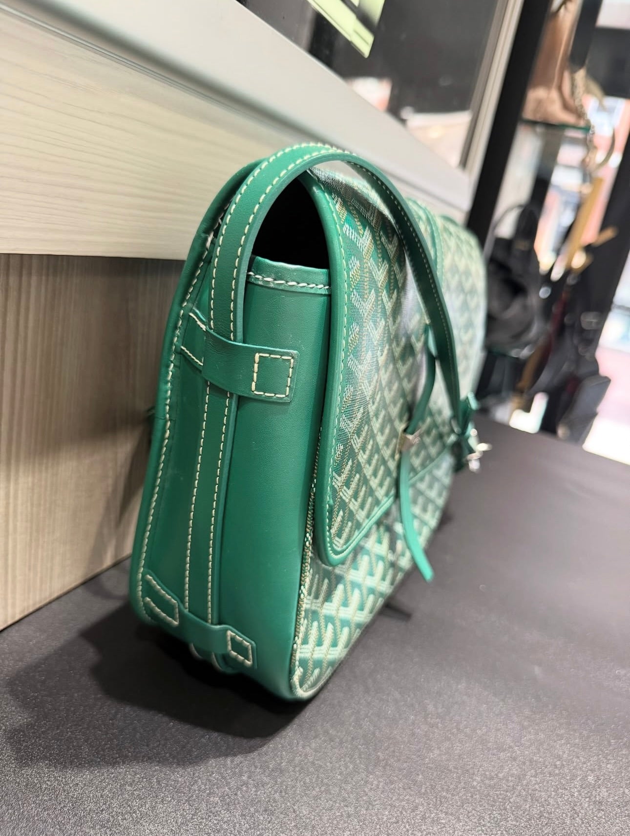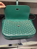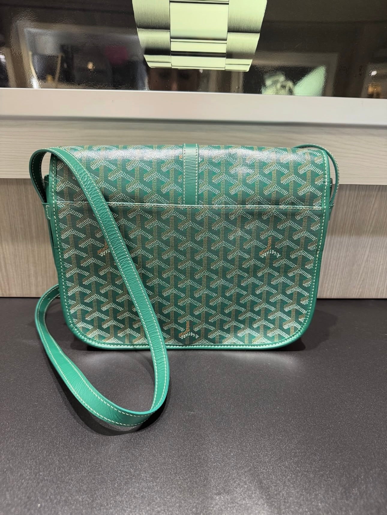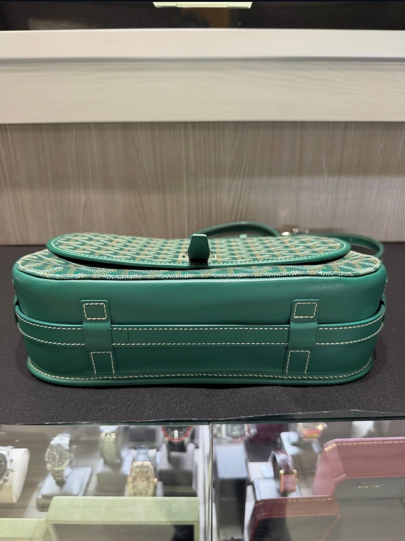 This authentic Goyard Belvédère MM Messenger Bag in Green Goyardine canvas showcases the house’s timeless craftsmanship and signature chevron motif. Designed for effortless everyday wear, it offers both sophistication and functionality in a lightweight crossbody silhouette.