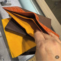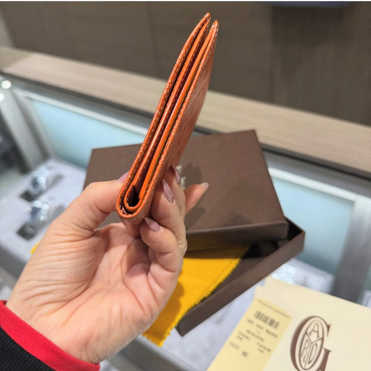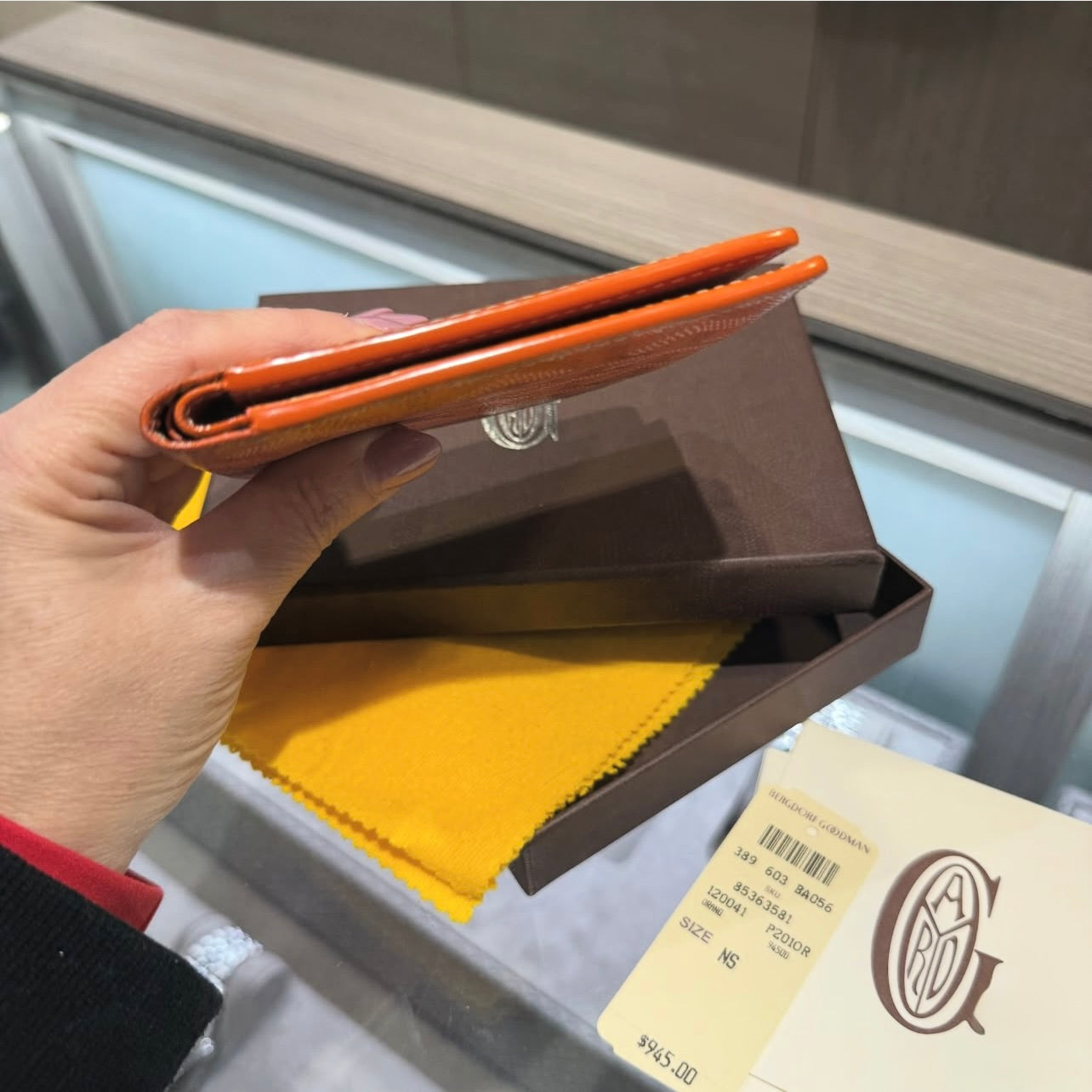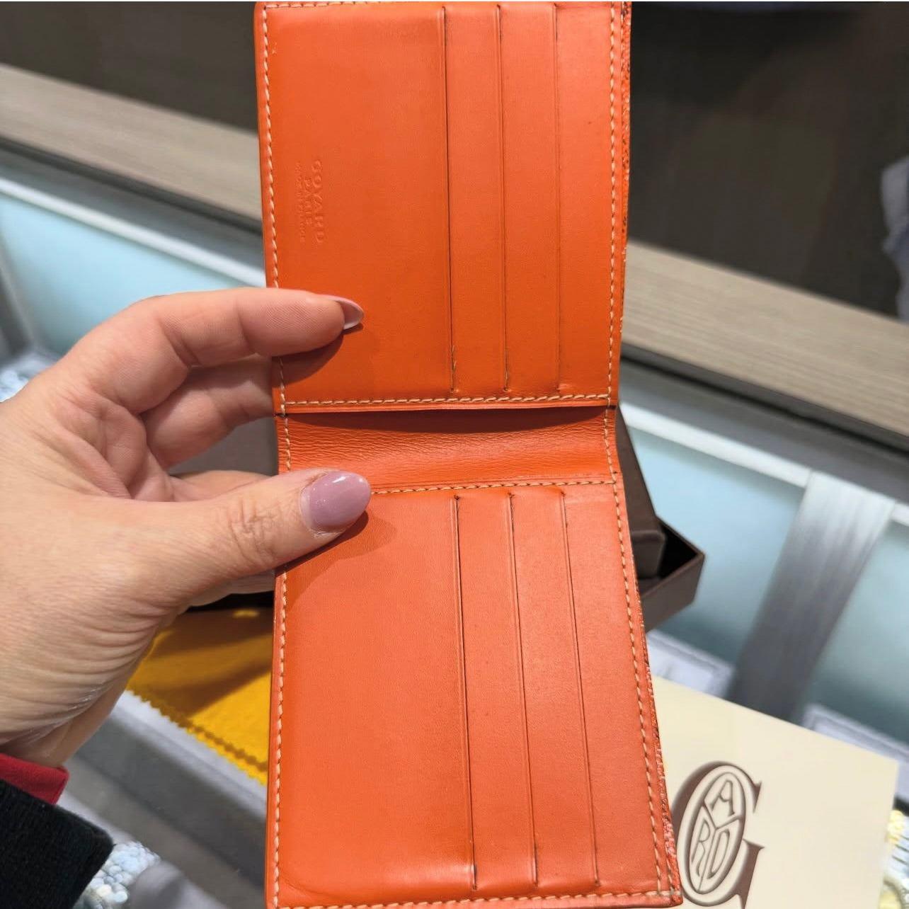 This authentic Goyard Victoire Bifold Wallet in vibrant orange offers a refined blend of luxury and everyday functionality. Crafted with the house’s signature geometric pattern accents and iconic Goyard logo, it features a durable canvas exterior paired with a smooth leather interior.