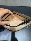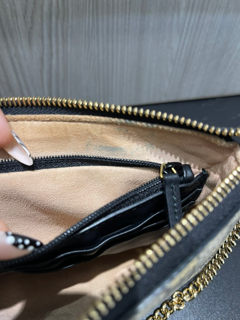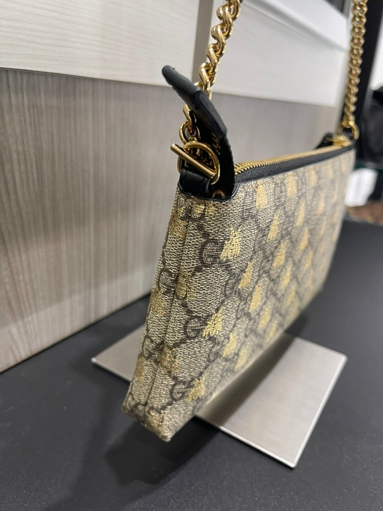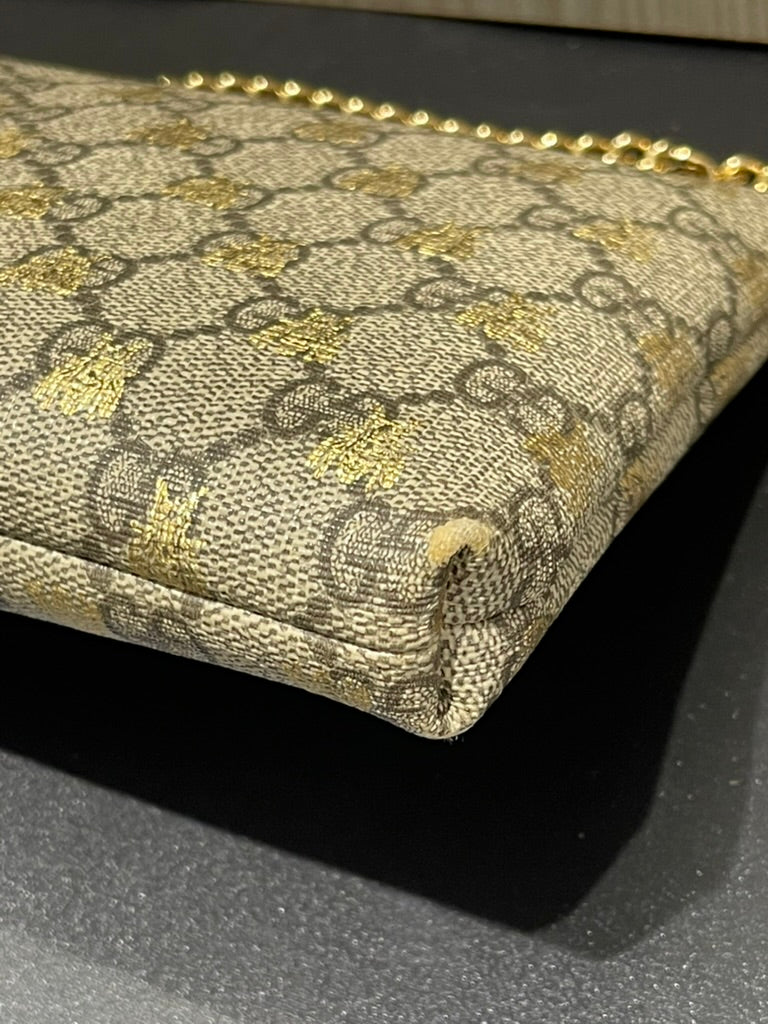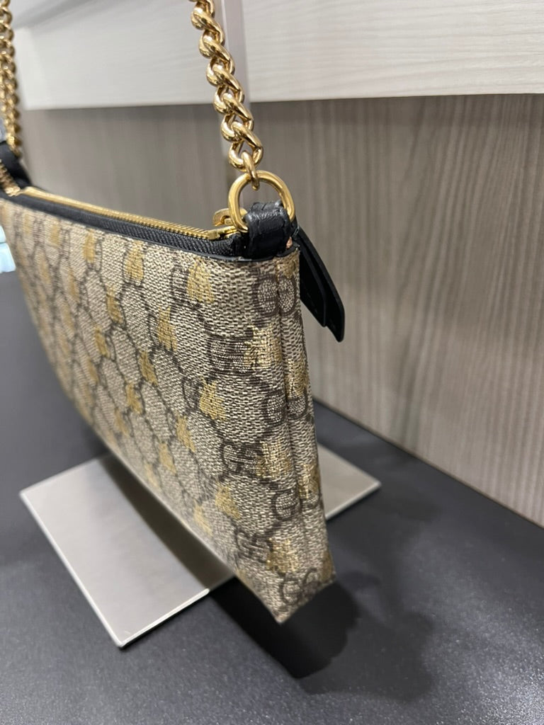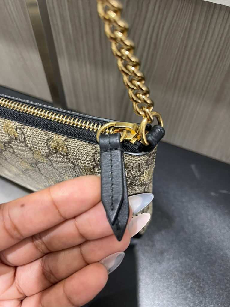 Chic, compact, and effortlessly stylish, this Gucci Wallet on Chain features the iconic GG Supreme canvas adorned with foiled bumblebee accents, creating a playful yet elegant design. The polished gold-tone chain strap allows for versatile wear—carry it by hand, wrap it around your wrist, or wear it as a mini crossbody.