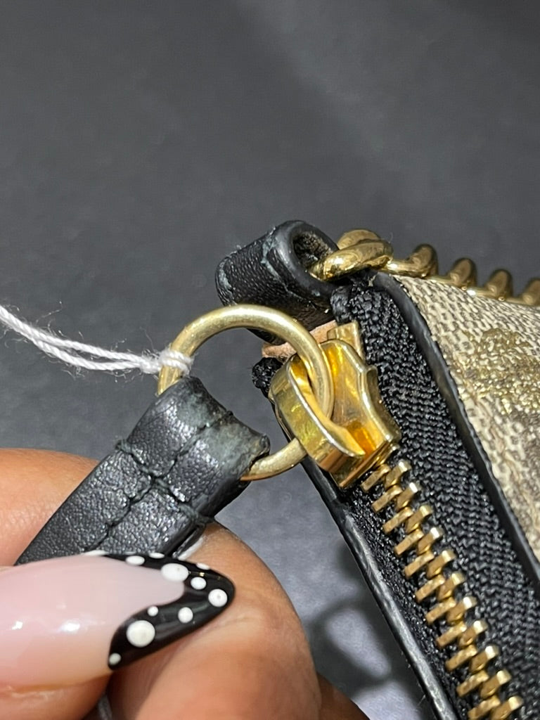 This wallet is in very good pre-owned condition. The previous owner attempted cleaning the interior, leaving the card slots slightly wavy. There is a blue mark on the interior fabric, scuffing on the bottom corners and zipper tab, and minor fading on hardware. Comes with a certificate of authenticity.