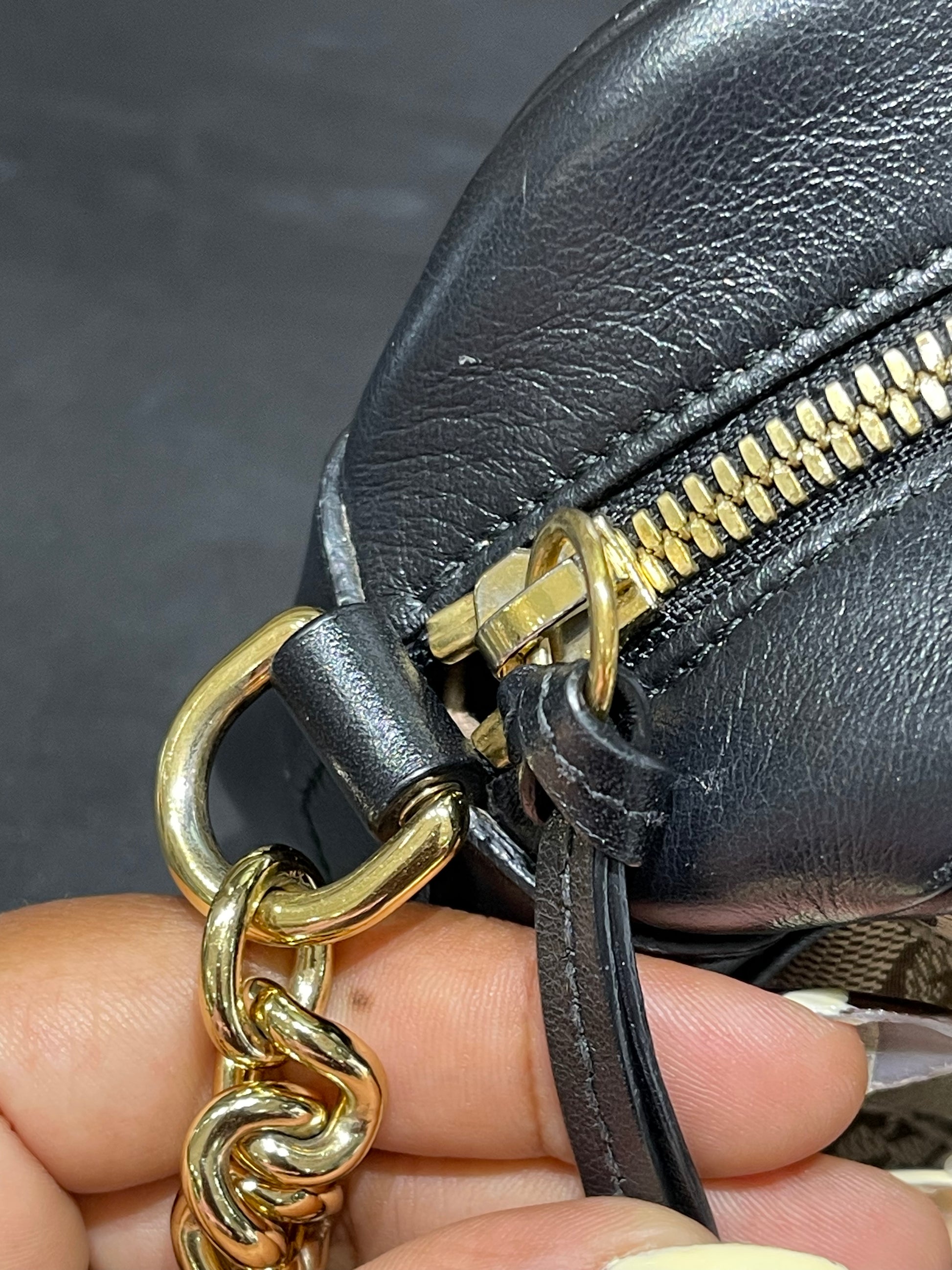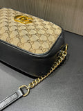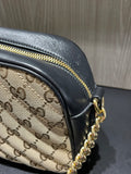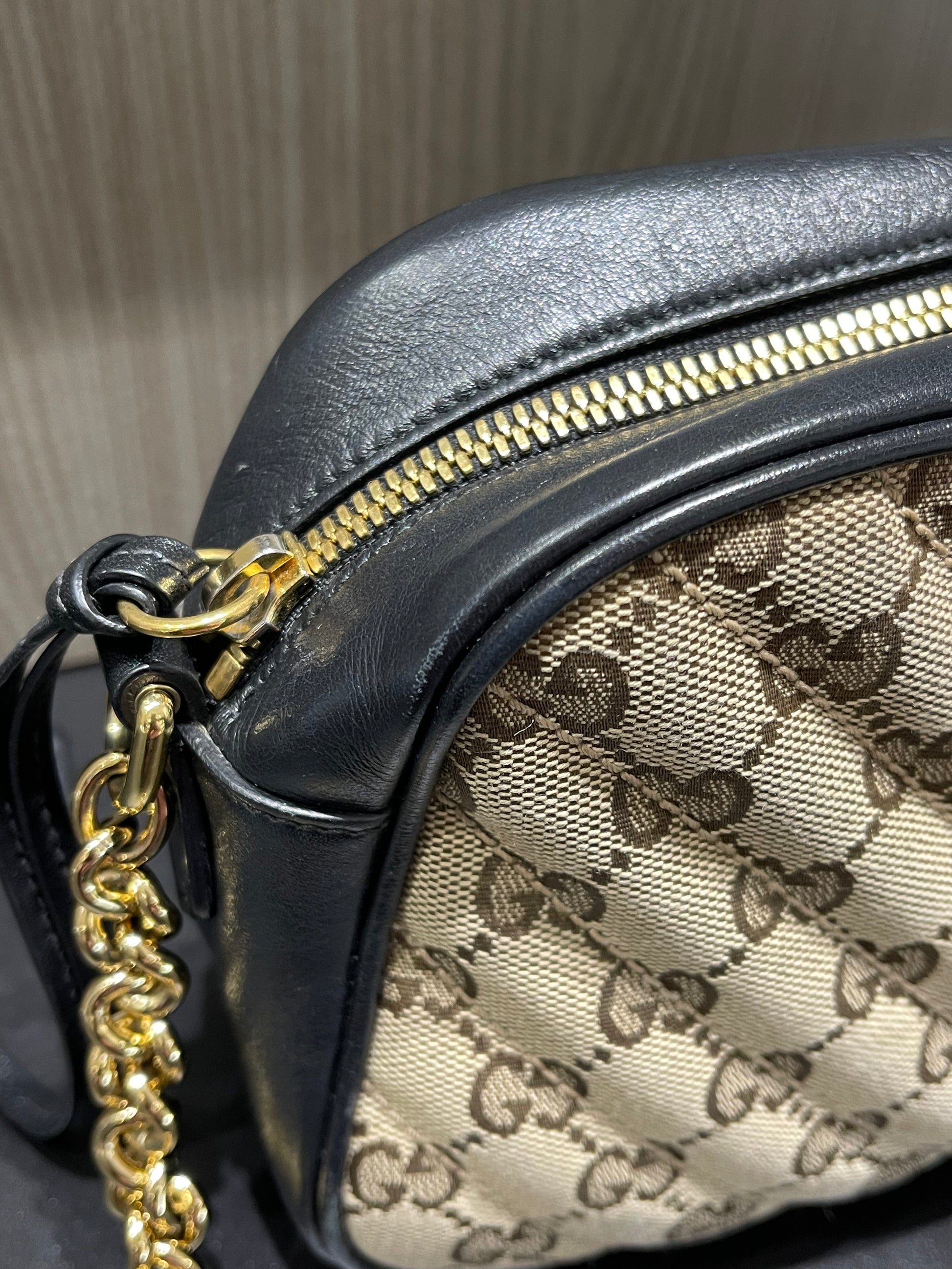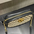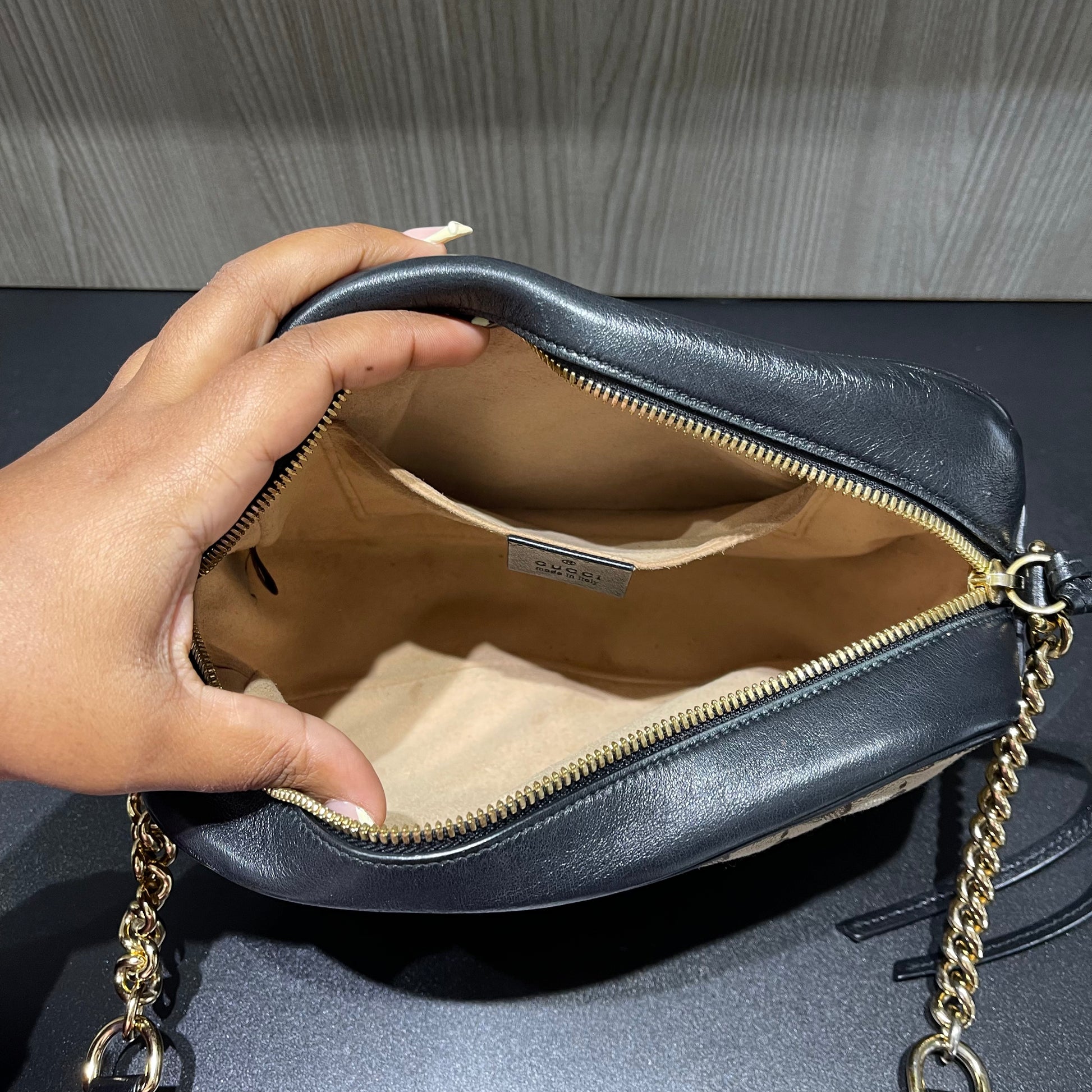 Crafted in iconic GG canvas with black leather trim, this compact and stylish crossbody features the signature Double G logo, gold-tone hardware, and an adjustable leather-and-chain shoulder strap. The top zip closure opens to a soft, suede-like interior with a convenient pocket for essentials—perfect for daily wear or travel.