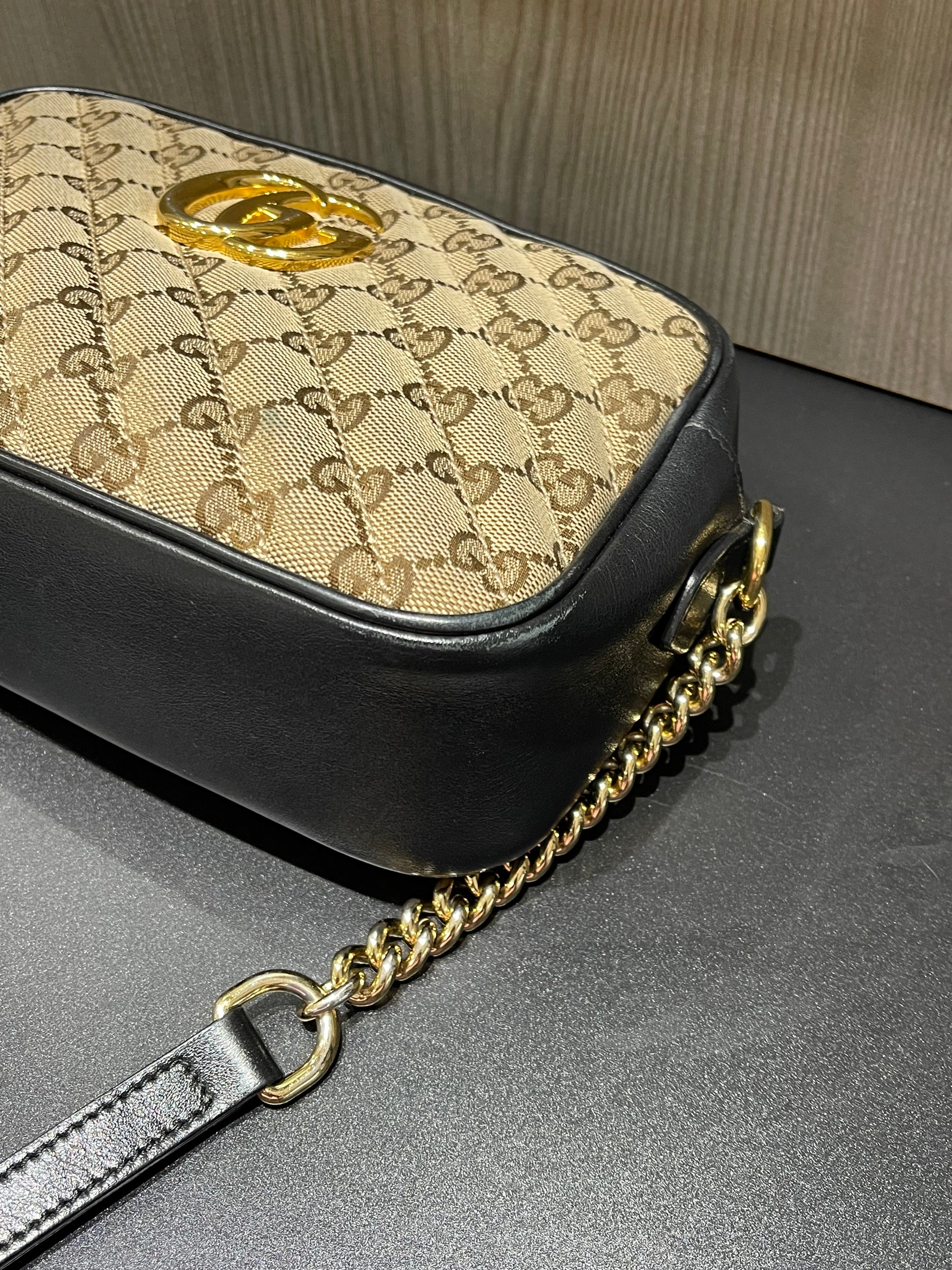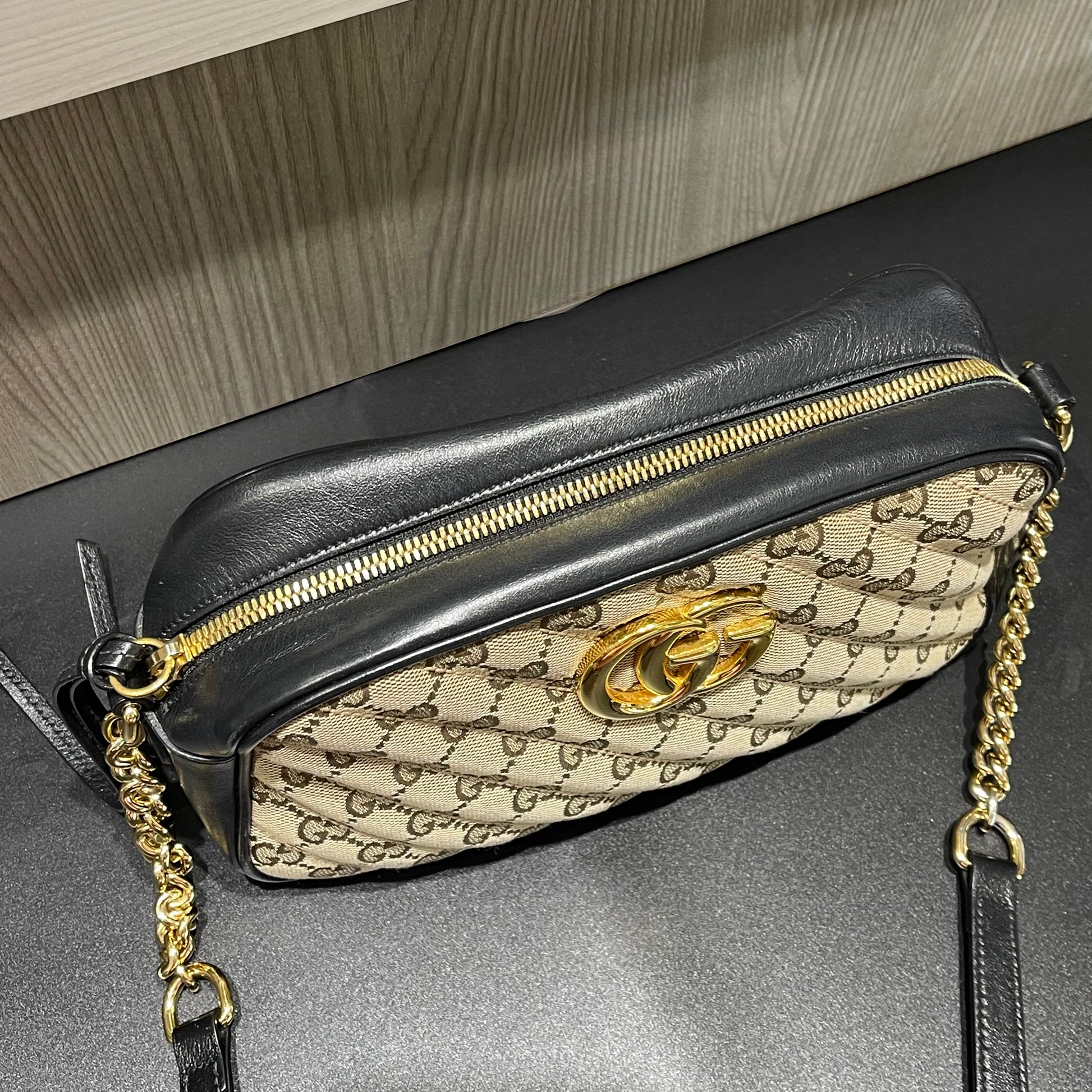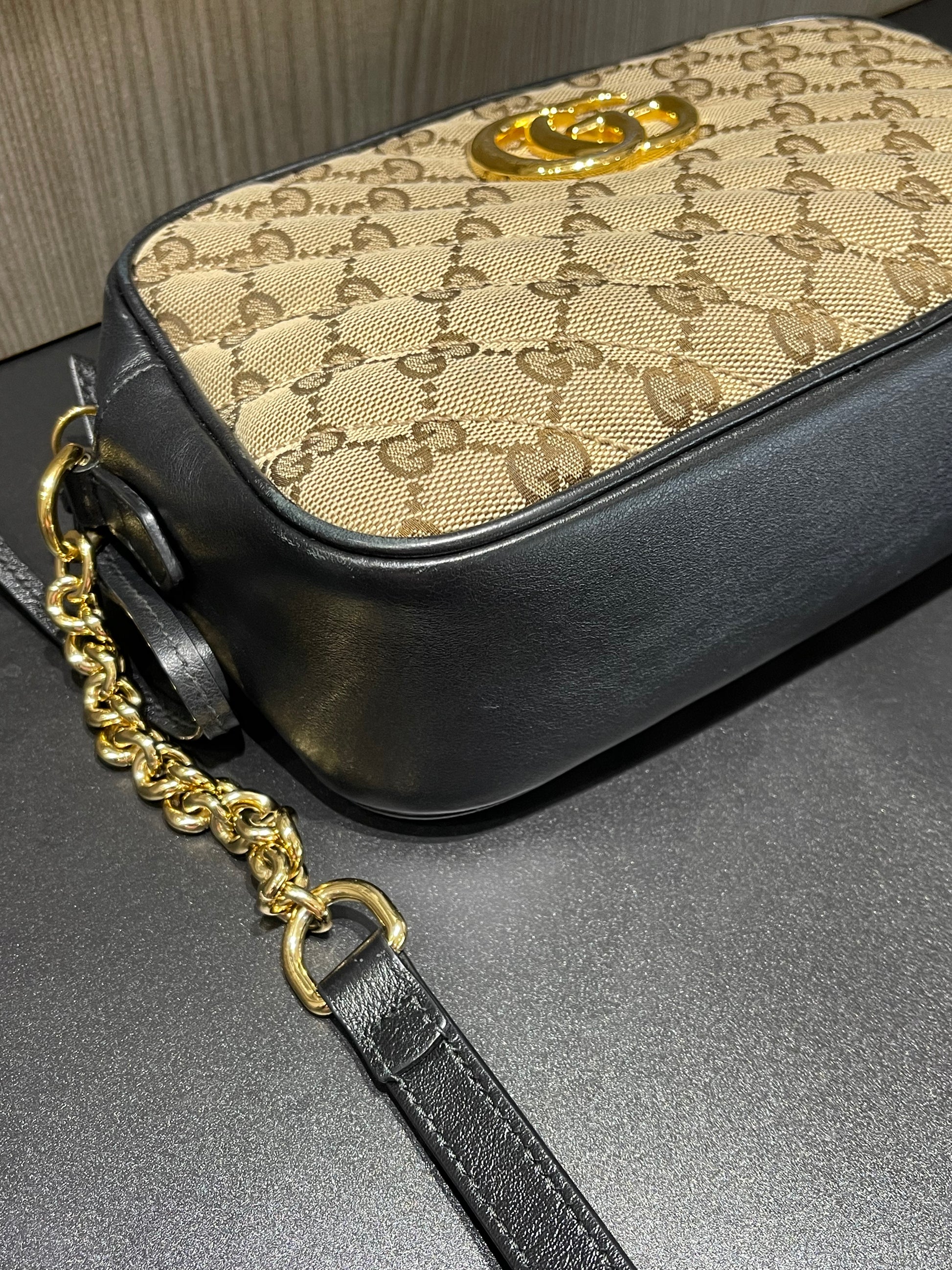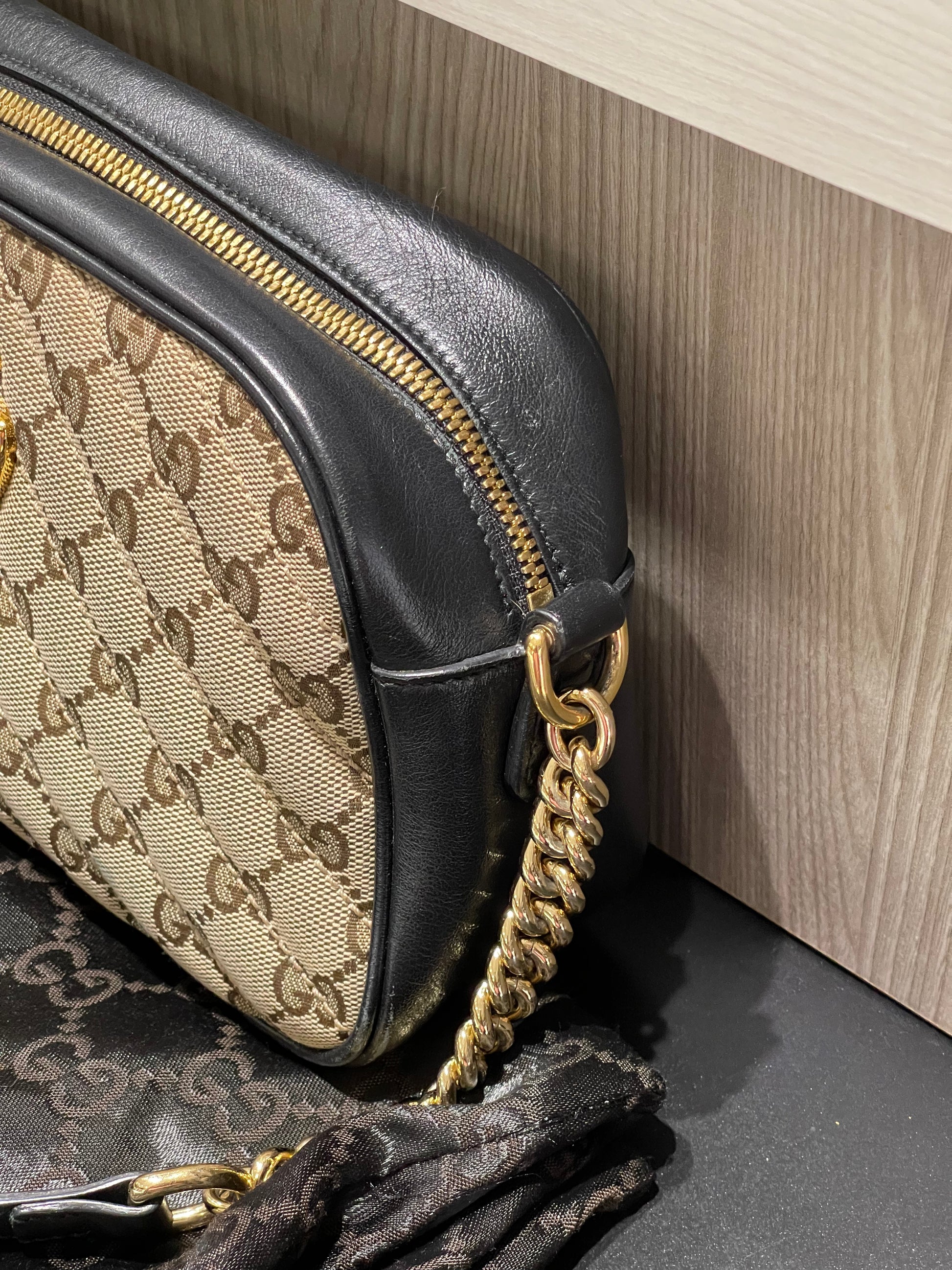 This Gucci Marmont GG Canvas Camera Bag is in very good condition, showing light wear consistent with gentle use. There is scuffing on the leather trim, scratches on the hardware, a relaxed structure, and light marks on the interior fabric. Comes with dustbag (shows minor wear), booklet, and certificate of authenticity.