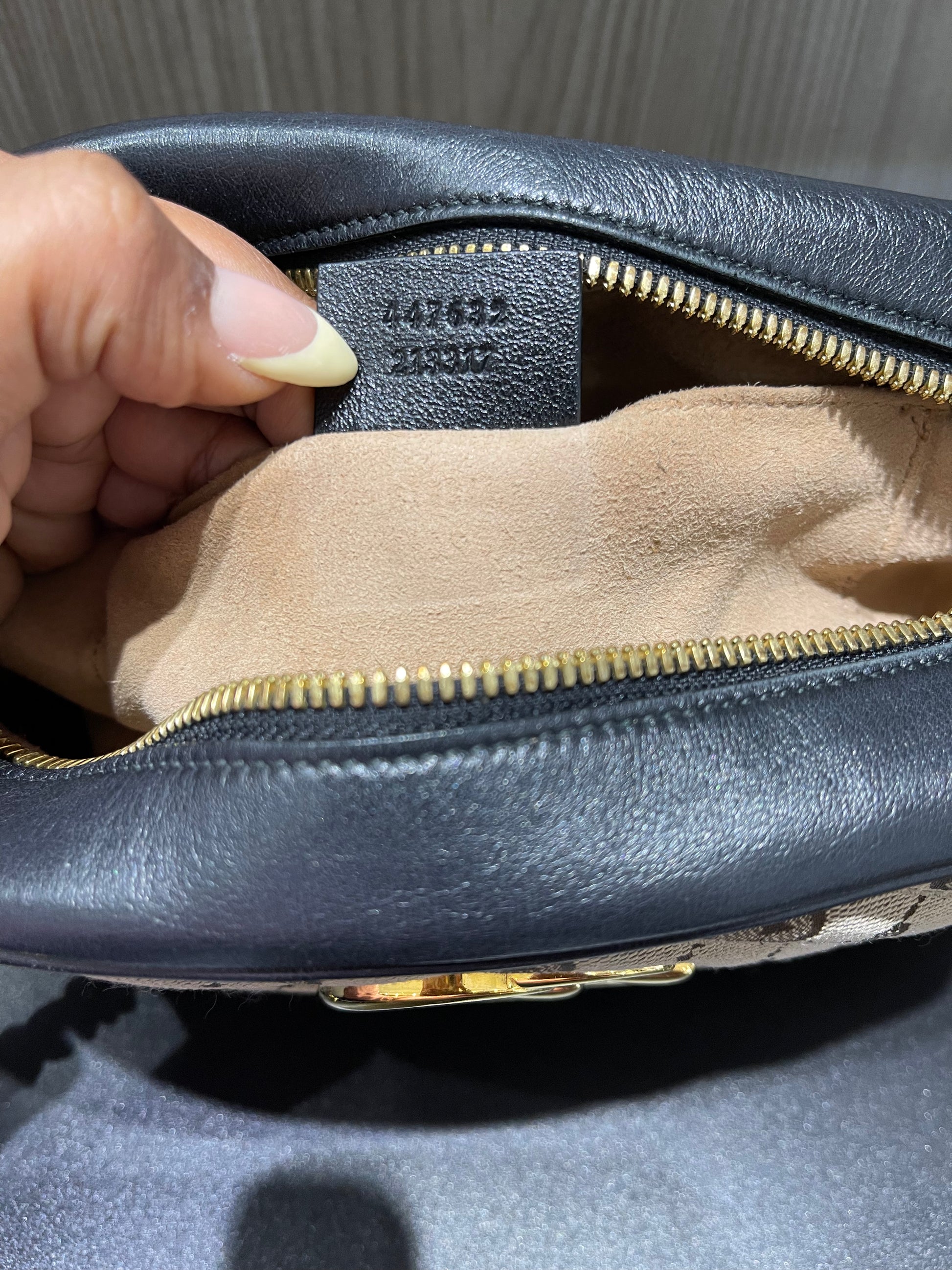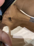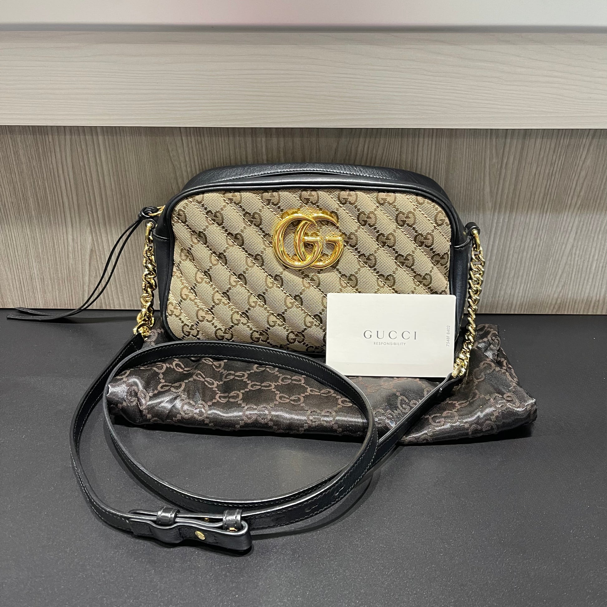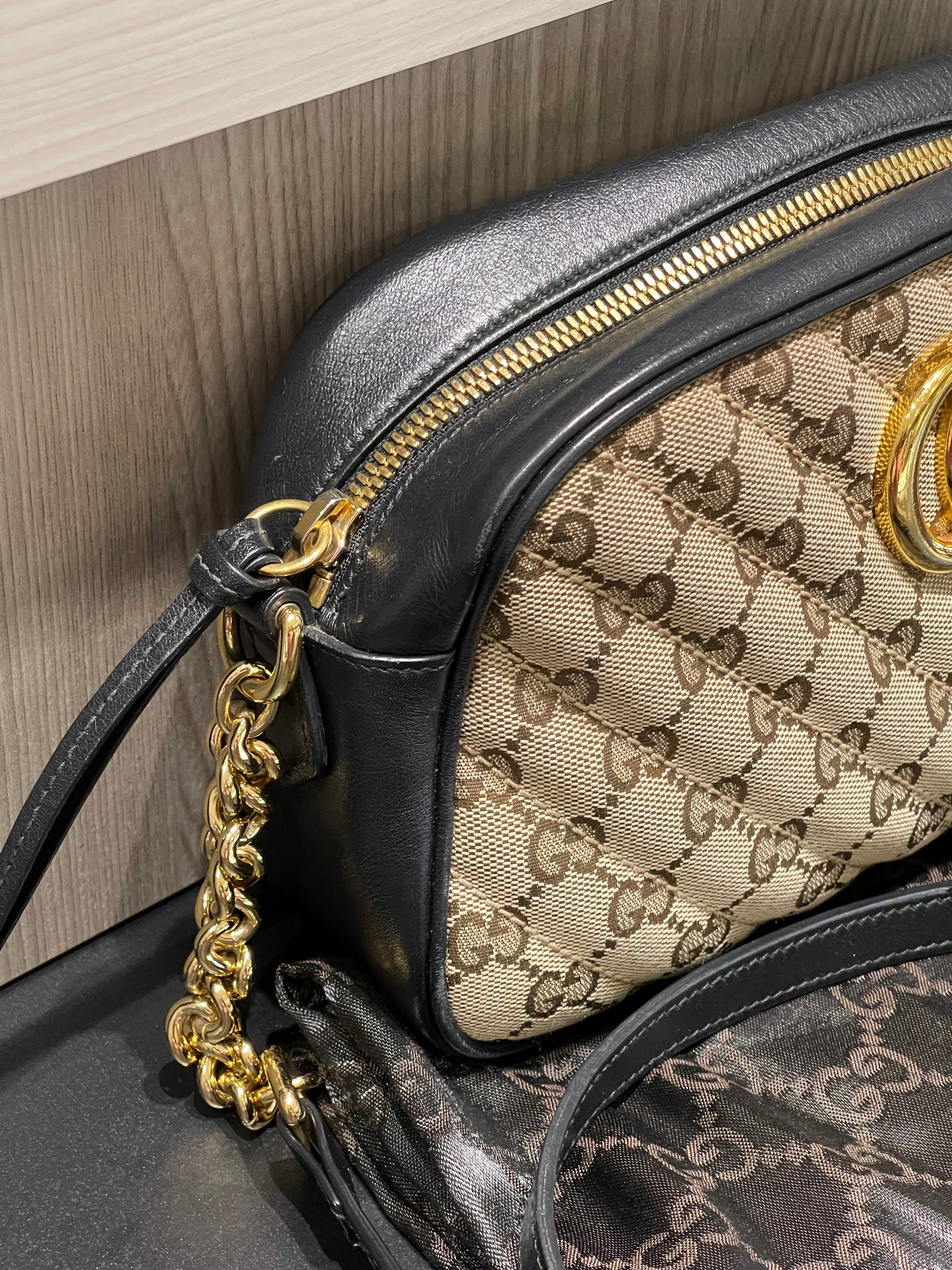 This Gucci Marmont GG Canvas Camera Bag is in very good condition, showing light wear consistent with gentle use. There is scuffing on the leather trim, scratches on the hardware, a relaxed structure, and light marks on the interior fabric. Comes with dustbag (shows minor wear), booklet, and certificate of authenticity.