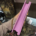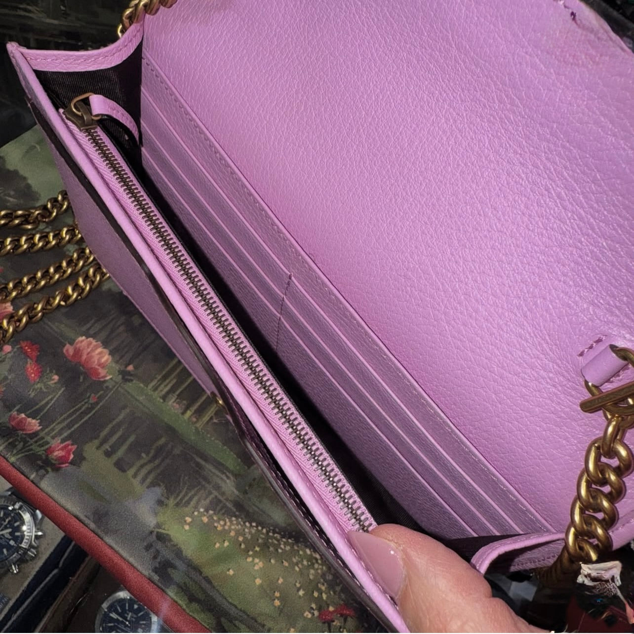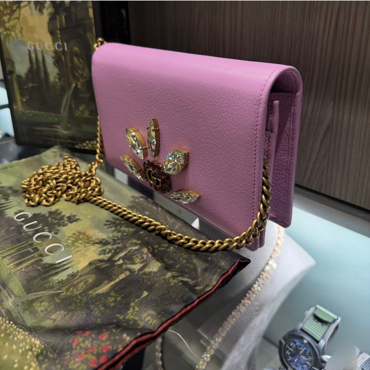 This rare and ultra-feminine Gucci Marmont Marquise Ruby Stones Wallet on Chain adds instant luxury to any look. Crafted from vibrant pink leather, the front flap features the iconic Double G logo adorned with five sparkling marquise-cut crystal stones, creating a standout statement piece. Its structured silhouette and long chain-link strap offer effortless versatility—wear it crossbody or on the shoulder for chic, hands-free elegance.