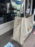 The tote opens with a snap closure to a Ivory canvas-lined interior, offering practical storage with both a zipper pocket and a patch pocket for essentials.