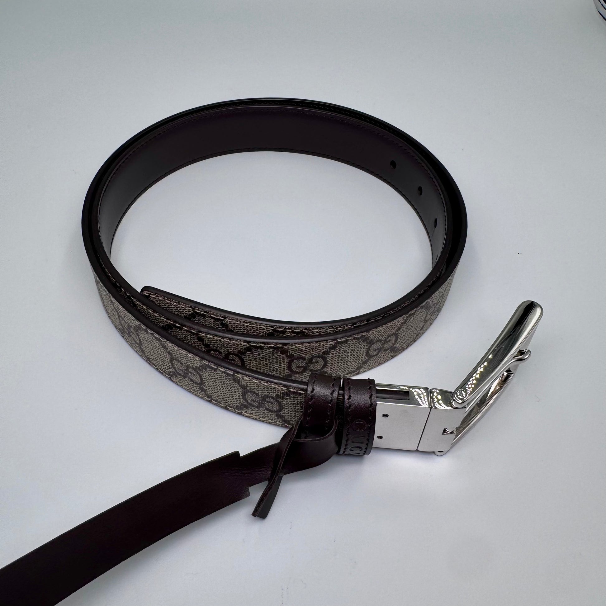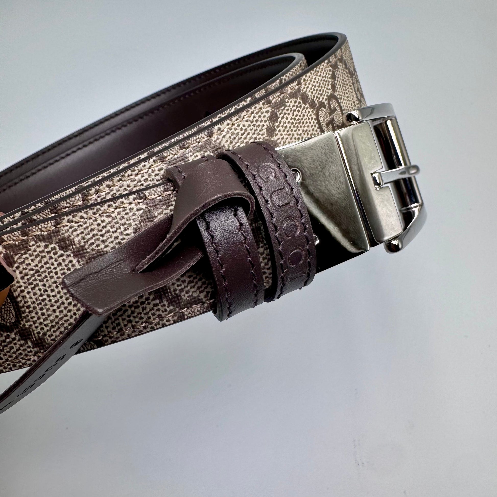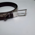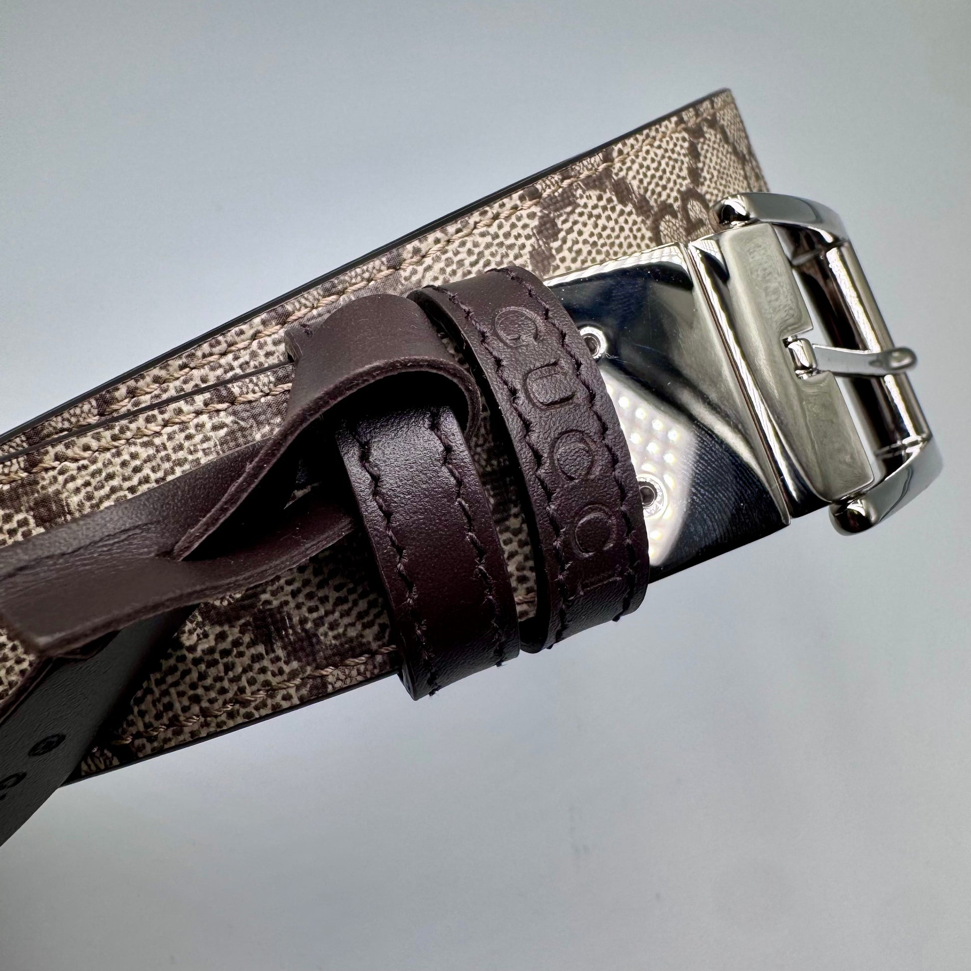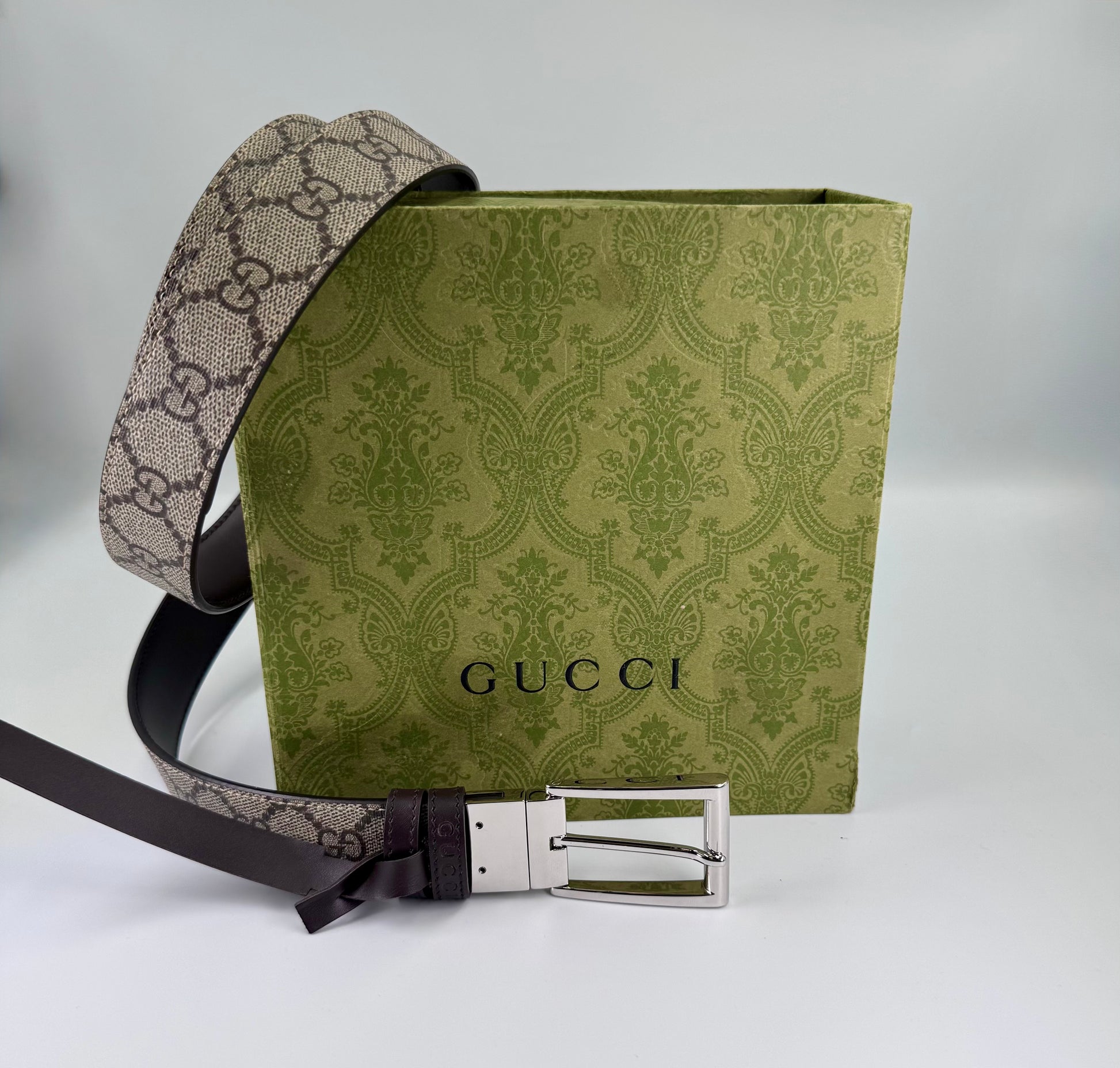 A refined blend of versatility and heritage, this Gucci Reversible Belt (Style 771105) features the House’s signature GG Supreme canvas in beige and dark brown on one side, and smooth brown leather on the reverse. The detachable rectangular buckle, finished in palladium-tone hardware, is engraved with the Gucci logo for a subtle yet elevated touch.