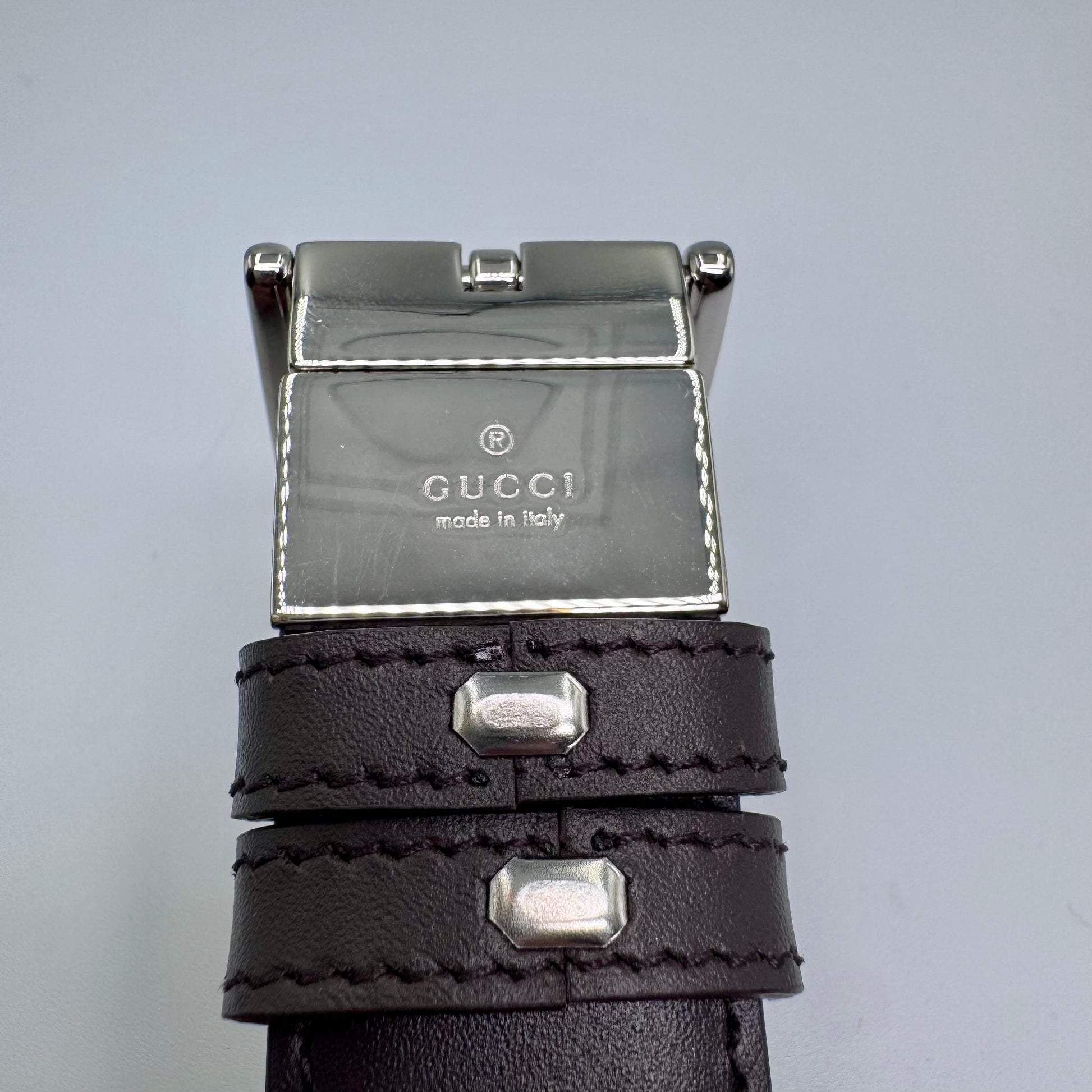Hardware: Palladium-tone rectangular buckle with Gucci engraving